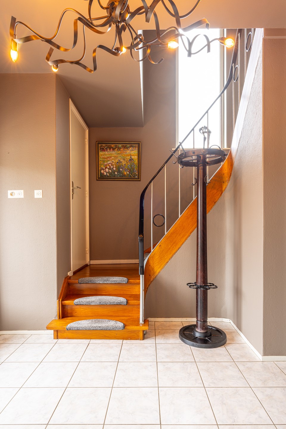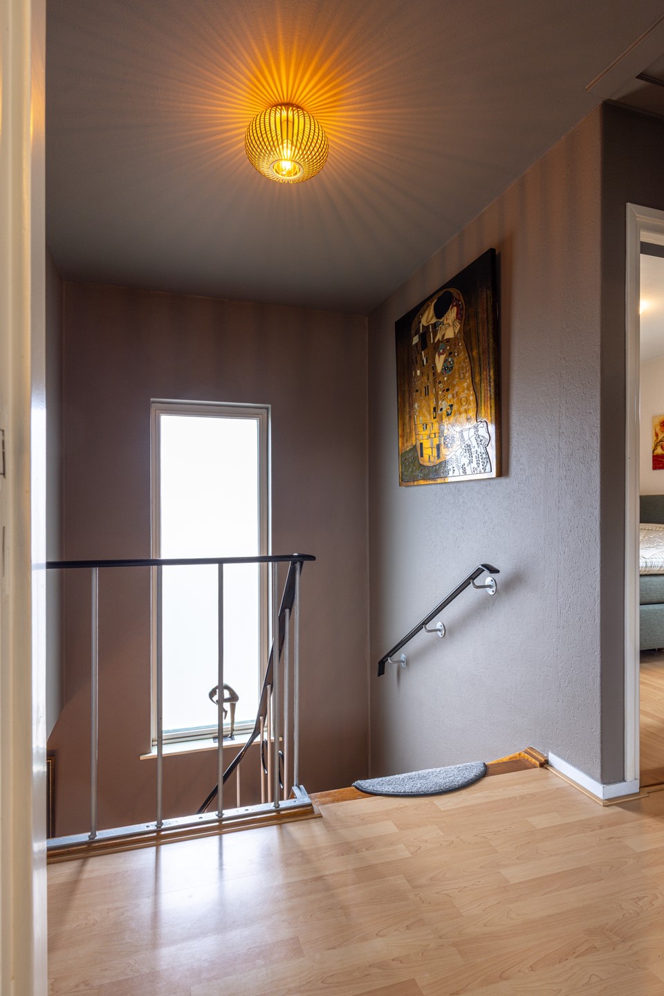Via een houten trap bereik je de eerste verdieping. De overloop is afgewerkt met een laminaatvloer en geeft toegang tot drie slaapkamers, de badkamer en een praktische inbouwkast.