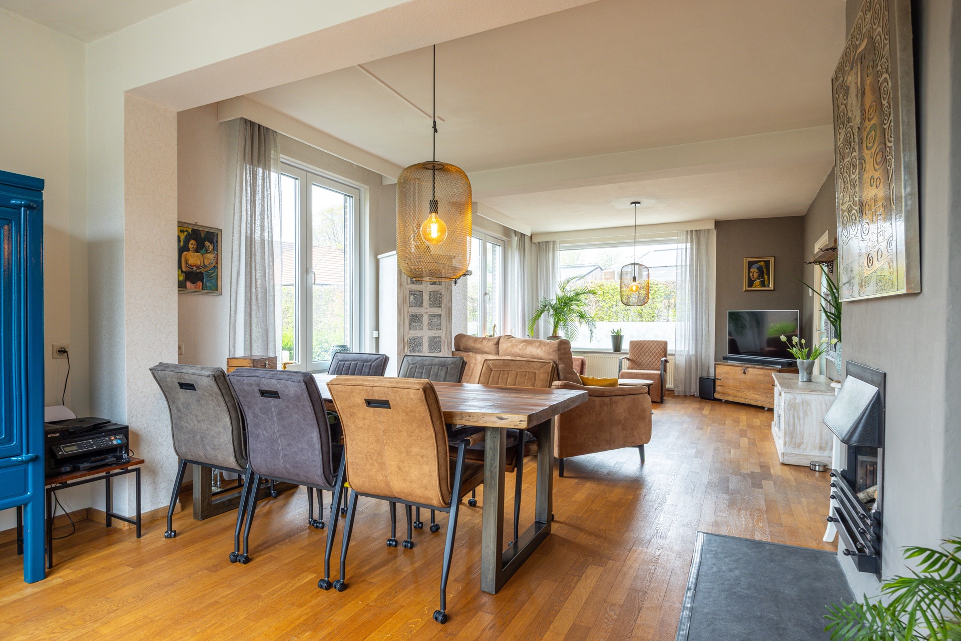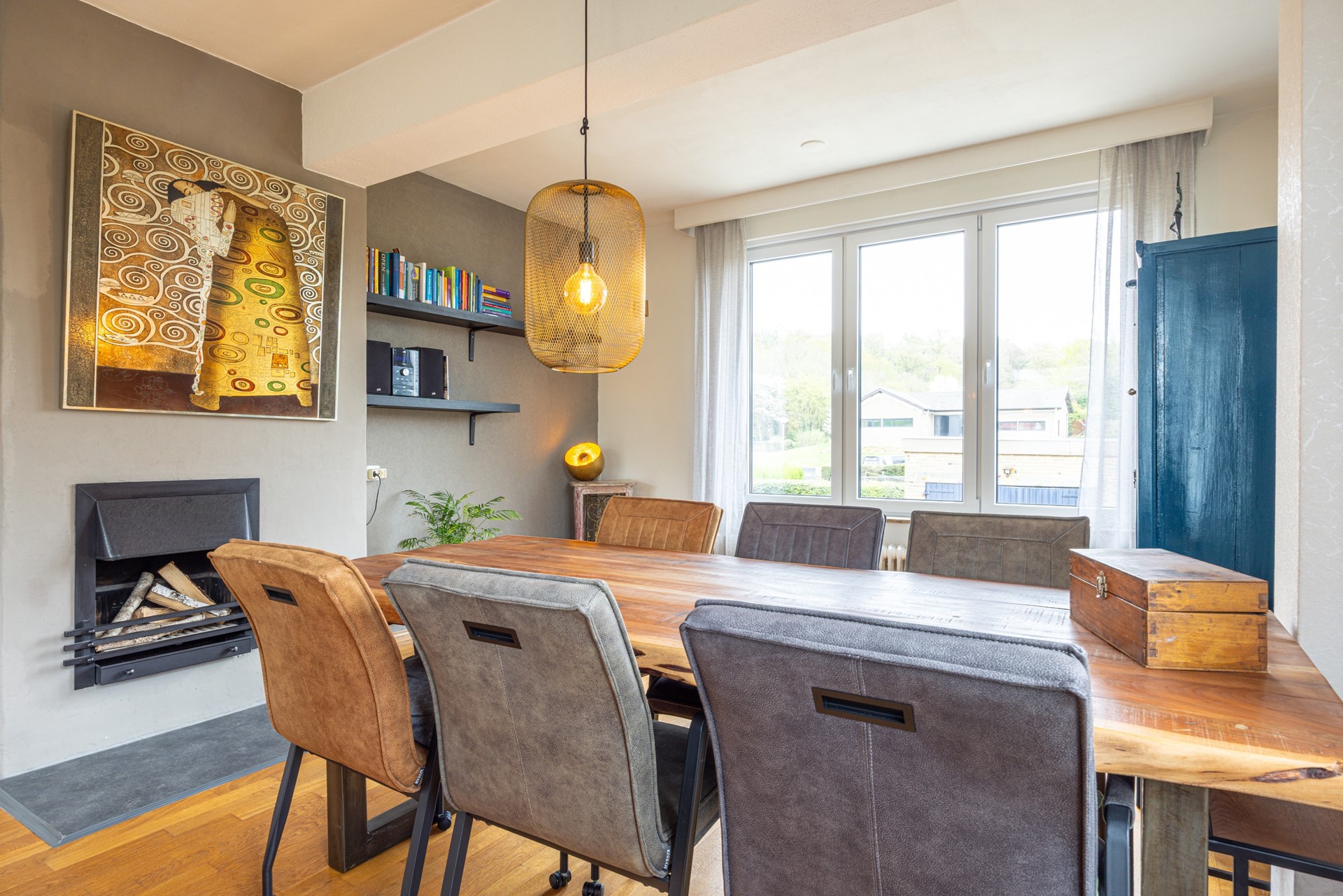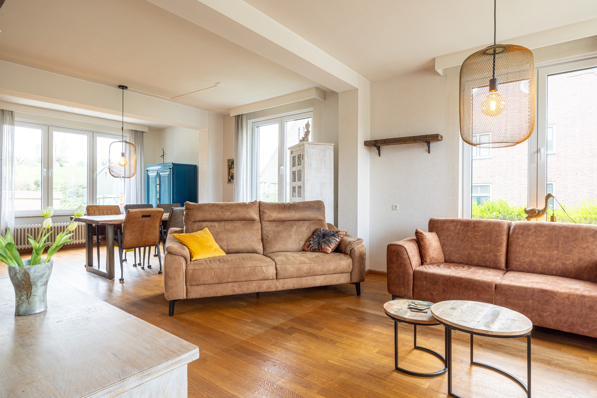 De aanwezige houtkachel zorgt voor extra sfeer en maakt de ruimte ook in de koudere maanden aangenaam. Wat deze woonkamer echt onderscheidt, is de ligging aan de achterzijde. Vanuit hier kijk je vrij weg over het achtergelegen groen, zonder directe bebouwing. Dit uitzicht zorgt voor rust en geeft de ruimte een open karakter. Daarnaast is de woonkamer voorzien van elektrische rolluiken.