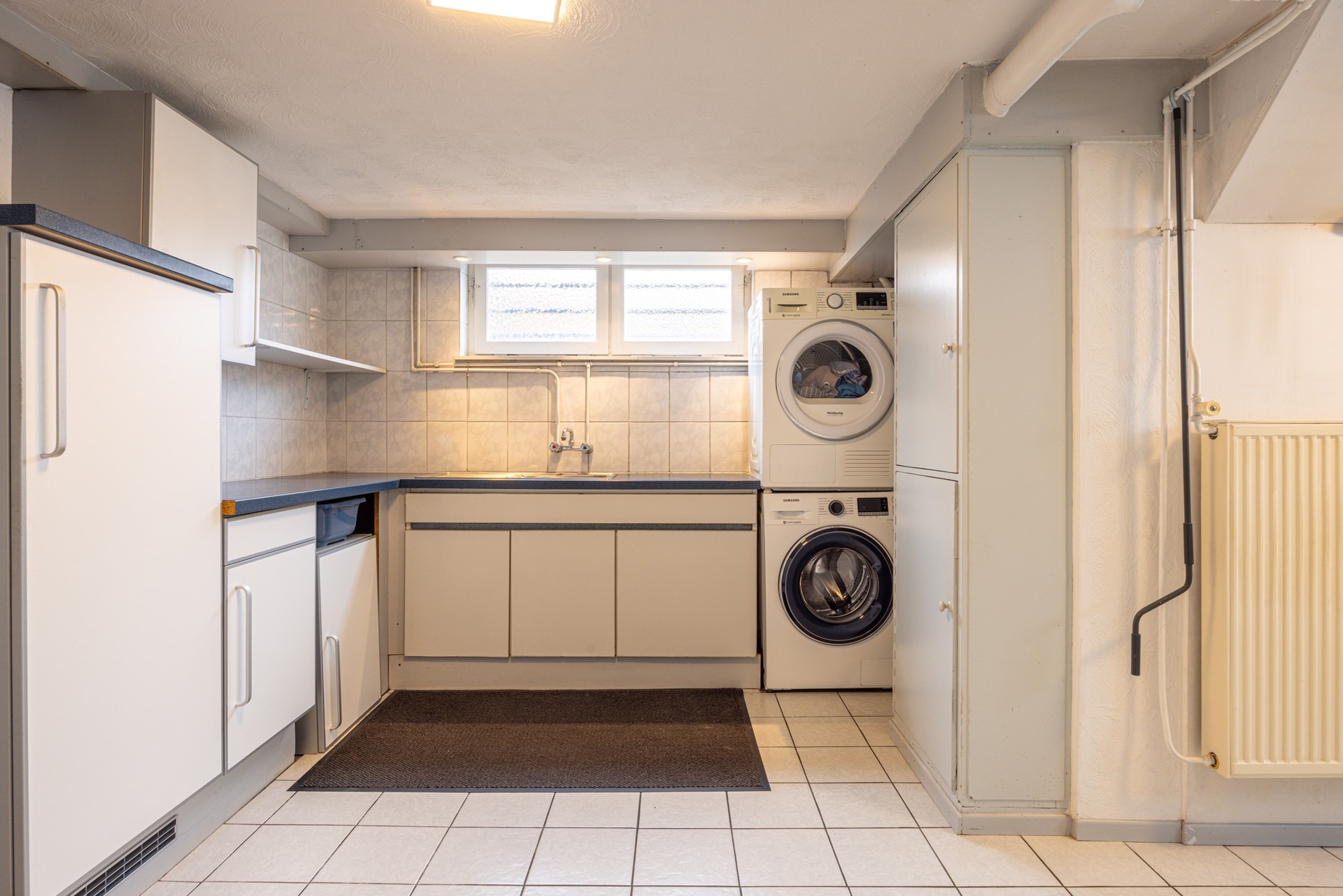 De kelder is praktisch ingedeeld en bestaat uit meerdere ruimtes. De bijkeuken is voorzien van een keukenblok met kastruimte, een spoelbak en een koelkast. Hier bevinden zich tevens de witgoedaansluitingen en de meterkast.