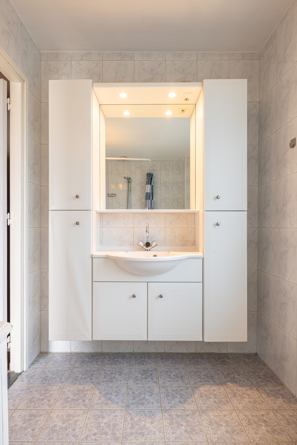 De badkamer is functioneel ingericht met een douchebak, toilet en een badkamermeubel met wastafel, spiegel en kastruimte.