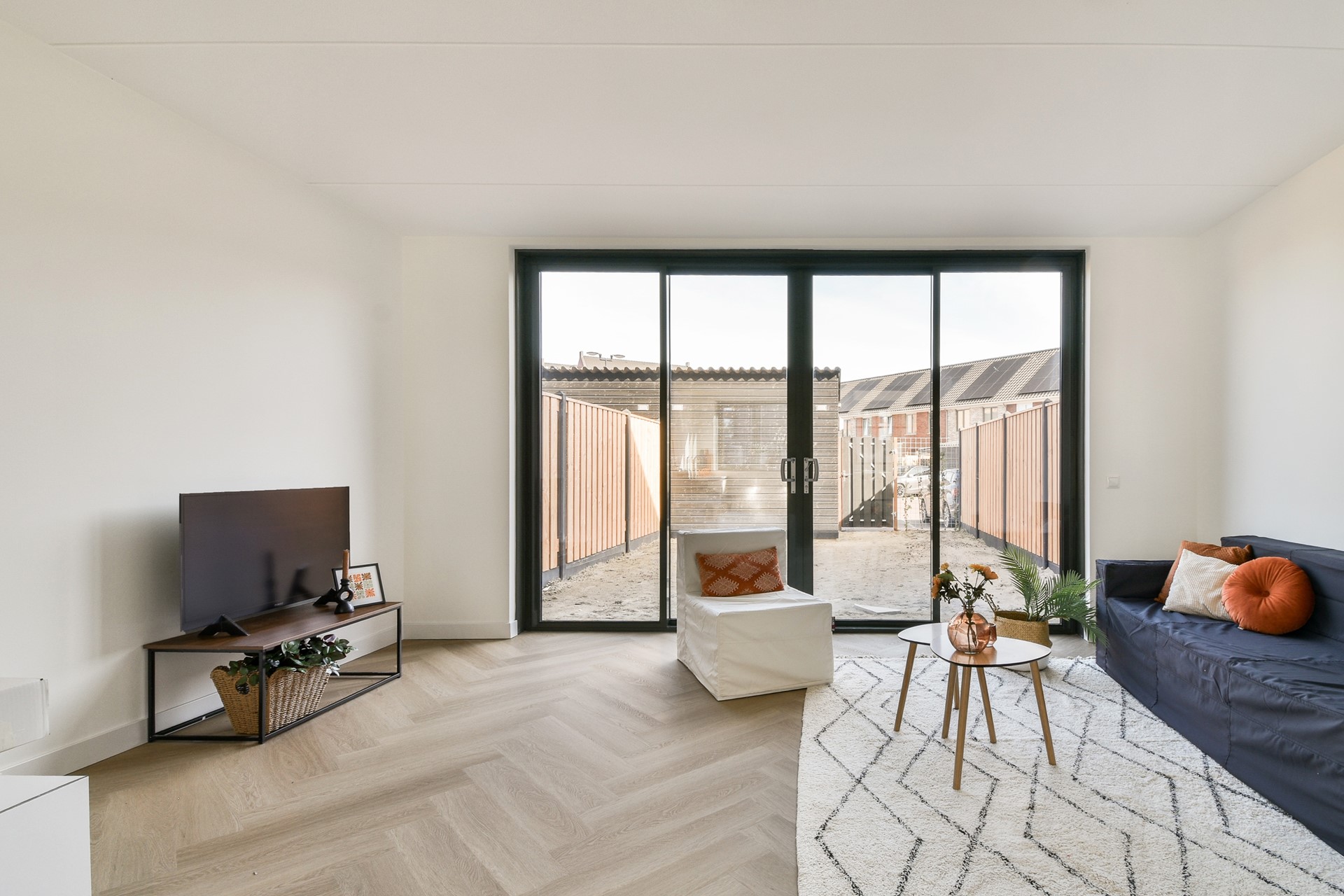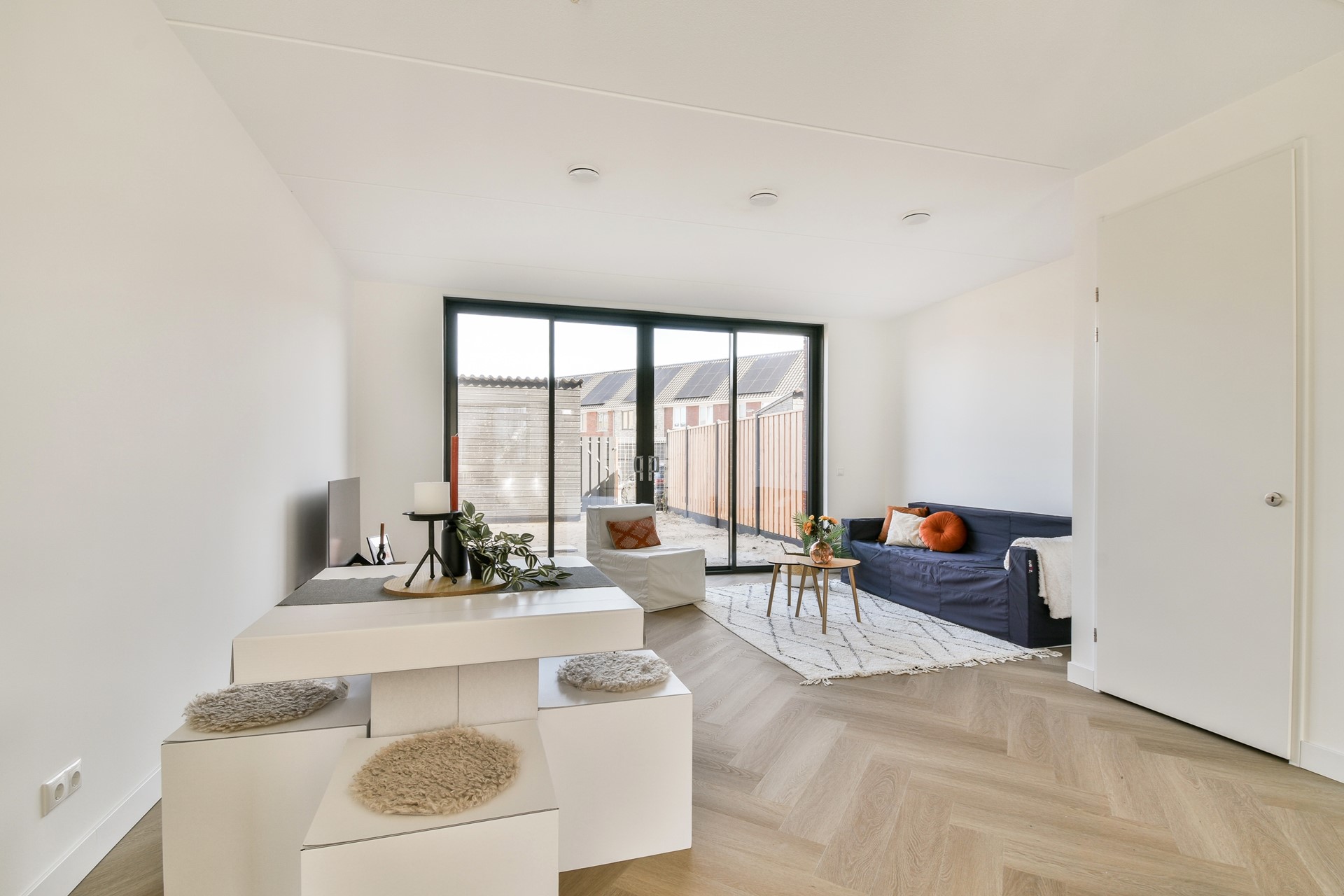 De ruime, tuingerichte woonkamer beschikt over grote raampartijen die zorgen voor een overvloed aan daglicht. Dankzij de rechte indeling is er volop ruimte voor zowel een gezellige zithoek als een royale eettafel. De strakke afwerking en nieuwe materialen geven de woonkamer een frisse en eigentijdse uitstraling.