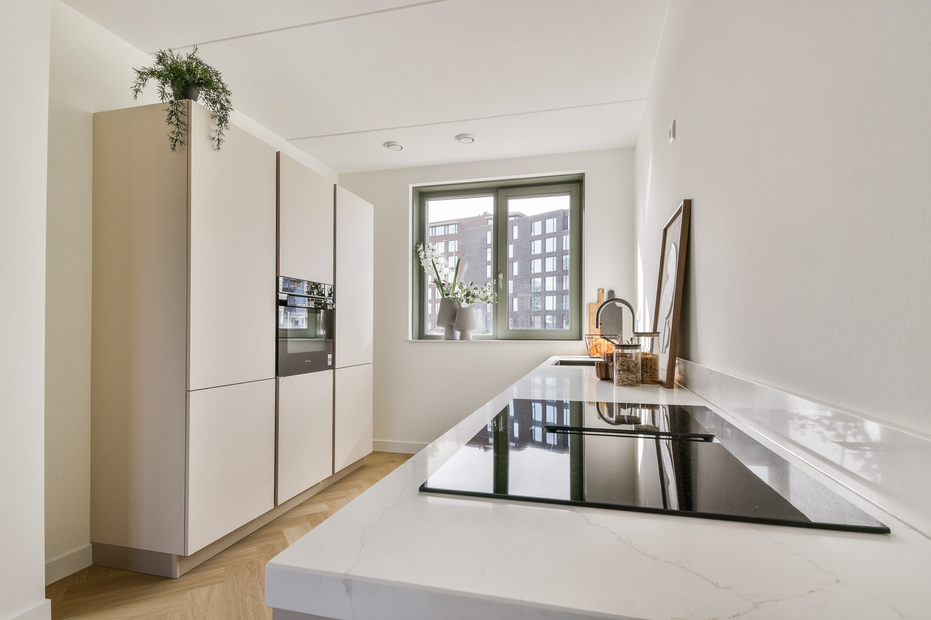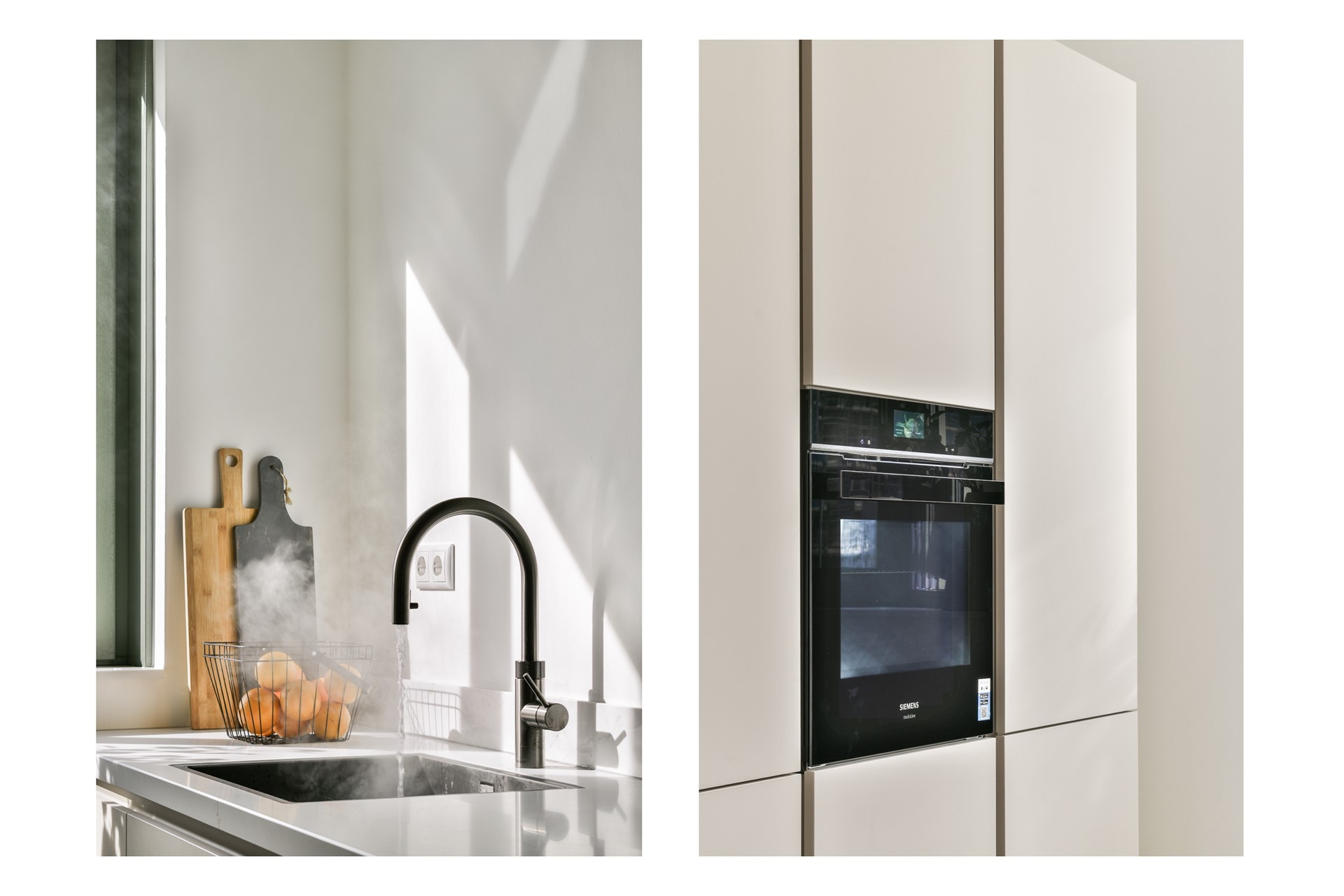 Aan de voorzijde van de woning bevindt zich de nieuwe open keuken, uitgevoerd in moderne stijl en voorzien van een complete set ongebruikte Siemens inbouwapparatuur: een inductiekookplaat met ingebouwde afzuiginstallatie, een vaatwasser, een koelkast, een combi-magnetron, én een Quooker voor direct kokend water.