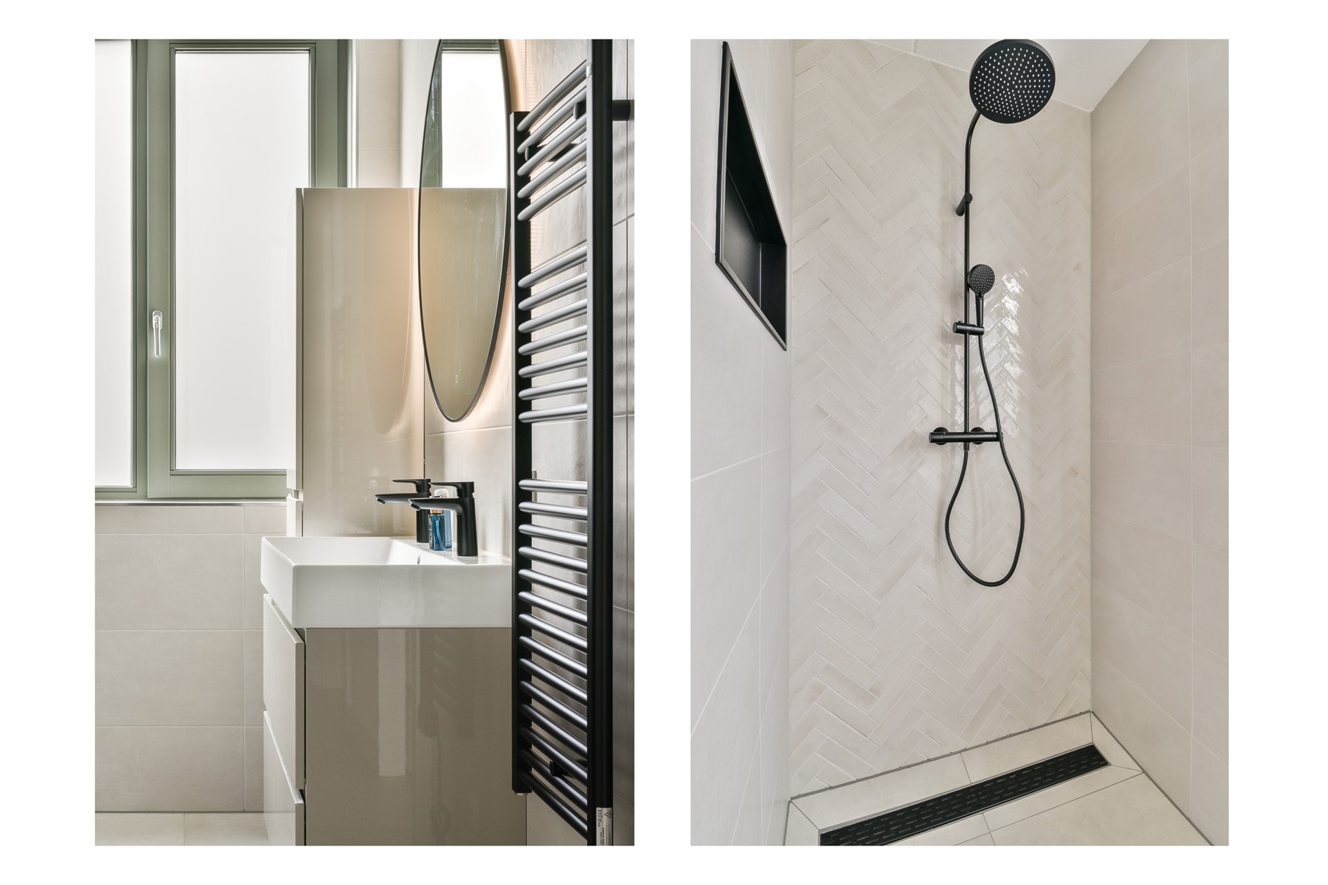 Op de eerste verdieping bevinden zich meerdere slaapkamers, stuk voor stuk strak afgewerkt en volledig nieuw. De moderne badkamer is eveneens ongebruikt en ingericht met een ruime inloopdouche, een stijlvol wastafelmeubel en een tweede toilet. Alles is tot in de puntjes verzorgd en klaar voor de eerste bewoners.