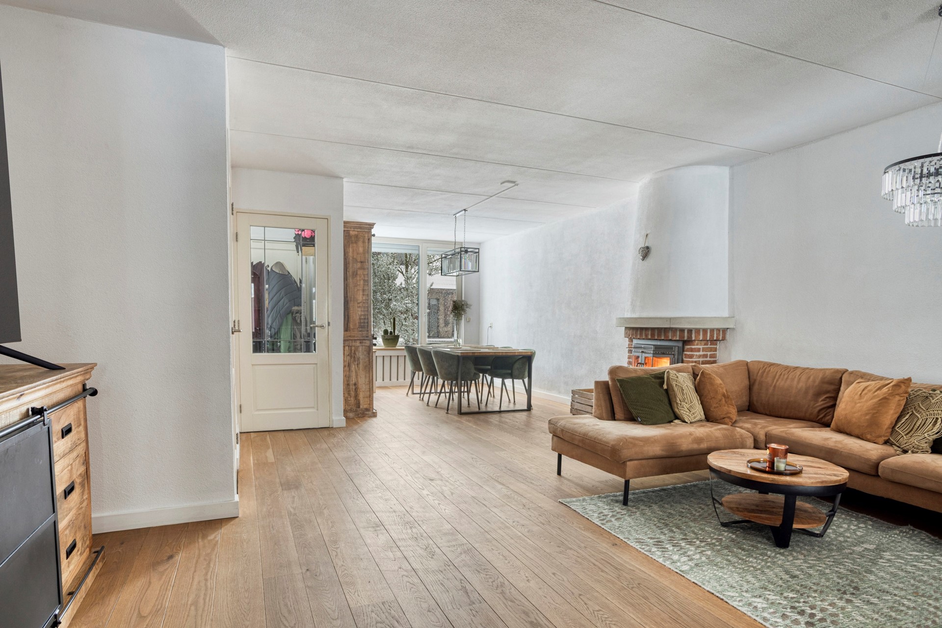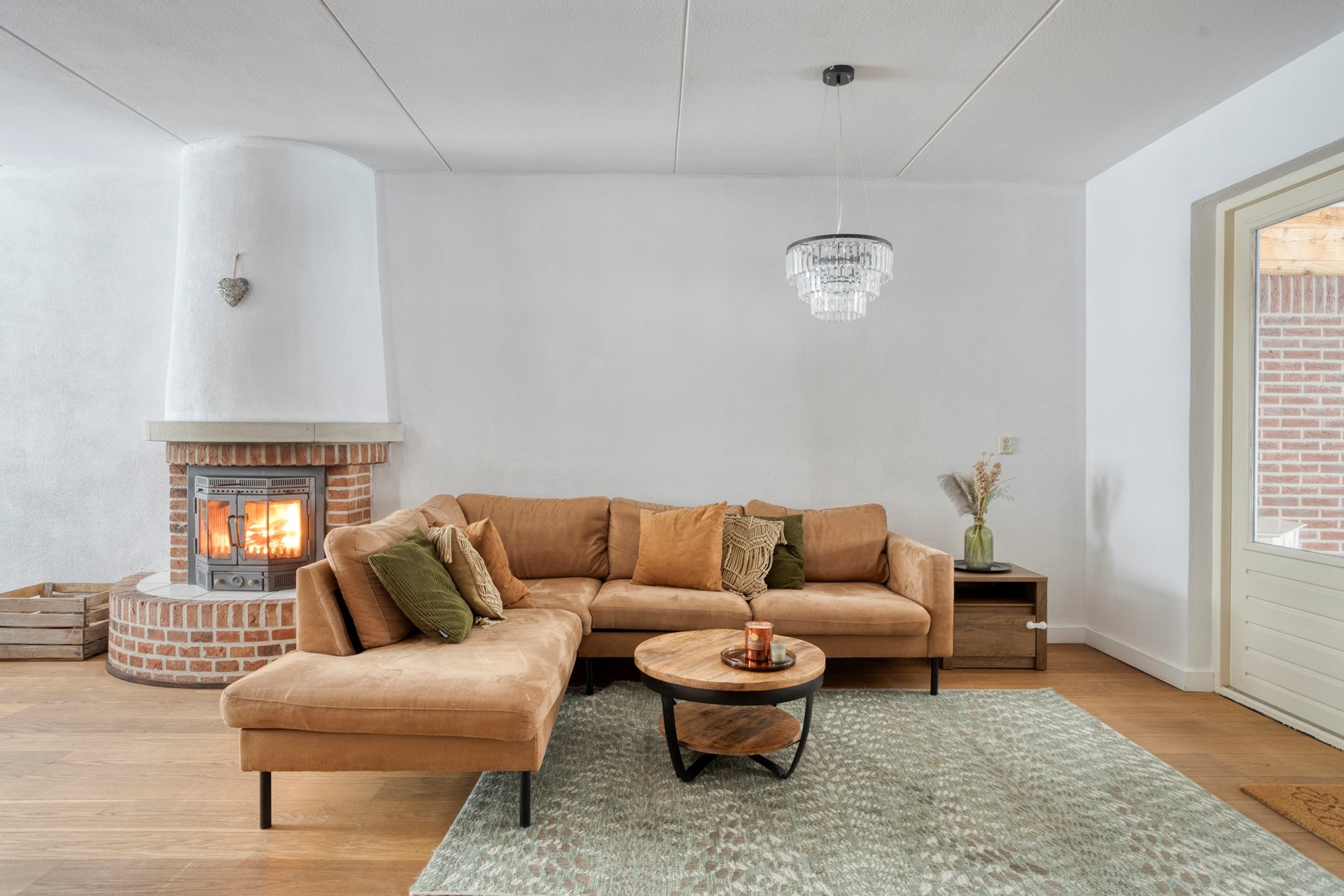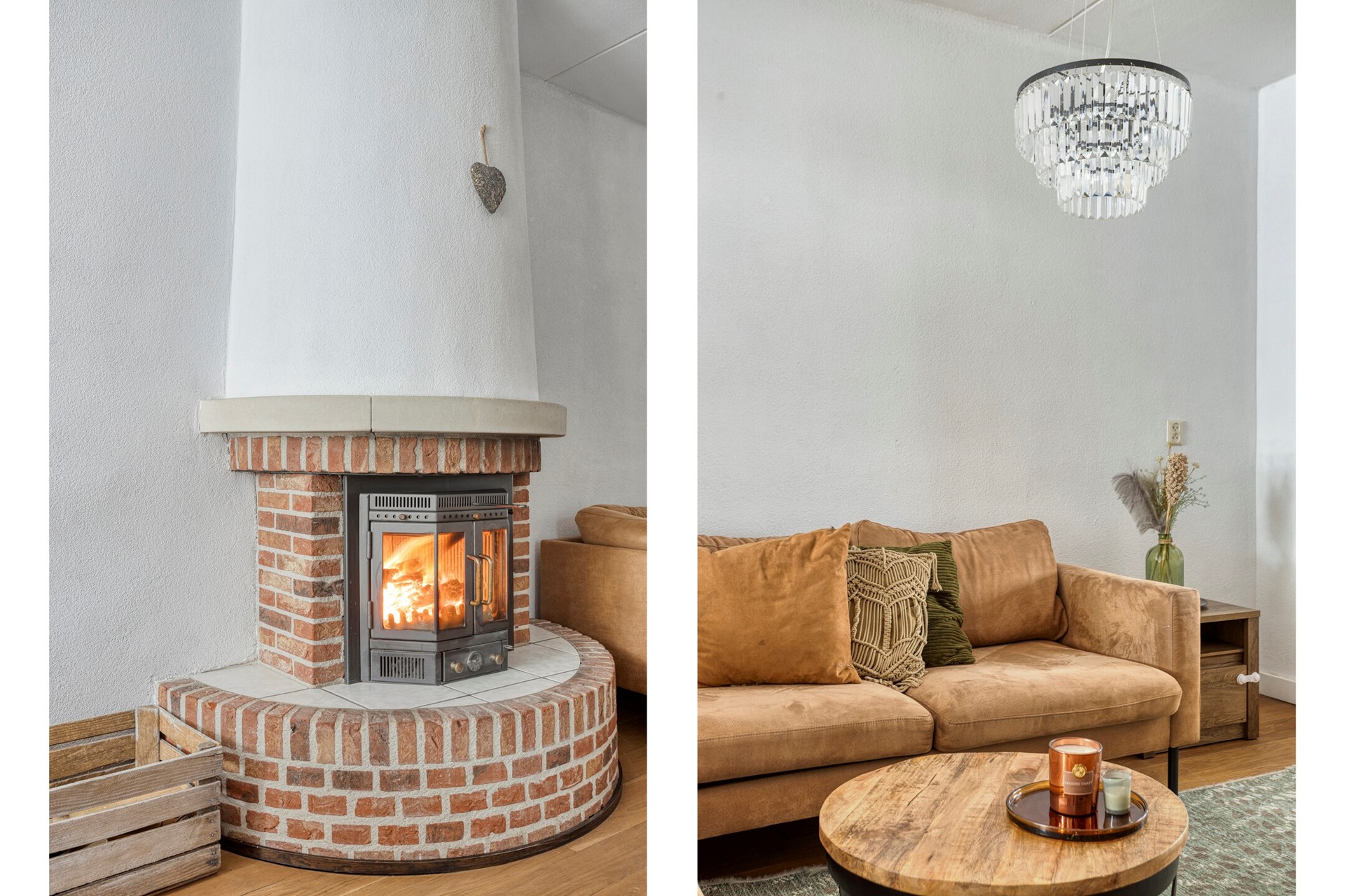 De sfeervolle woonkamer beschikt over fraaie eikenhouten vloerdelen en wordt extra gezellig gemaakt door de schouw met houtkachel. Praktisch is de vaste kast onder de trap. Dankzij de openslaande tuindeuren sta je in direct contact met de tuin en de royale veranda – een heerlijke plek om binnen en buiten met elkaar te verbinden.