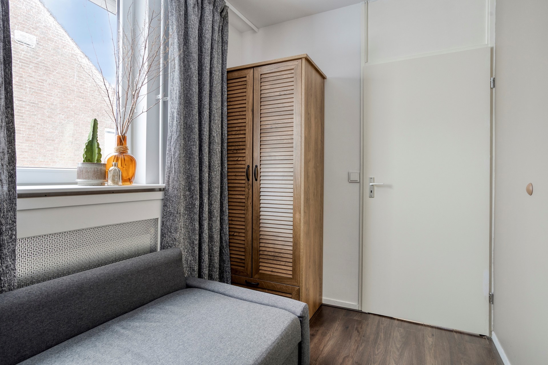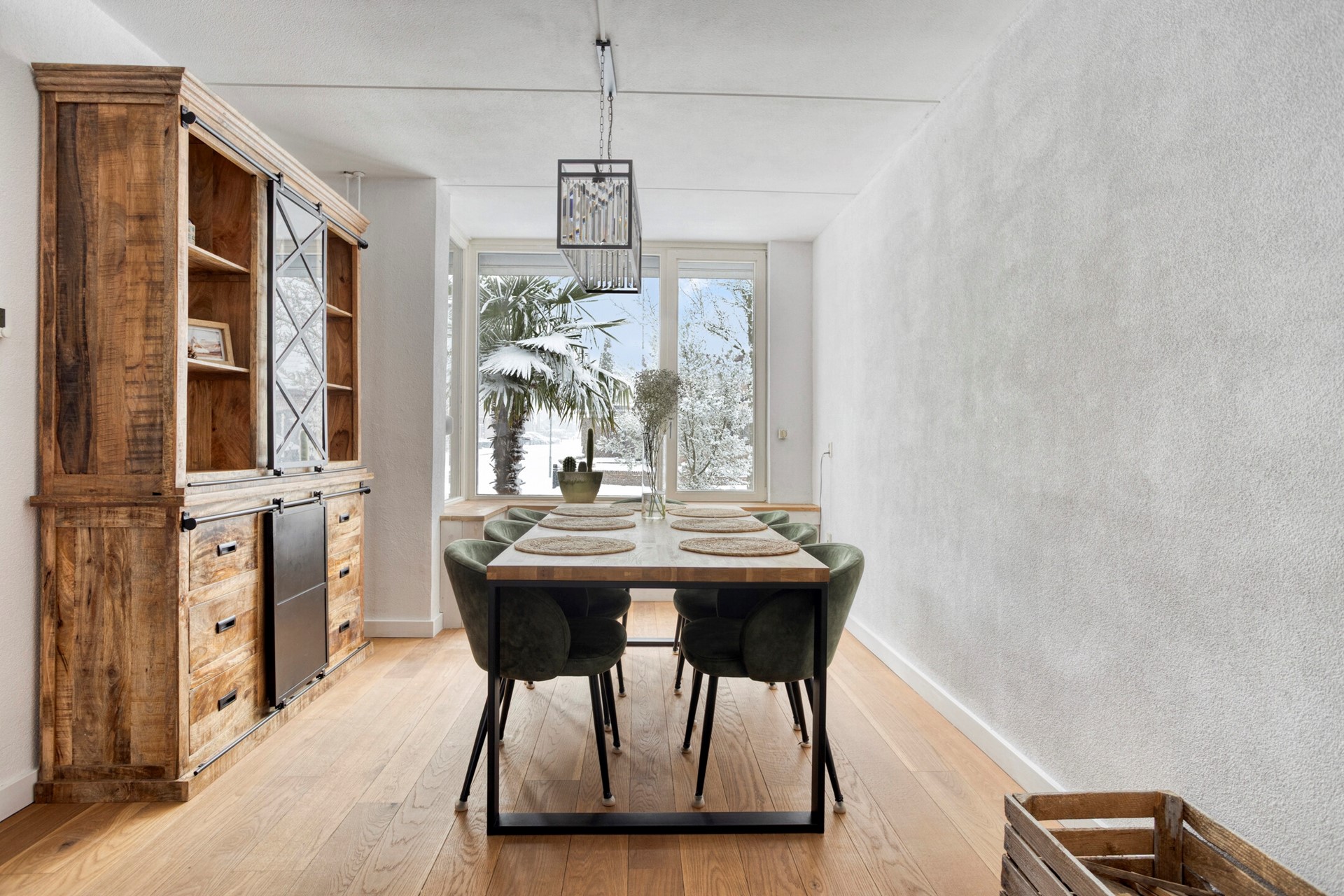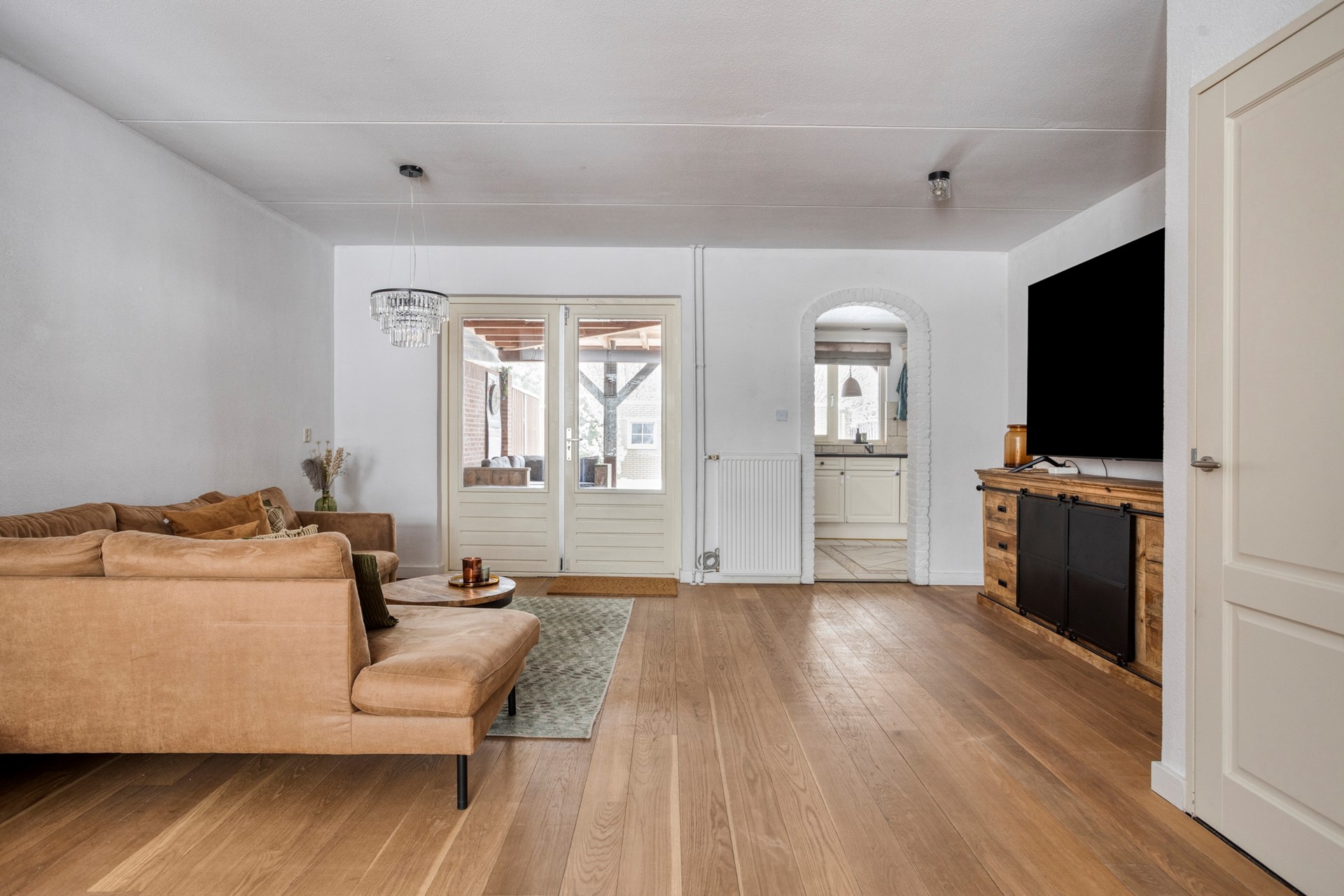 De sfeervolle woonkamer beschikt over fraaie eikenhouten vloerdelen en wordt extra gezellig gemaakt door de schouw met houtkachel. Praktisch is de vaste kast onder de trap. Dankzij de openslaande tuindeuren sta je in direct contact met de tuin en de royale veranda – een heerlijke plek om binnen en buiten met elkaar te verbinden.