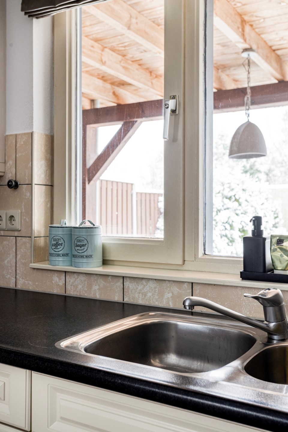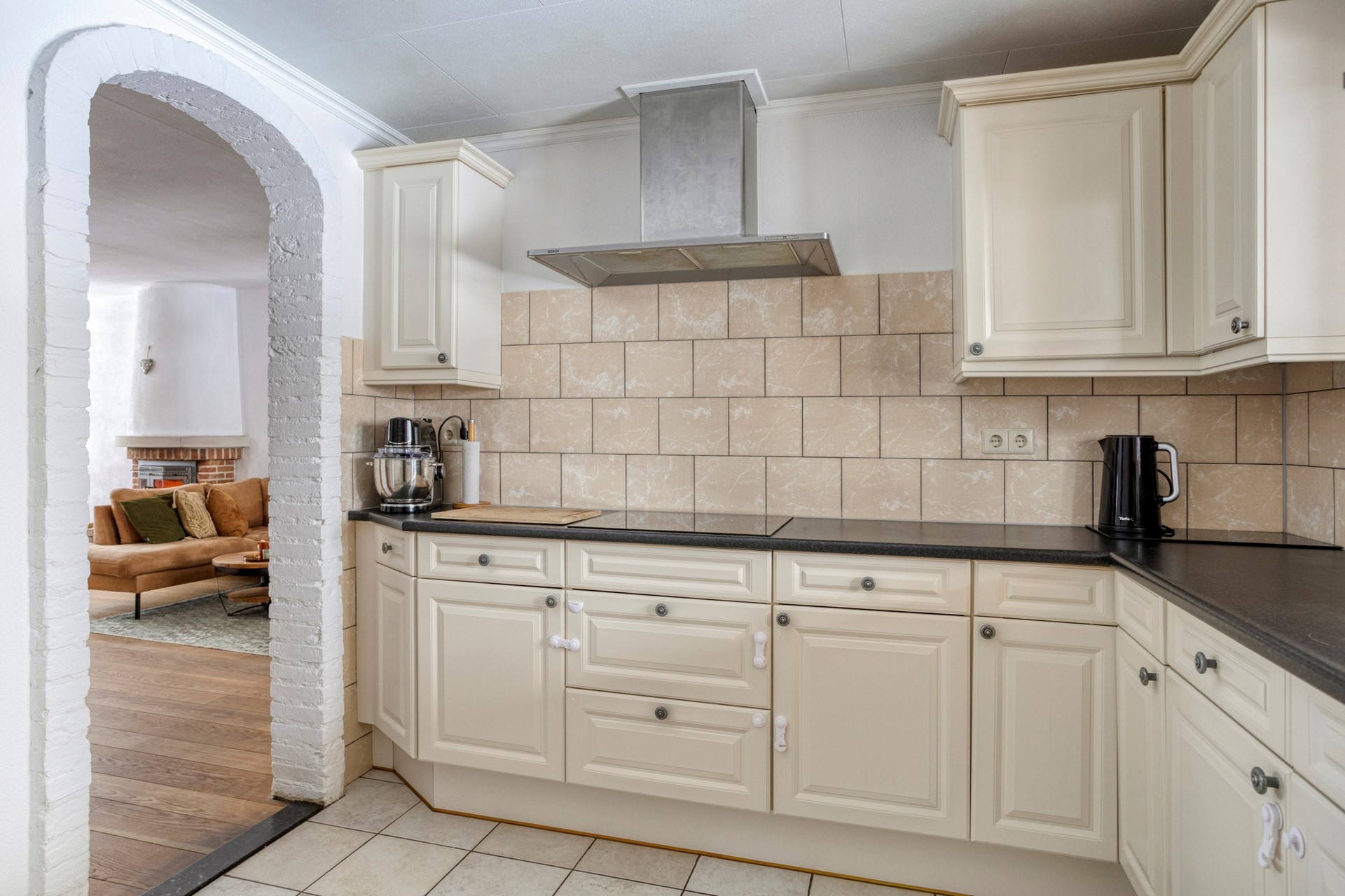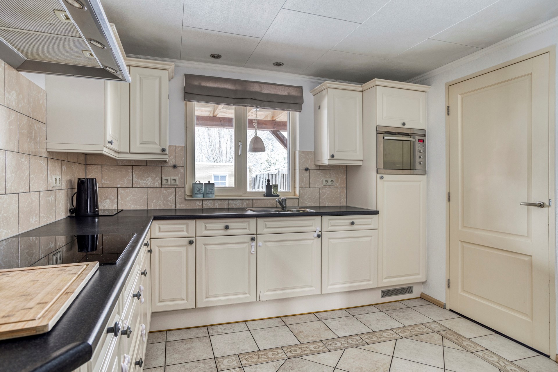 De uitgebouwde keuken is licht en functioneel ingericht met een hoekopstelling en voorzien van diverse inbouwapparatuur, waaronder een elektrische kookplaat, afzuigkap, koelkast, vaatwasser en een combi-magnetron. Inbouwspots zorgen voor prettige verlichting en maken het geheel compleet.
