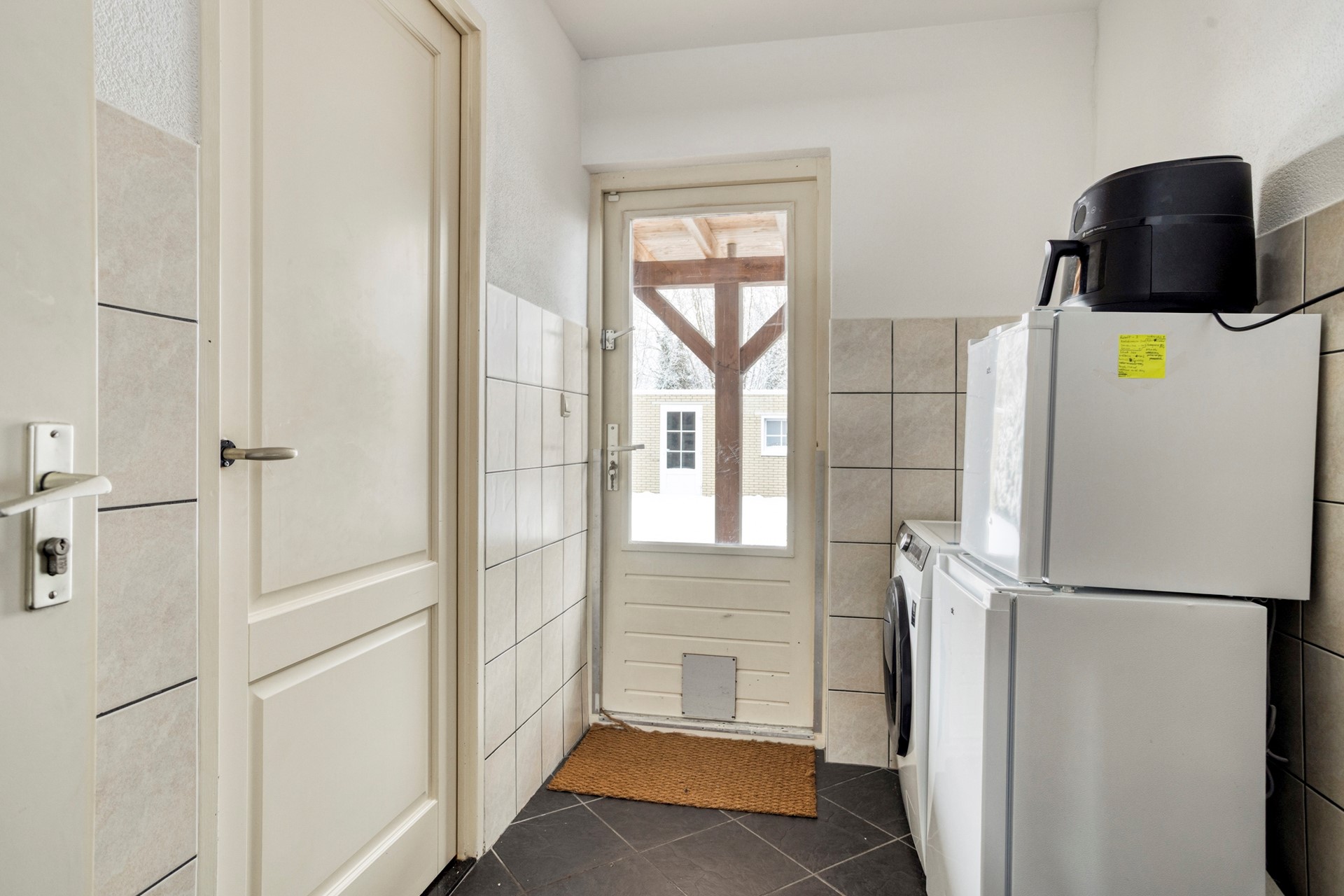 Aansluitend bevindt zich de bijkeuken met wasmachineaansluiting en toegang tot zowel de tuin als de garage – ideaal voor extra bergruimte en dagelijks gemak.