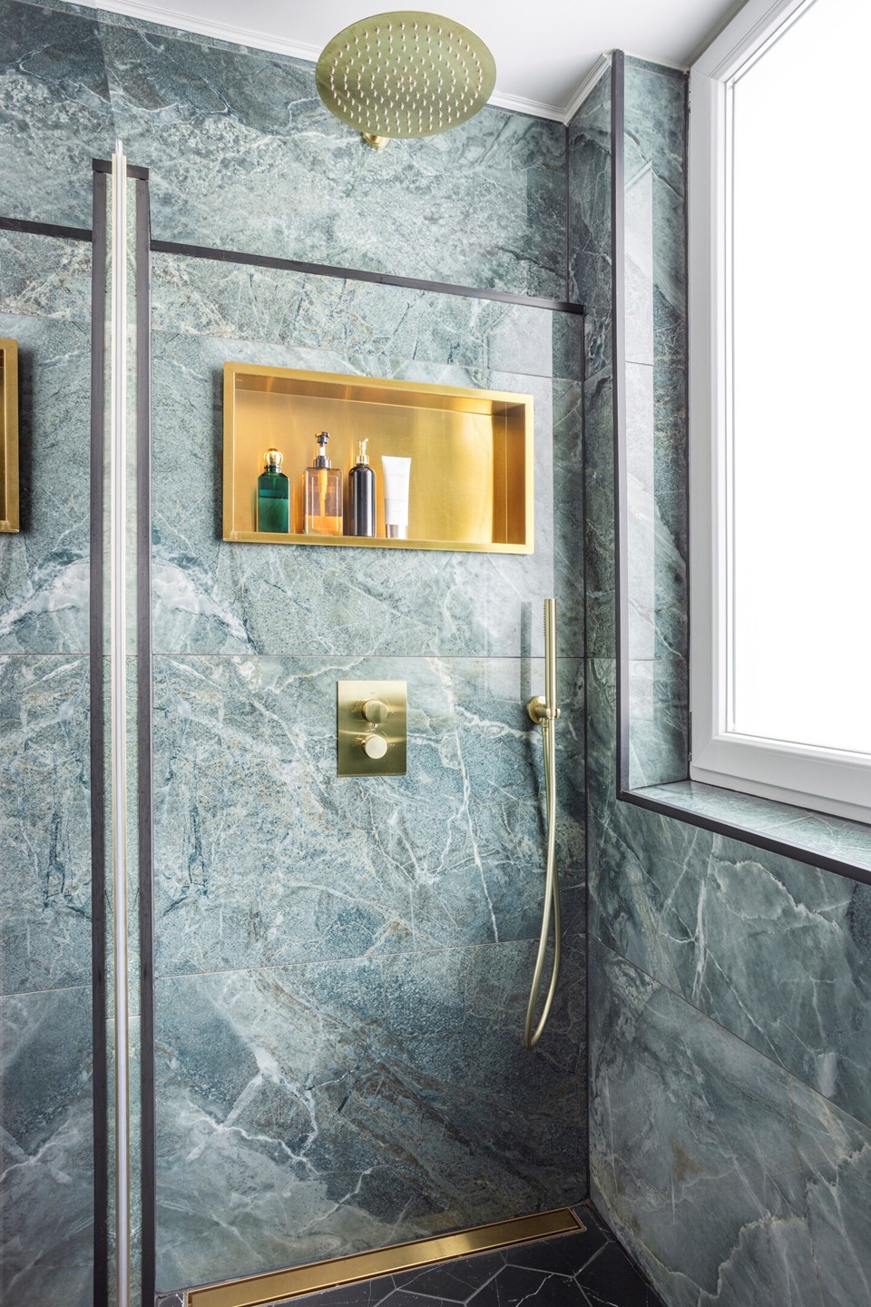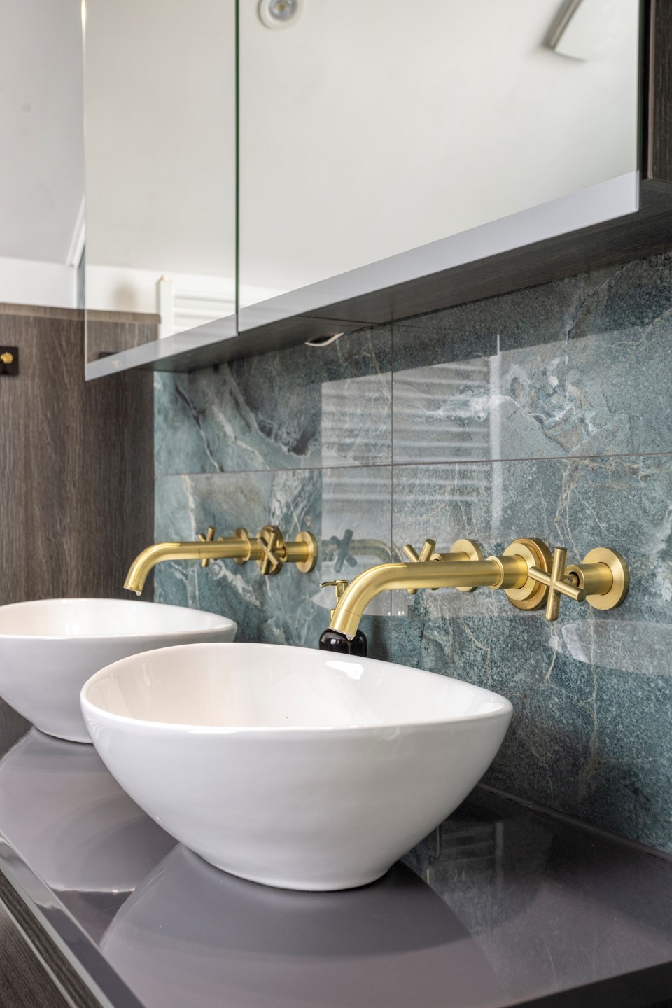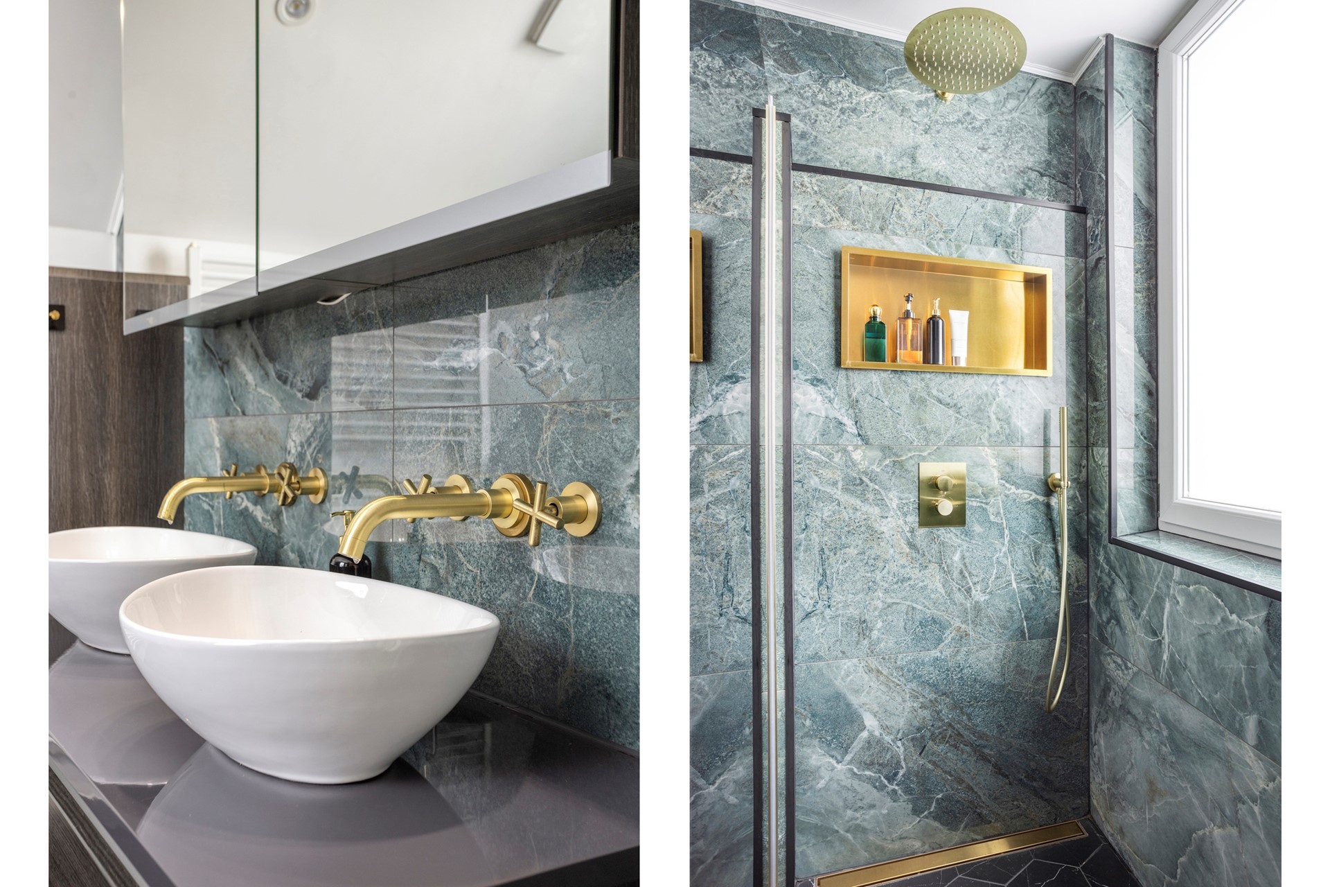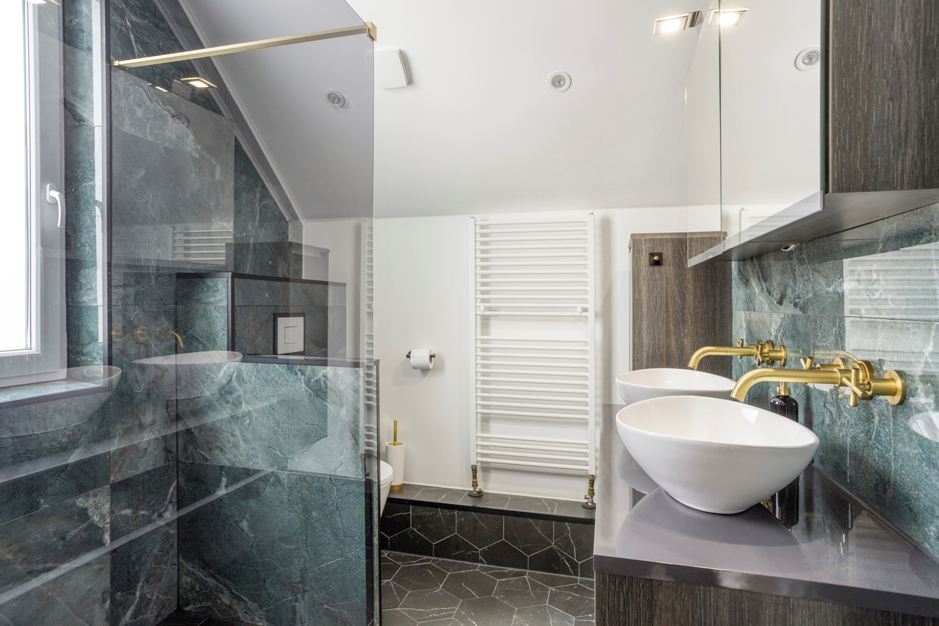 De recent vernieuwde badkamer is modern en comfortabel ingericht met een inloopdouche, een badmeubel met dubbele wastafel en een tweede toilet. De stijlvolle afwerking, de messing inbouw kranen en de inbouwspots zorgen voor een frisse en luxe uitstraling.