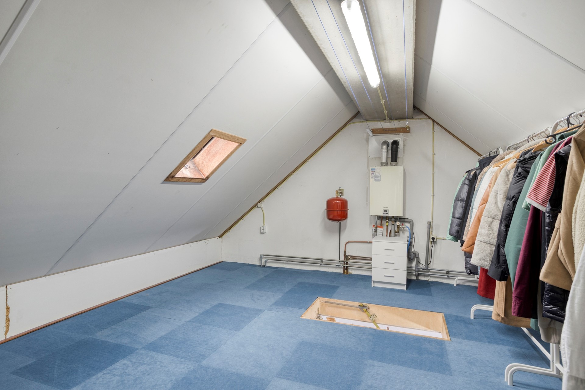 Via een vlizotrap bereik je de praktische bergzolder. Hier bevindt zich tevens de Remeha HR-combiketel (2009).