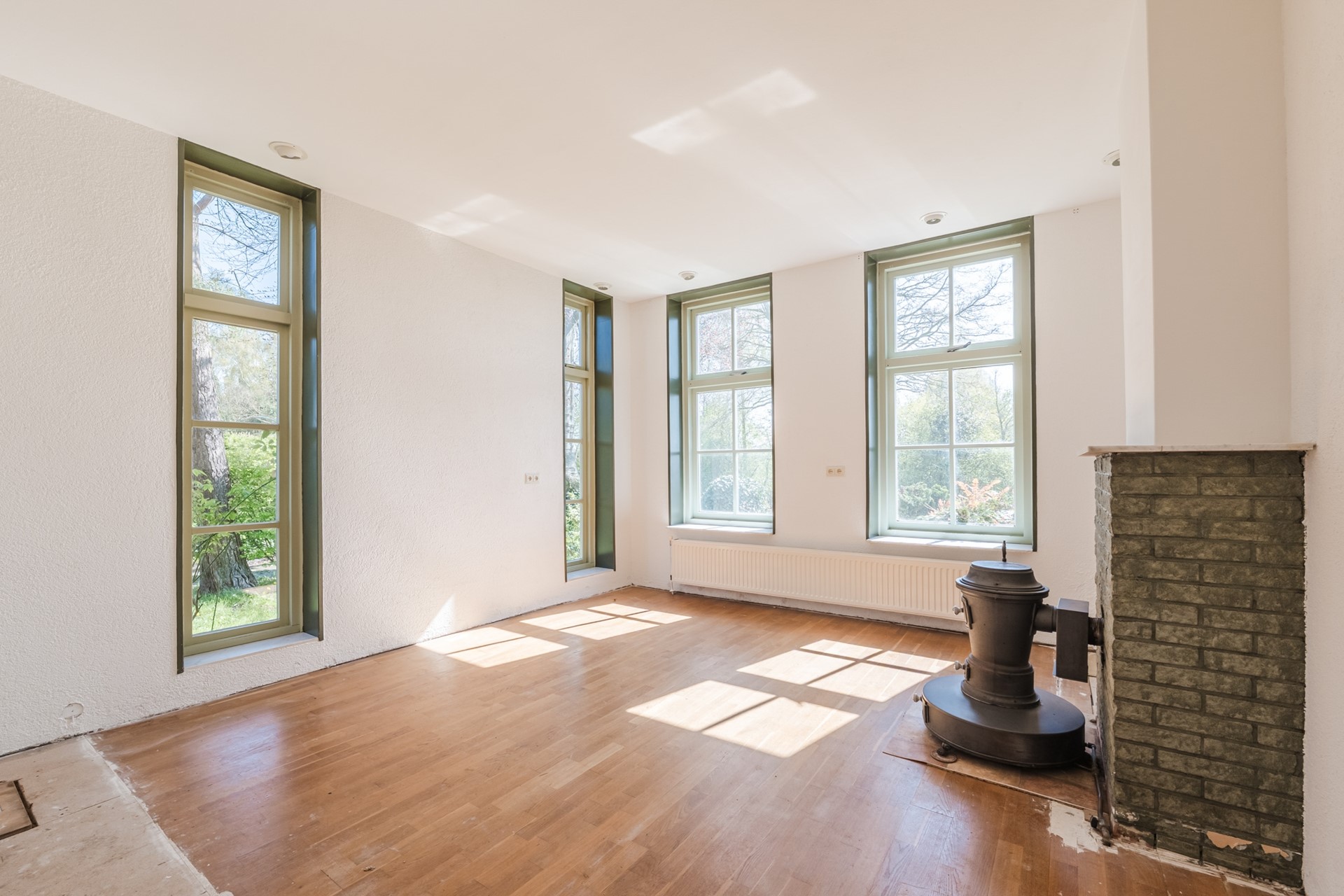 - Lichte woonkamer met gaskachel, vaste kast en prachtige hoge ramen