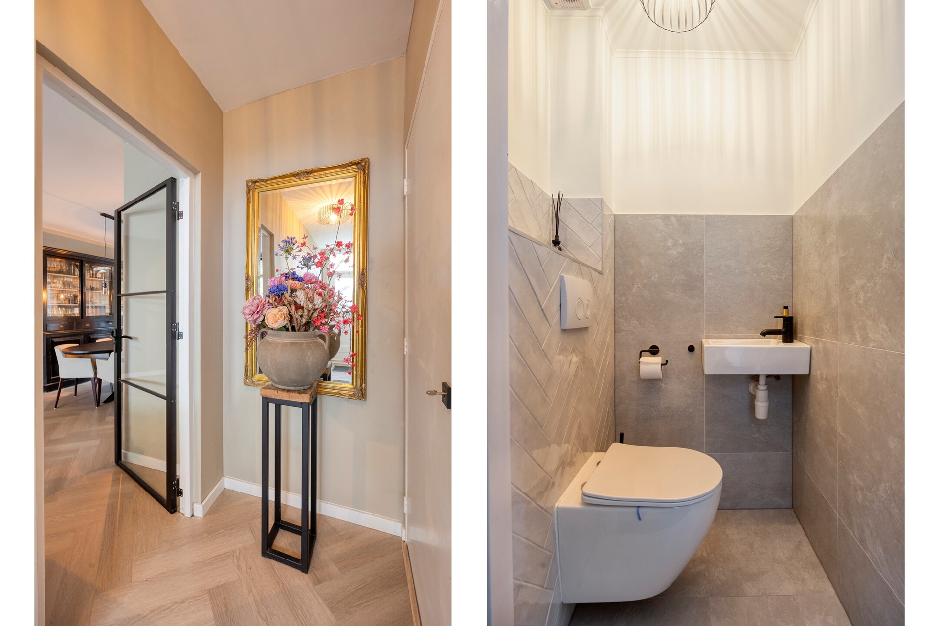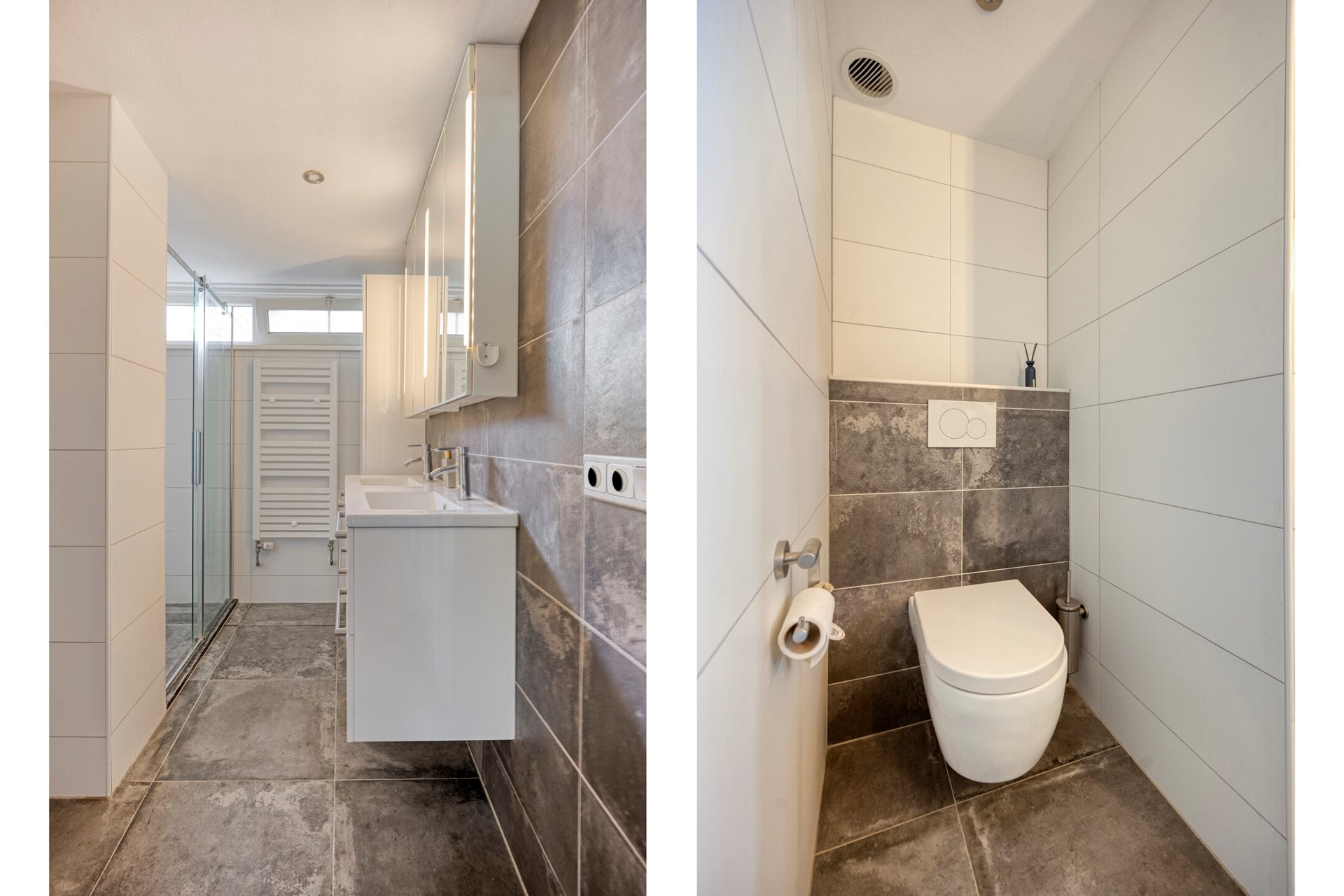 De toiletruimte is in 2023 vernieuwd. De mooie combinatie van tegels, maakt zelfs dit kleine kamertje tot een mooie plek in dit huis. Uiteraard met zwevend toilet en fonteintje. De trapkast is een handige plek voor het opbergen van voorraad en overige spullen.