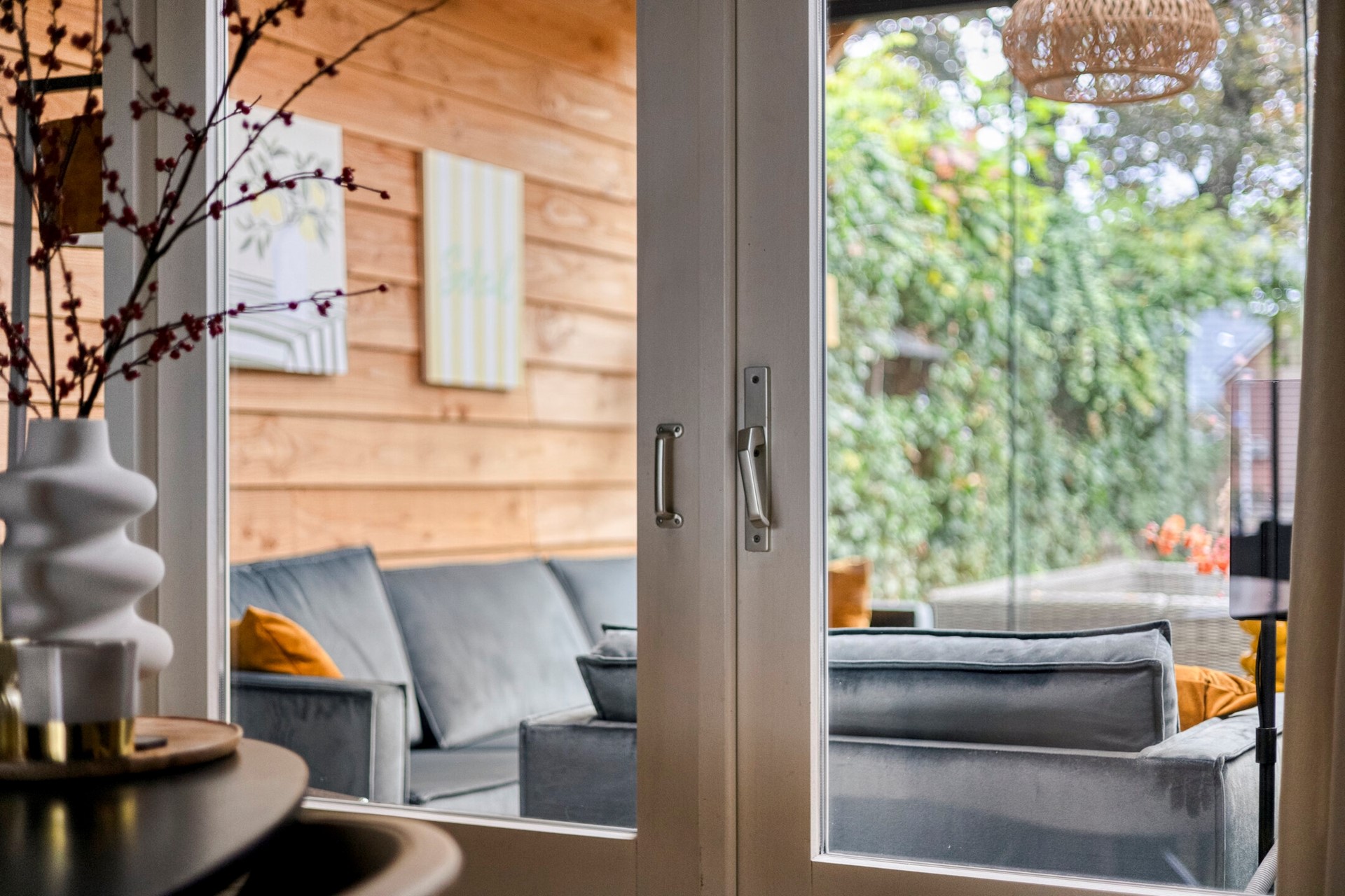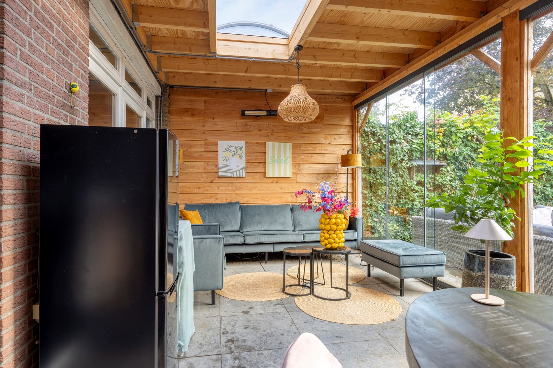 Via de deur in de keuken en de dubbele deuren in de woonkamer, is er toegang tot de overkapping. Dit is met recht een verlengstuk van de woonkamer te noemen. Door de lichtkoepels is er een fijne lichtinval en je hebt er gewoon plek voor een grote zithoek en een eettafel. De overkapping is af te sluiten met een glazen wand, waardoor je er het hele jaar plezier van kunt hebben.