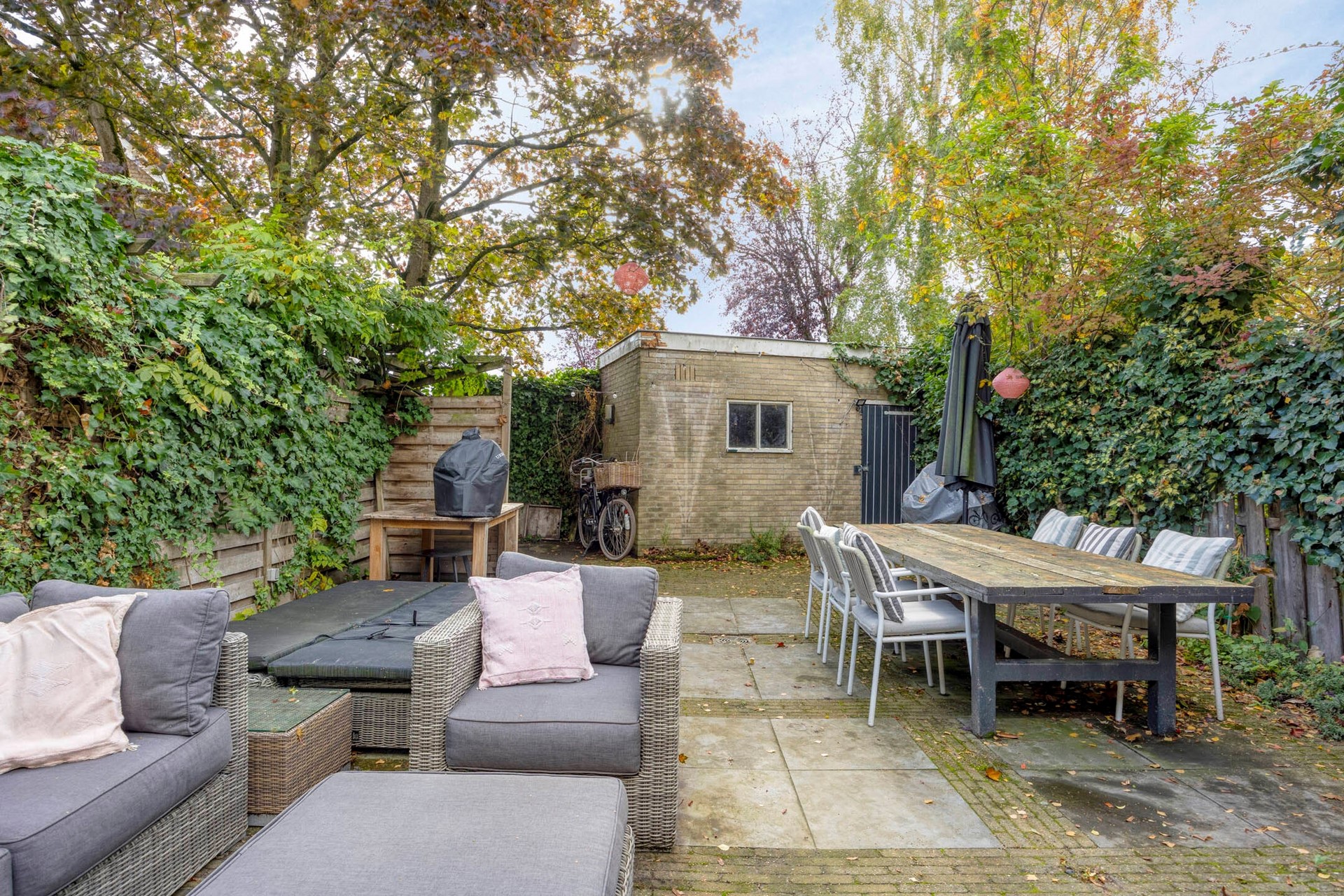 De tuin is op het Zuidwesten en kan dus heerlijk zonnig zijn. Hij is aangelegd met sierbestrating en ruim genoeg voor zowel een gezellige loungeset als een grote tuintafel met stoelen. Achterin de tuin is een stenen berging en ook een achterom.
