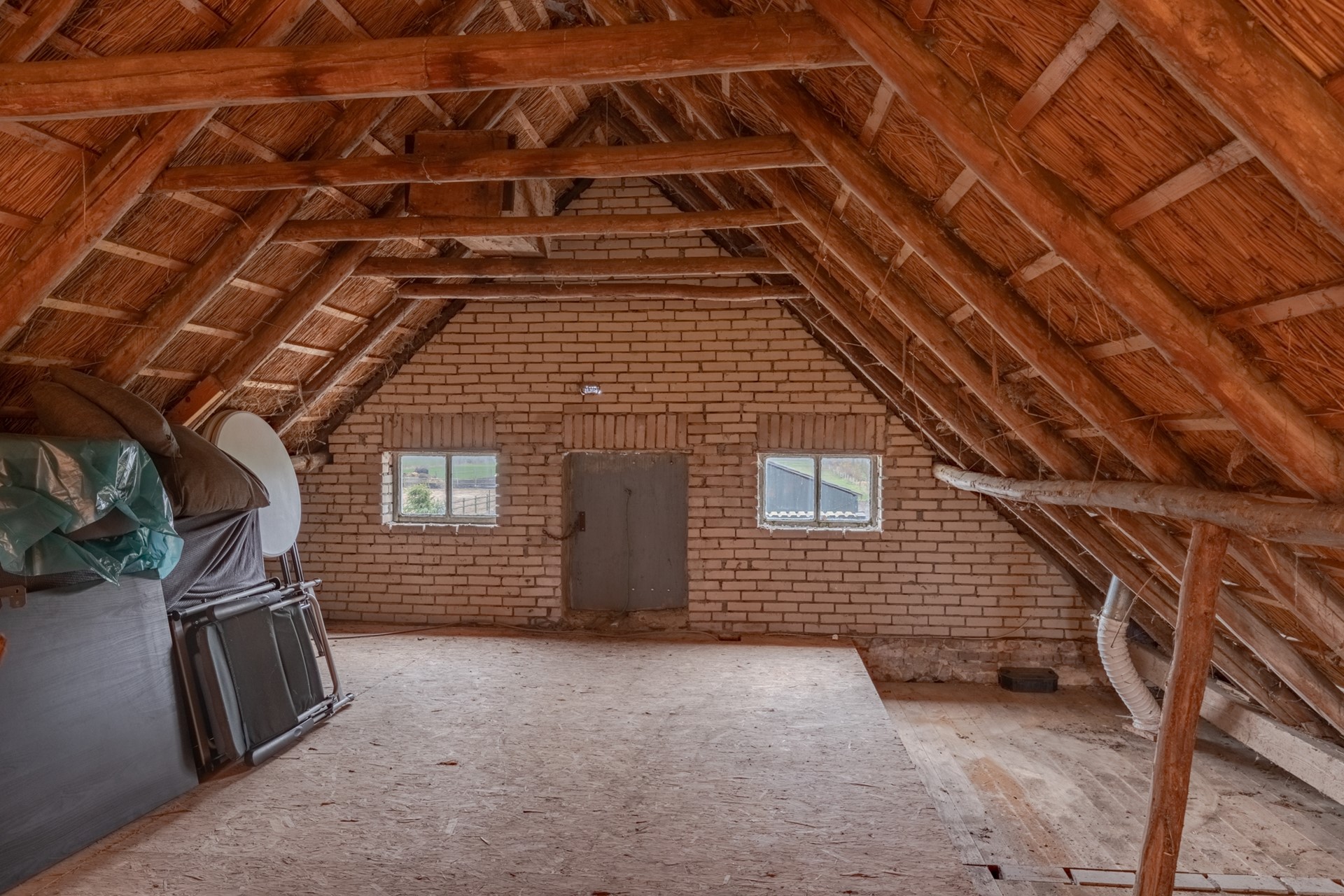 Op de verdieping bevindt zich een grote zolderruimte onder het karakteristieke riet gedekte dak. Deze verdieping biedt volop mogelijkheden om extra kamers te creëren, of kan dienen als ruime berg- of hobbyruimte.