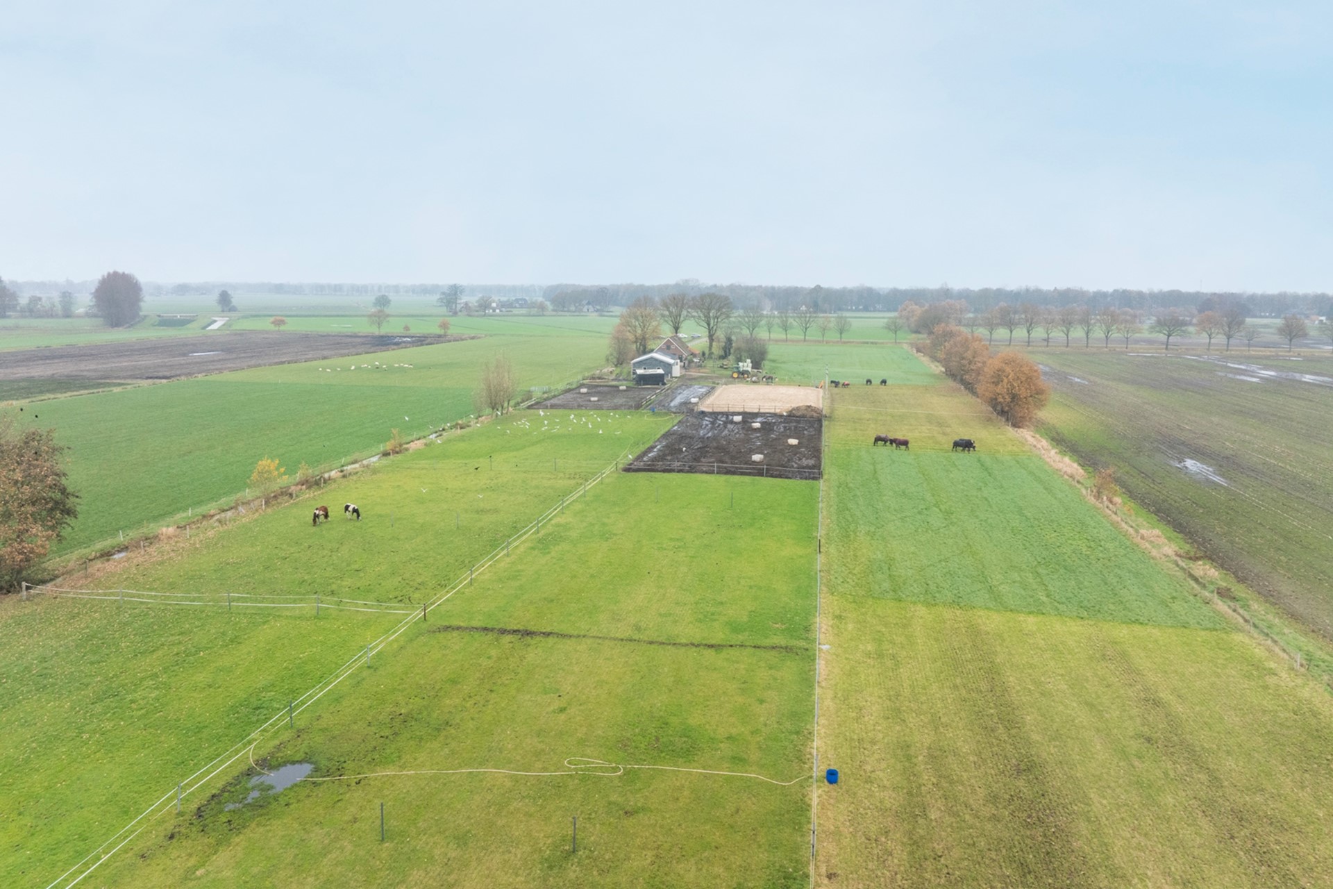Rondom de woning ligt een uitgestrekte buitenruimte van circa 2,4 hectare, bestaande uit open grasland, erf en verdere weidegrond. Deze royale oppervlakte maakt het perceel uitermate geschikt voor het houden van paarden, vee of andere hobbymatige activiteiten in de buitenlucht. Op het terrein bevindt zich tevens een zand-paardenbak, ideaal voor het dagelijks trainen of vrij bewegen van paarden.