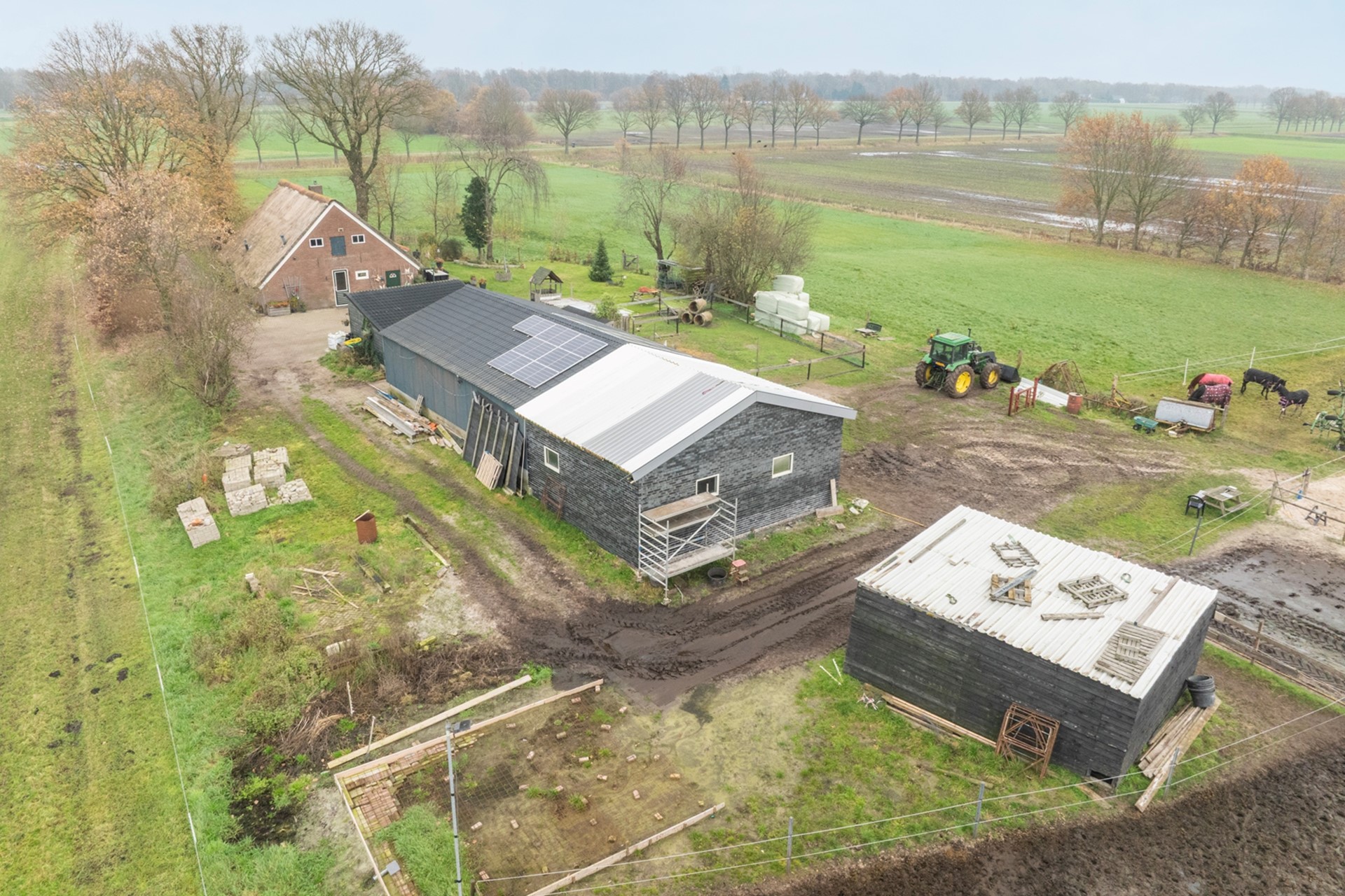 De volledige schuur, inclusief de aanbouw uit 2025, heeft een oppervlakte van circa 156 m². Het voorste gedeelte is voorzien van 28 zonnepanelen op het dak, wat zorgt voor een aanzienlijke energiebesparing en een duurzame energievoorziening op het erf.