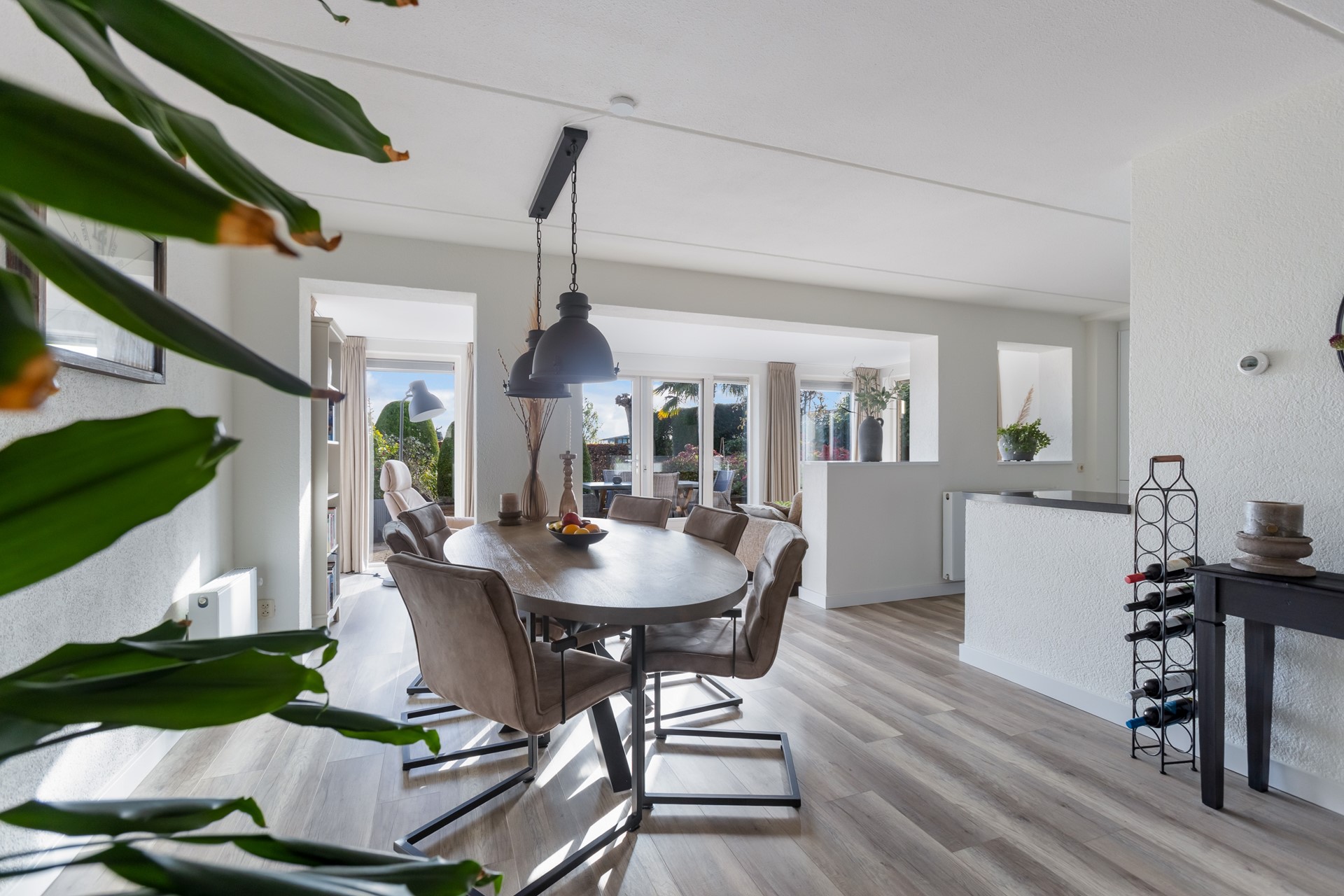 De indeling is als volgt: hal met toilet, meterkast, trapopgang en toegang tot de grote fraaie L-vormige living van 60 m², bestaande uit de oorspronkelijke doorzonwoonkamer, de uitbouw/tuinkamer (met openslaande tuindeuren en aan 3 zijden ramen, waardoor de lichtinval uitzonderlijk groot is) en de ruime eetkeuken met in 2022 geplaatste luxe inbouwkeuken v.v. inbouwapparatuur en natuurstenen aanrechtblad. Vanuit de keuken is er toegang tot de bijkeuken (met aansluitingen en afvoeren t.b.v. de wasapparatuur en een loopdeur naar de tuin en naar de inpandige garage).