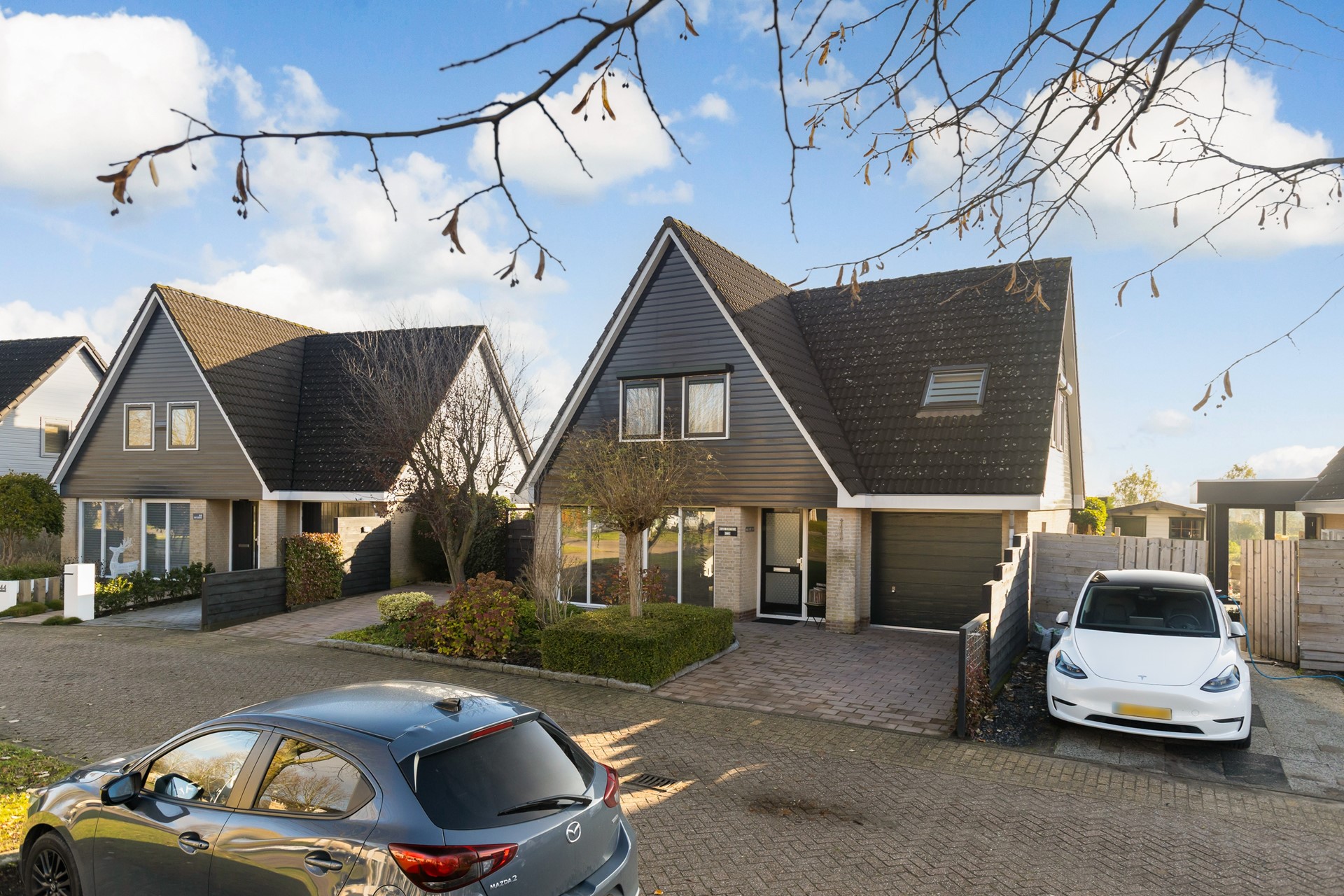 Aan voorzijde is er aan linker- en rechterzijde gelegenheid om te parkeren op eigen erf (en in de garage) en aan linkerzijde naast de woning is een houten fietsenberging geplaatst.
