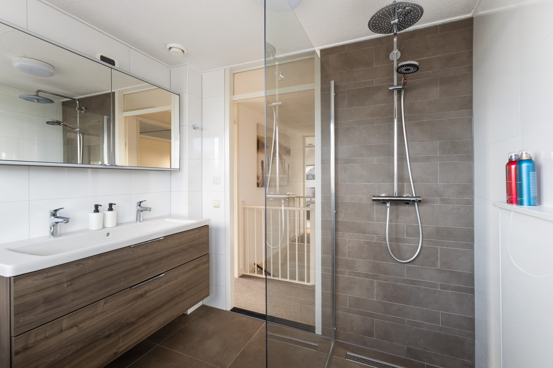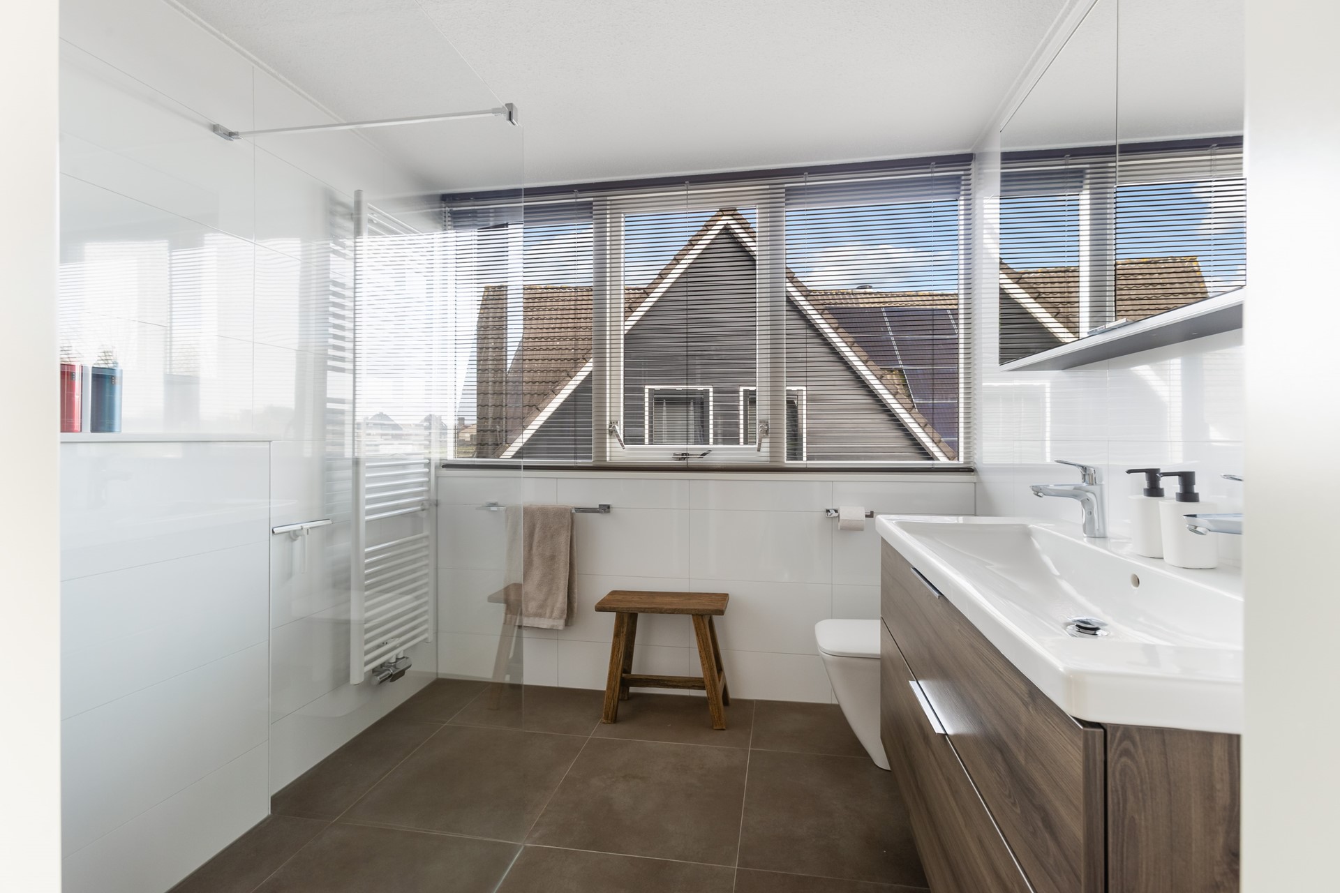 De indeling van de verdieping – die vanwege de dwarskapconstructie en de ruimte boven de garage aanzienlijk groter is dan verwacht - is als volgt: royale overloop, mooie ouderslaapkamer met vaste kast en openslaande deuren naar het dakterras, prima tweede slaapkamer met vaste kasten, leuke derde en vierde slaapkamer en luxe en strakke – in 2019 vernieuwde – badkamer met dakkapel, inloopdouche, designradiator, tweede toilet en badkamermeubel met wastafel.
