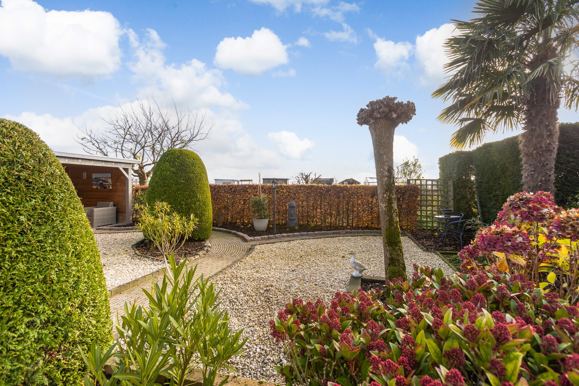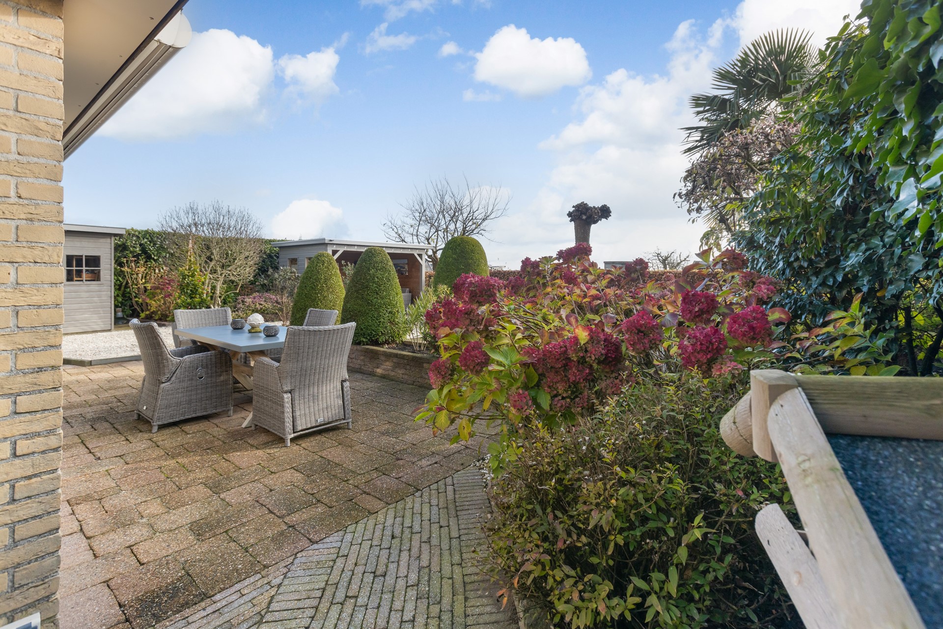 De prachtig aangelegde, zeer verzorgde en groene tuin ligt op het zuidoosten en in de tuin is een 'op het zuidwesten gerichte' overkapping geplaatst, die er voor zorgt dat je het ontbijt kan nuttigen in de schaduw en later op de dag kunt genieten van het zonnetje.