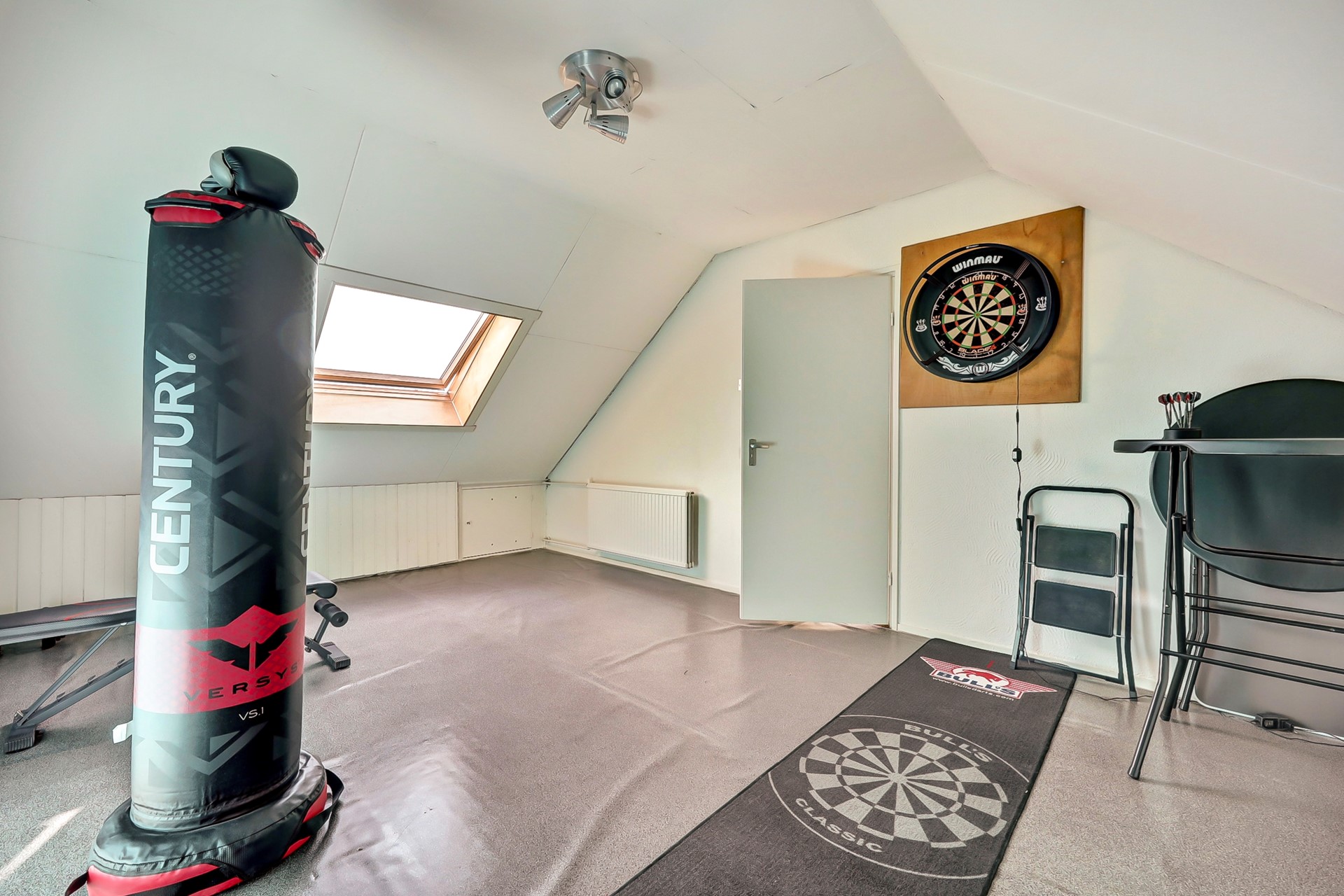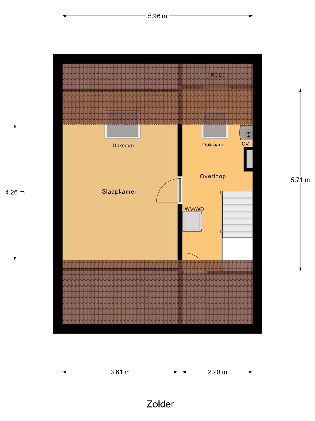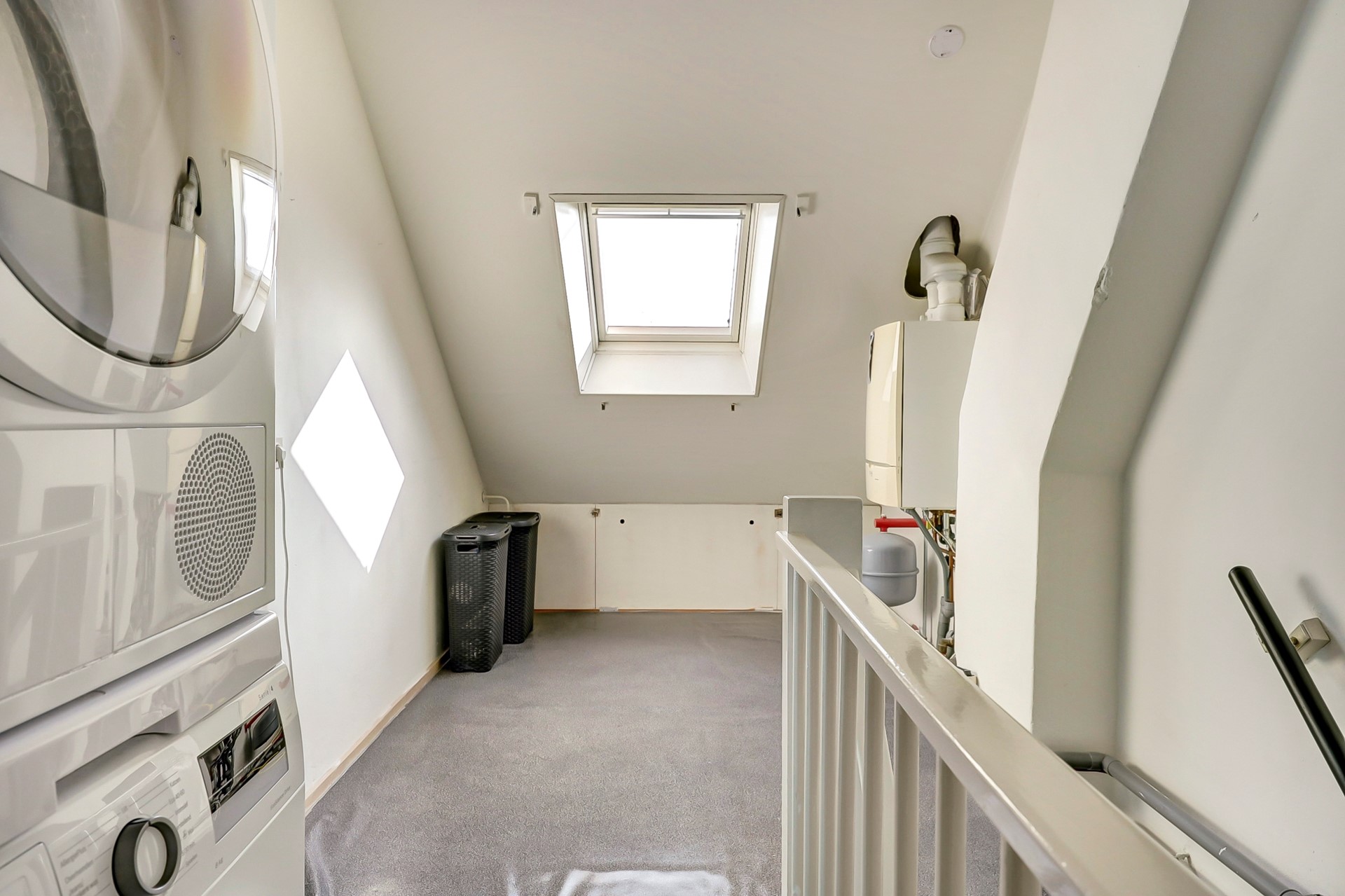 Omdat mijn opdrachtgever de ruimte op de tweede verdieping niet nodig had, heeft hij hier ook niets aan veranderd. Ook hier kan een koper desgewenst een eigen twist aan geven. De indeling is als volgt: voorzolder met c.v.-opstelling (Remeha Calenta HR-ketel 2011) en aansluitingen en afvoeren t.b.v. de wasapparatuur en een grote vierde slaapkamer (426 x 360, op de 1.50 meter lijn) met bergruimte achter de knieschotten.