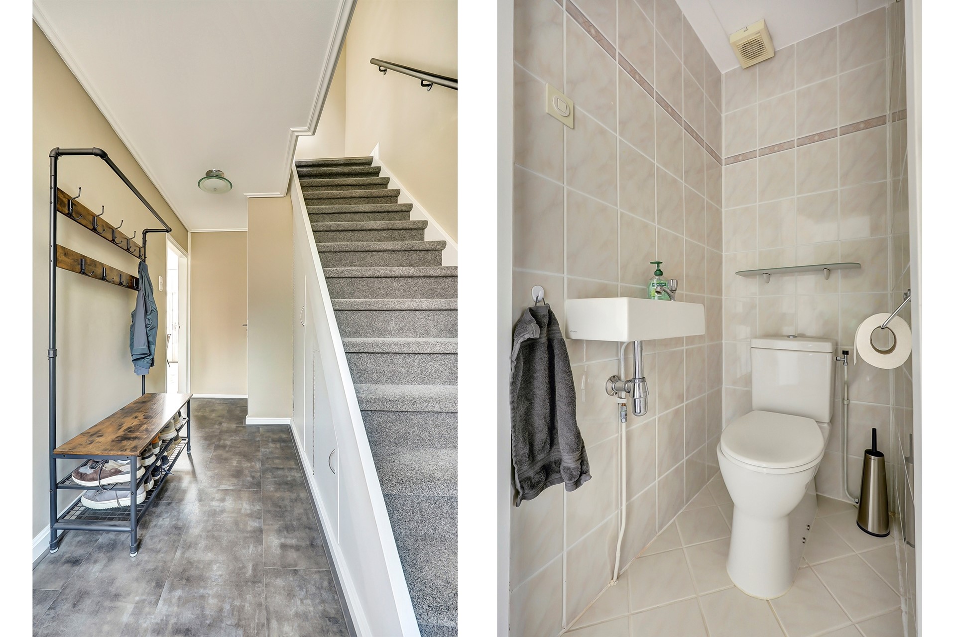 De indeling is als volgt: entree, ruime hal met toilet, trapkast, trapopgang en toegang tot de royale living van 38 m², bestaande uit de doorzonwoonkamer (845 x 360) en de halfopen keuken (337 x 221) met moderne - in 2021 geplaatste - hoek inbouwkeuken v.v. -apparatuur. De tuin bereikt u via een loopdeur in de keuken. Door de grote ramen in de doorzonkamer is de woning gezegend met een zeer prettige hoeveelheid lichtinval.