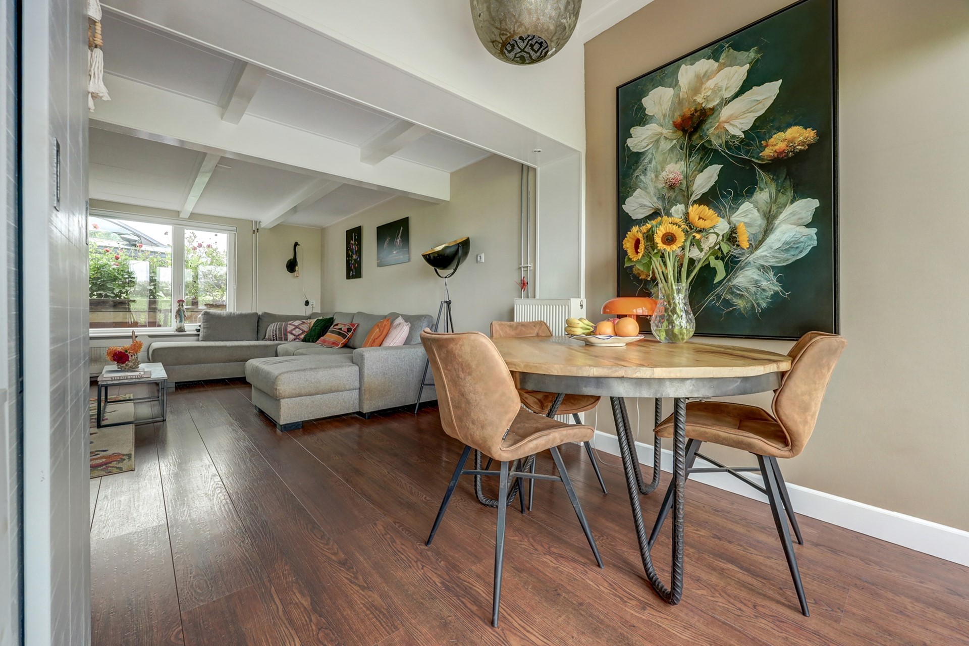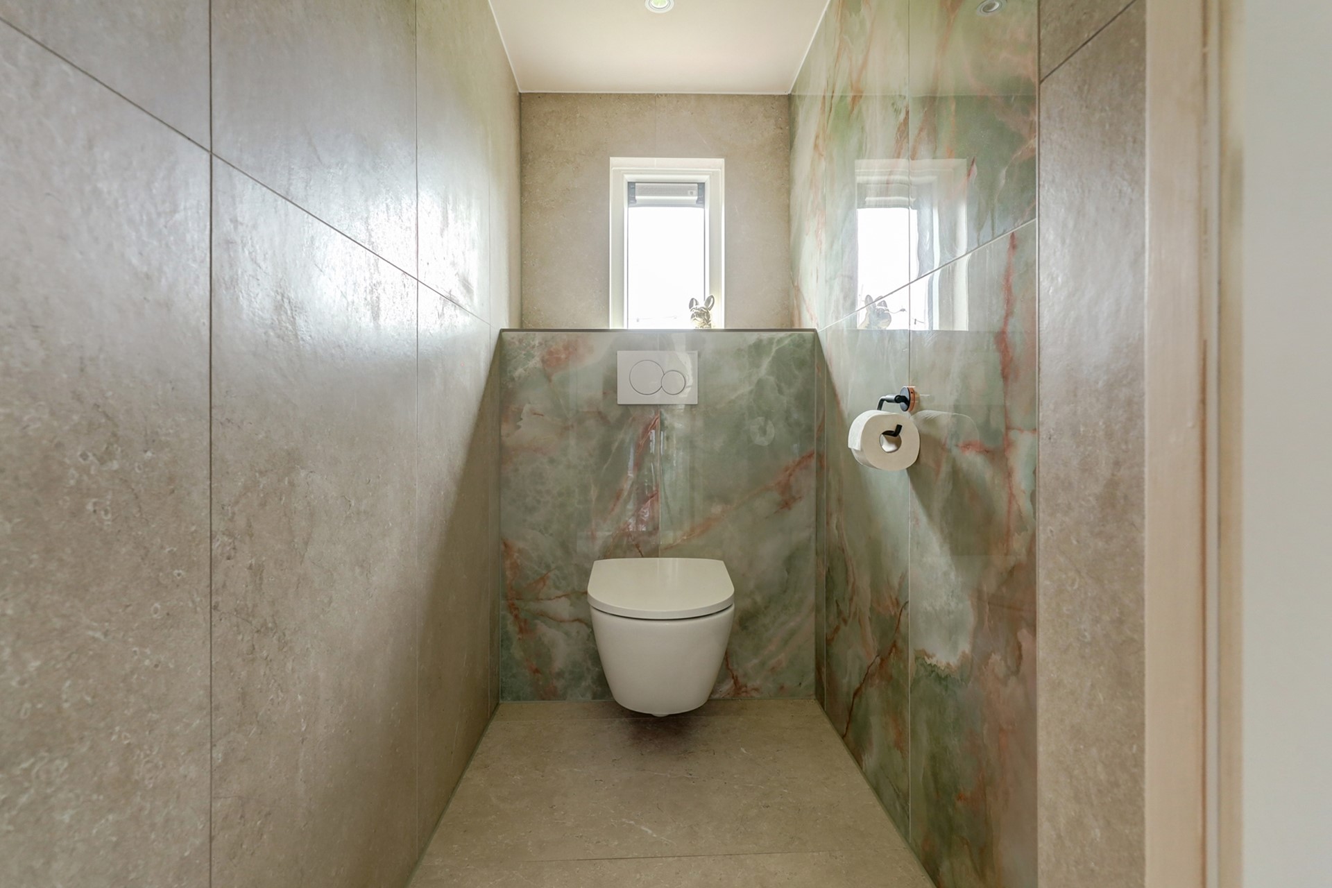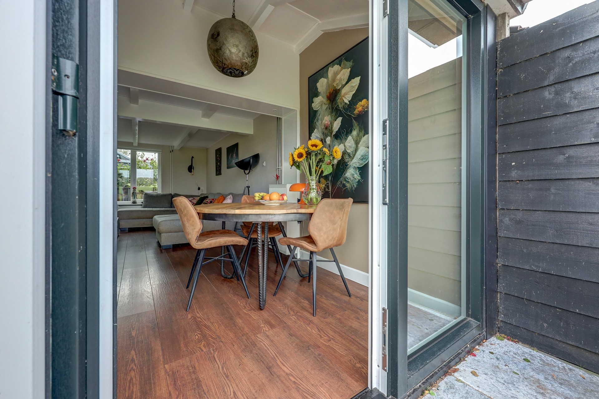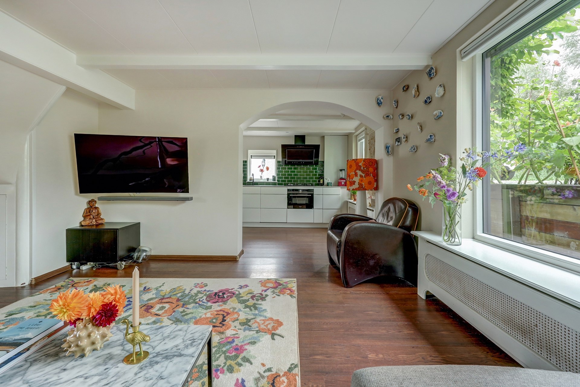 De indeling is als volgt: entree in de zijgevel, met aan rechterzijde het toilet (2024) en de luxe – in 2024 vernieuwde - badkamer (328 x 188 met inloopdouche, elektrische vloerverwarming en badkamermeubel met wastafel), recht vooruit de trapopgang en aan linkerzijde de in 2020 geplaatste moderne inbouwkeuken, ruim voorzien van inbouwapparatuur en van een Quooker. Vanuit de keuken bereikt u de sfeervolle en smaakvol afgewerkte woonkamer van 28 m², met balkenplafond, buitengewoon veel lichtinval, exclusieve duette shades plisés, openslaande tuindeuren en vrij uitzicht over het achtergelegen polderlandschap.