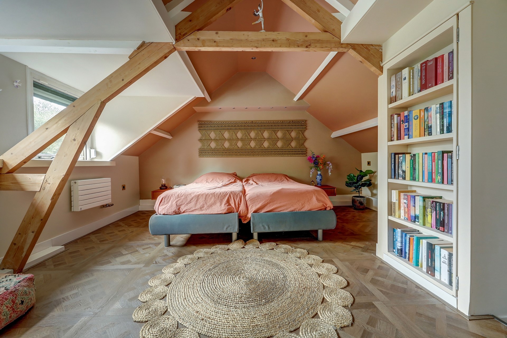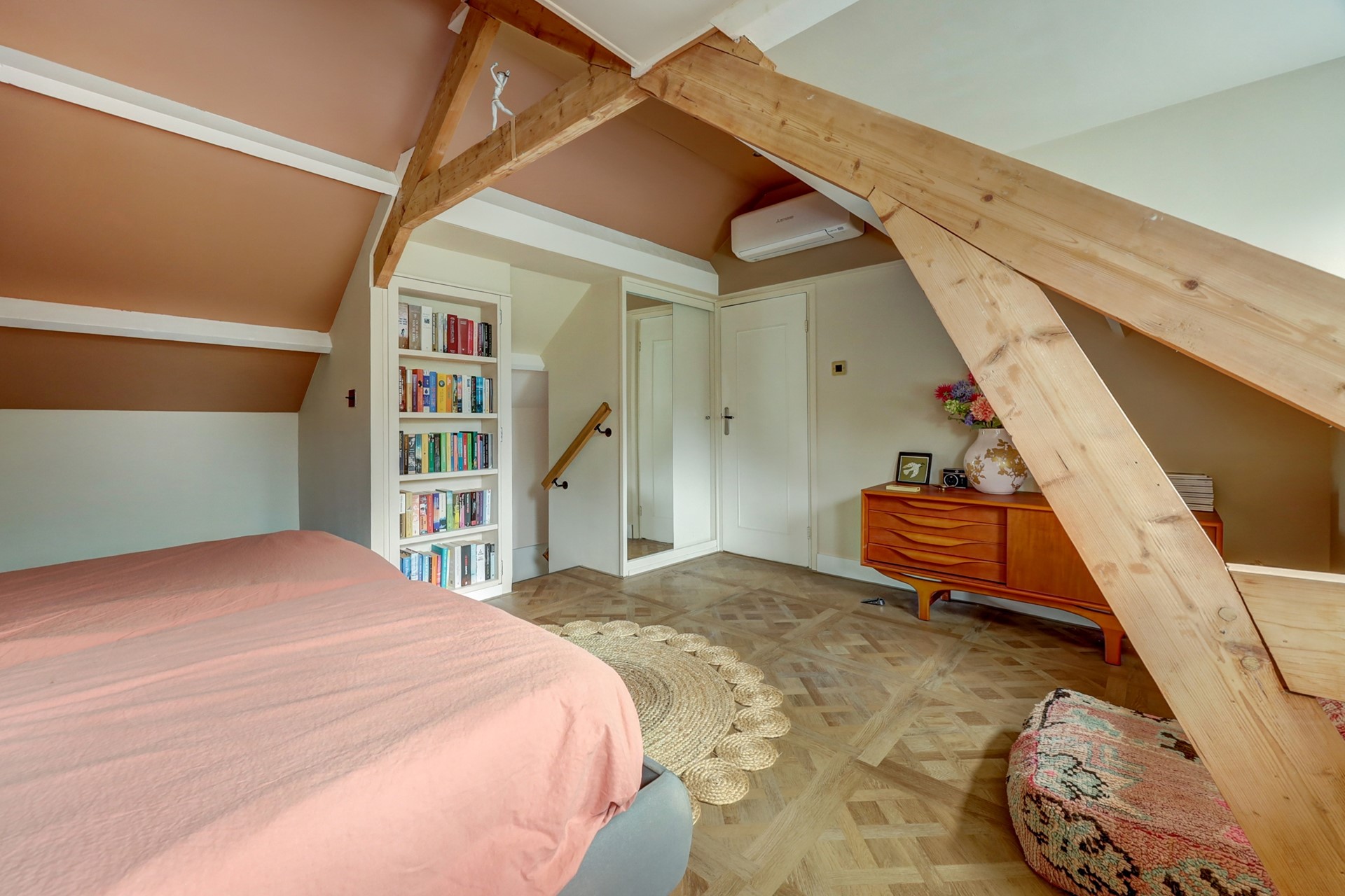 Op de verdieping is de indeling als volgt. Overloop/logeerkamer met dakkapel, bergruimte, toegang tot het platte dak/toekomstige dakterras en tot de royale en romantische slaapkamer (487 x 478) met airco en de nog zichtbare spanten en gordingen. Ten tijde van de aankoop waren er 2 slaapkamers en een overloop op de verdieping. Desgewenst is 'die situatie met 2 slaapkamers boven' op eenvoudige wijze weer terug te brengen