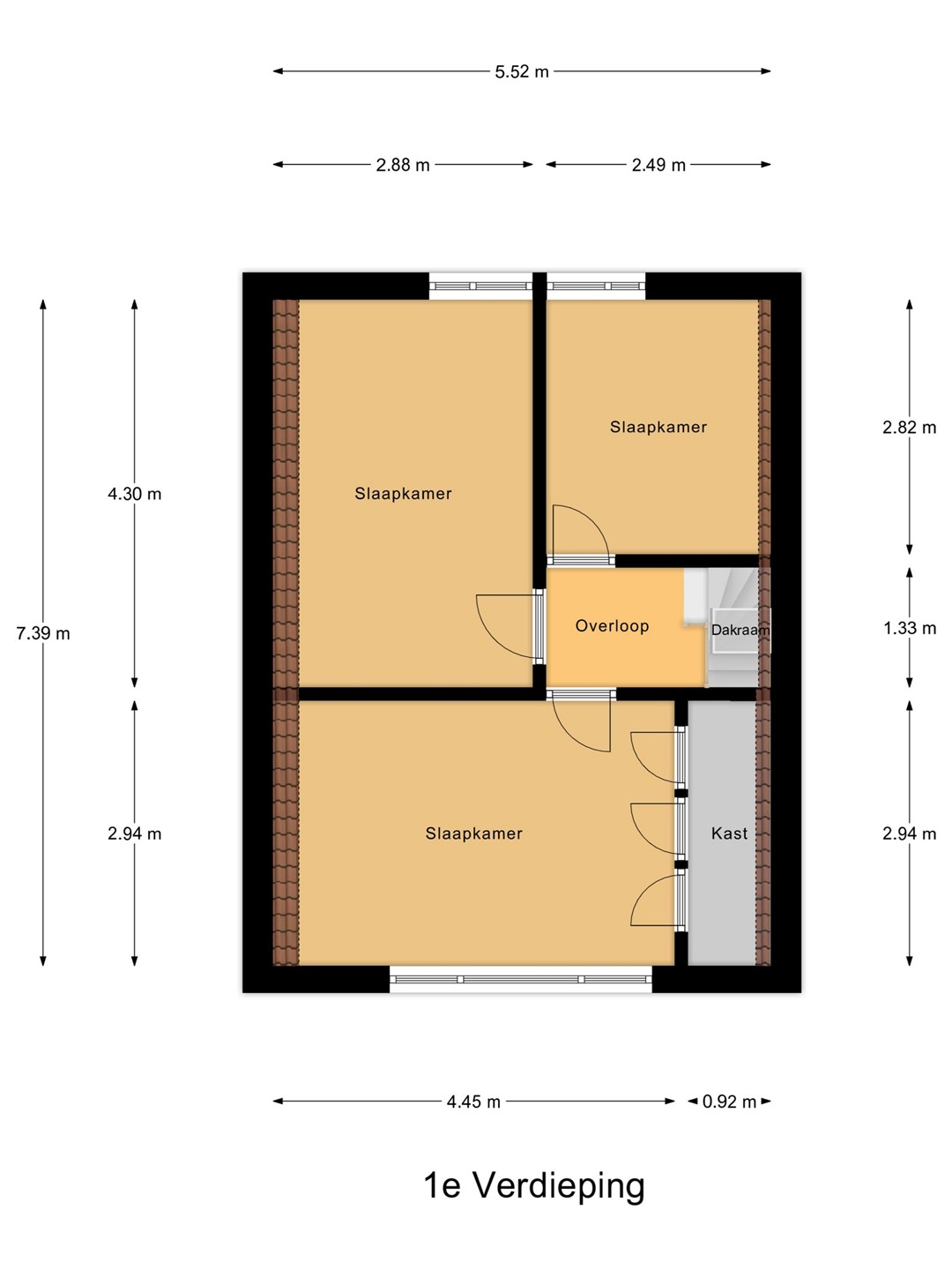 Op de verdieping is de indeling als volgt: overloop en drie slaapkamers (445 x 295 plus vaste kast, 430 x 288 en 282 x 249).