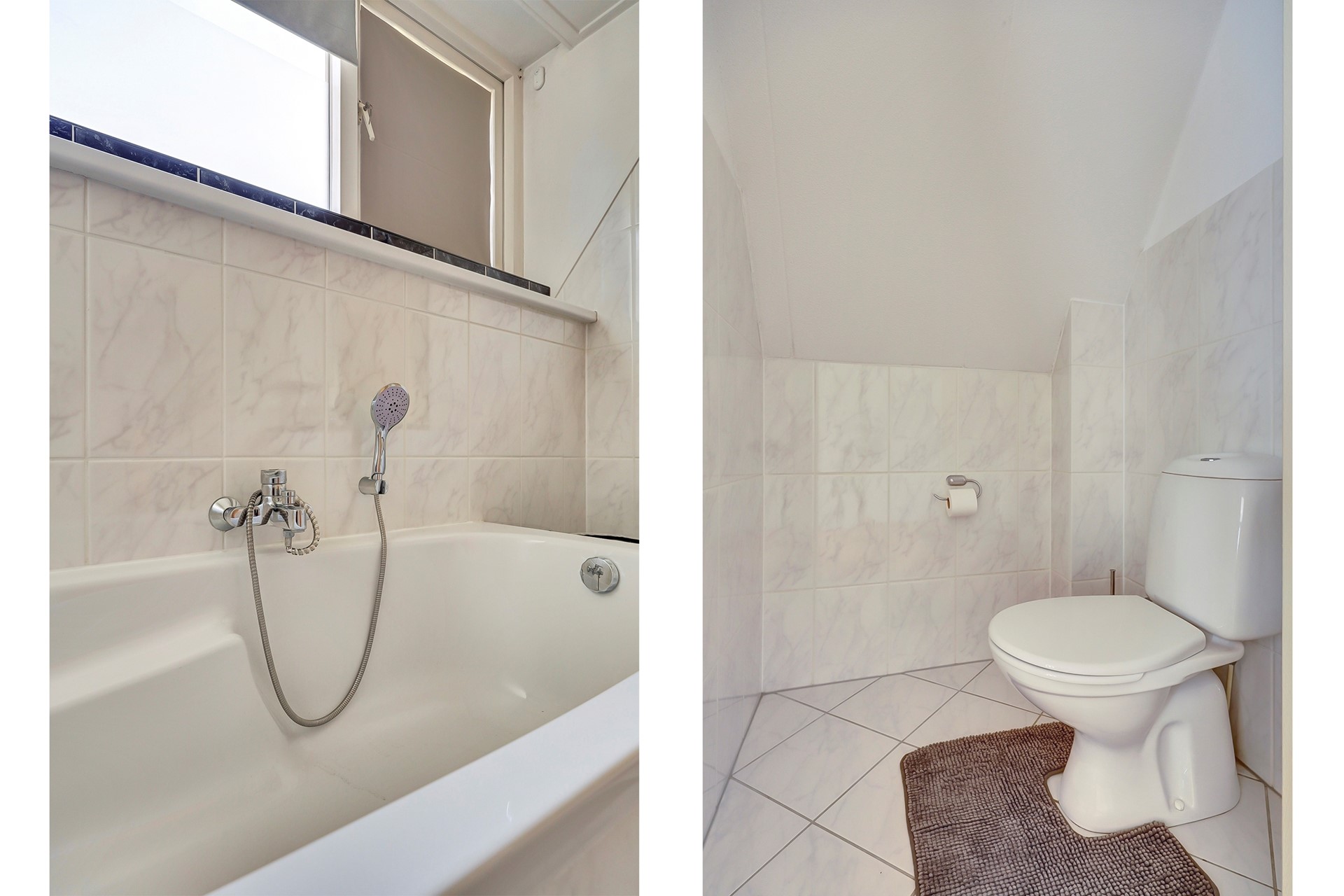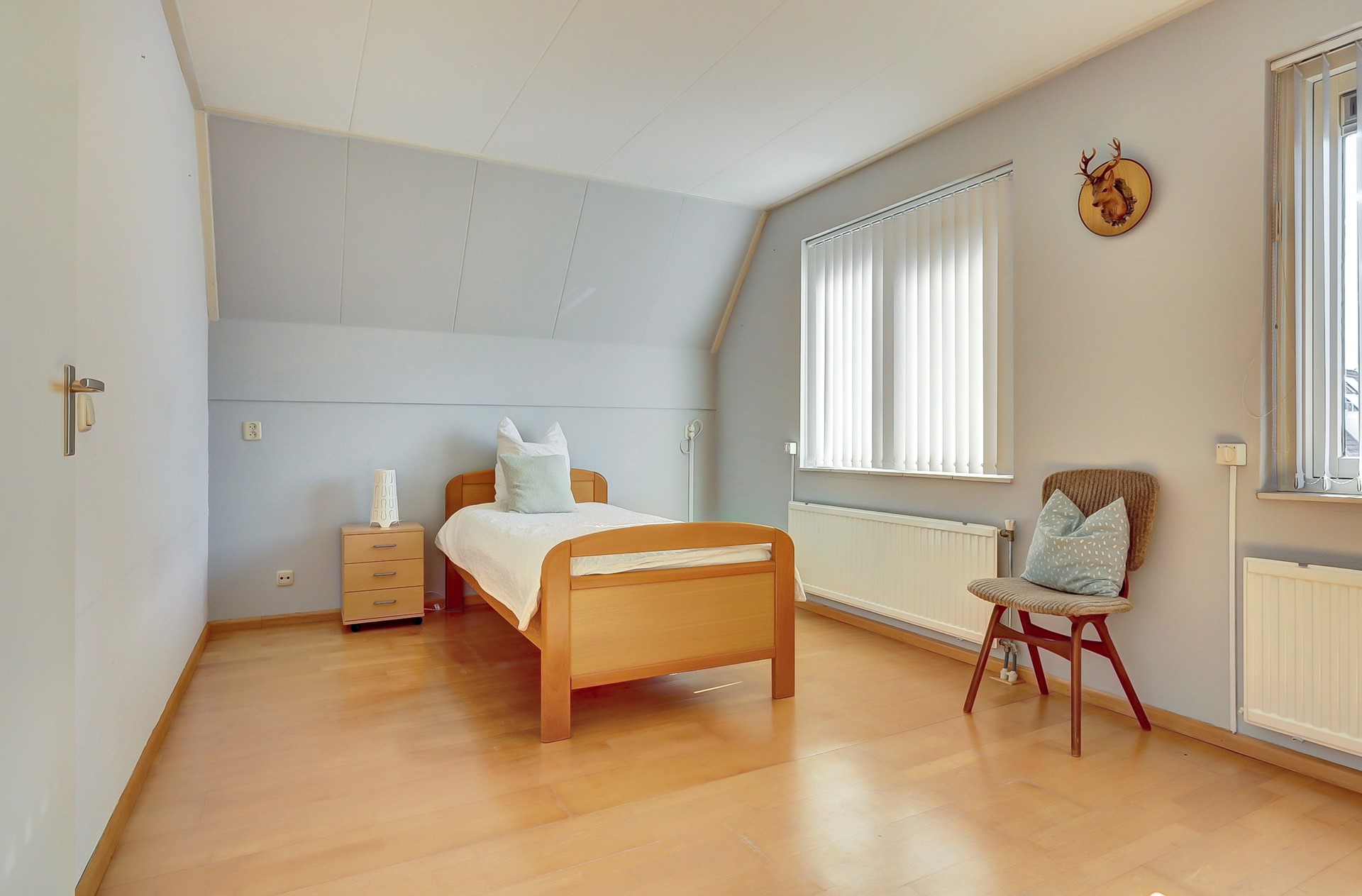 Op de eerste verdieping is de indeling als volgt: overloop met separaat toilet, na het wijzigen van de indeling twee grote slaapkamer (568 x 393 en 568 x 297, beide met vaste kastenwand) en de ruime badkamer (235 x 230) met dakkapel, ligbad, douchecabine en badkamermeubel met wastafel. Desgewenst is de grote slaapkamer uitstekend splitsbaar in twee volwaardige slaapkamers.