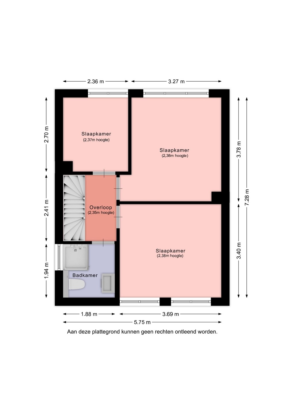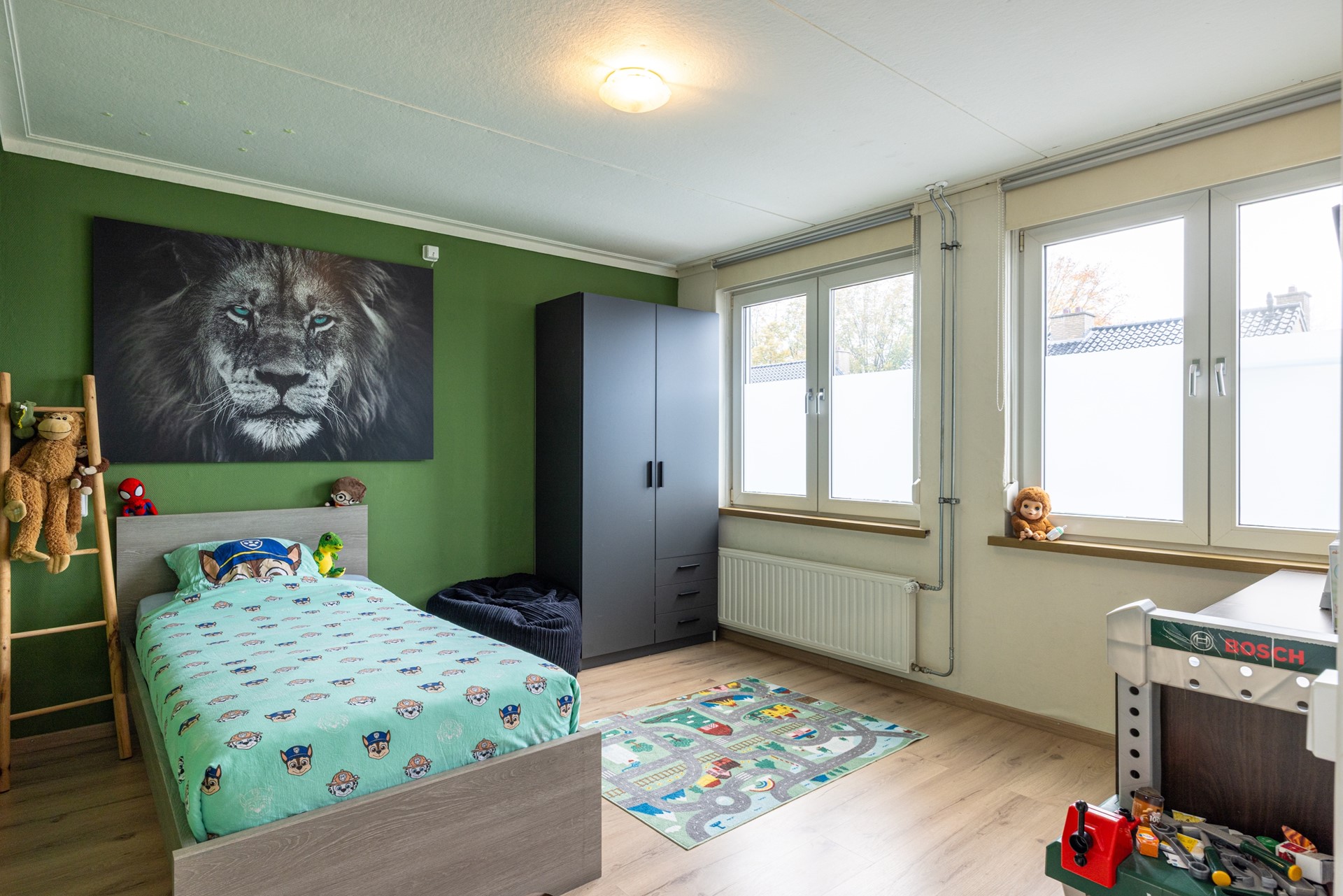 De overloop biedt toegang tot drie slaapkamers en de badkamer. De slaapkamers zijn stuk voor stuk praktisch ingedeeld en voorzien van een laminaatvloer die zorgt voor een warme uitstraling. Dankzij de grote ramen komt er veel daglicht binnen. Alle kamers zijn uitgerust met rolluiken, wat prettig is voor privacy en een goede nachtrust.