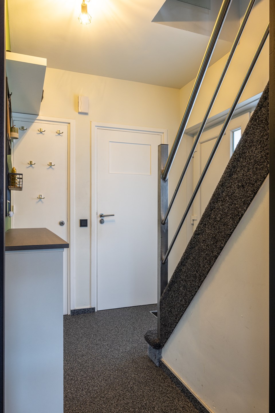 Je komt aan bij de nette voortuin met een eigen oprit die doorloopt naar de garage. Via de voordeur stap je binnen in de ontvangsthal met een grindvloer, een fijne plek voor de garderobe, de meterkast en toegang tot het toilet.