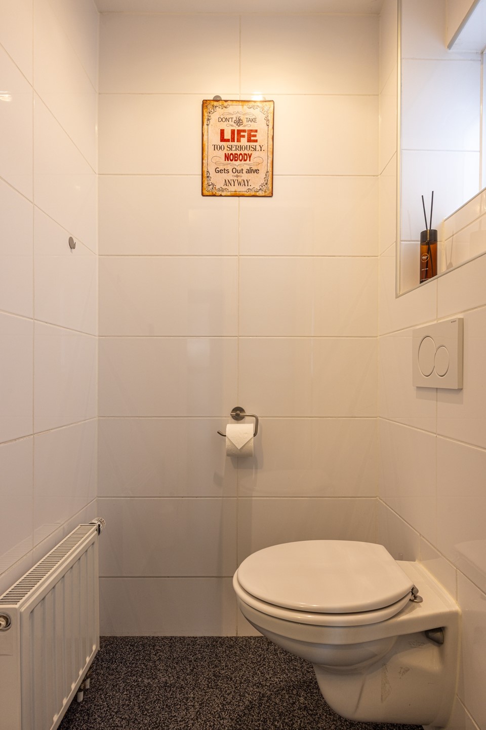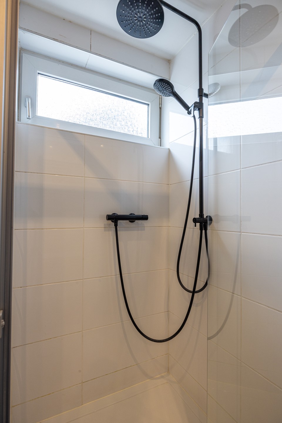 De badkamer is volledig betegeld en heeft een frisse, nette uitstraling. De ruimte is voorzien van een douchecabine, badkamermeubel met wastafel en spiegel, een tweede toilet en vloerverwarming. Hier heb je alle dagelijkse voorzieningen praktisch bij elkaar.