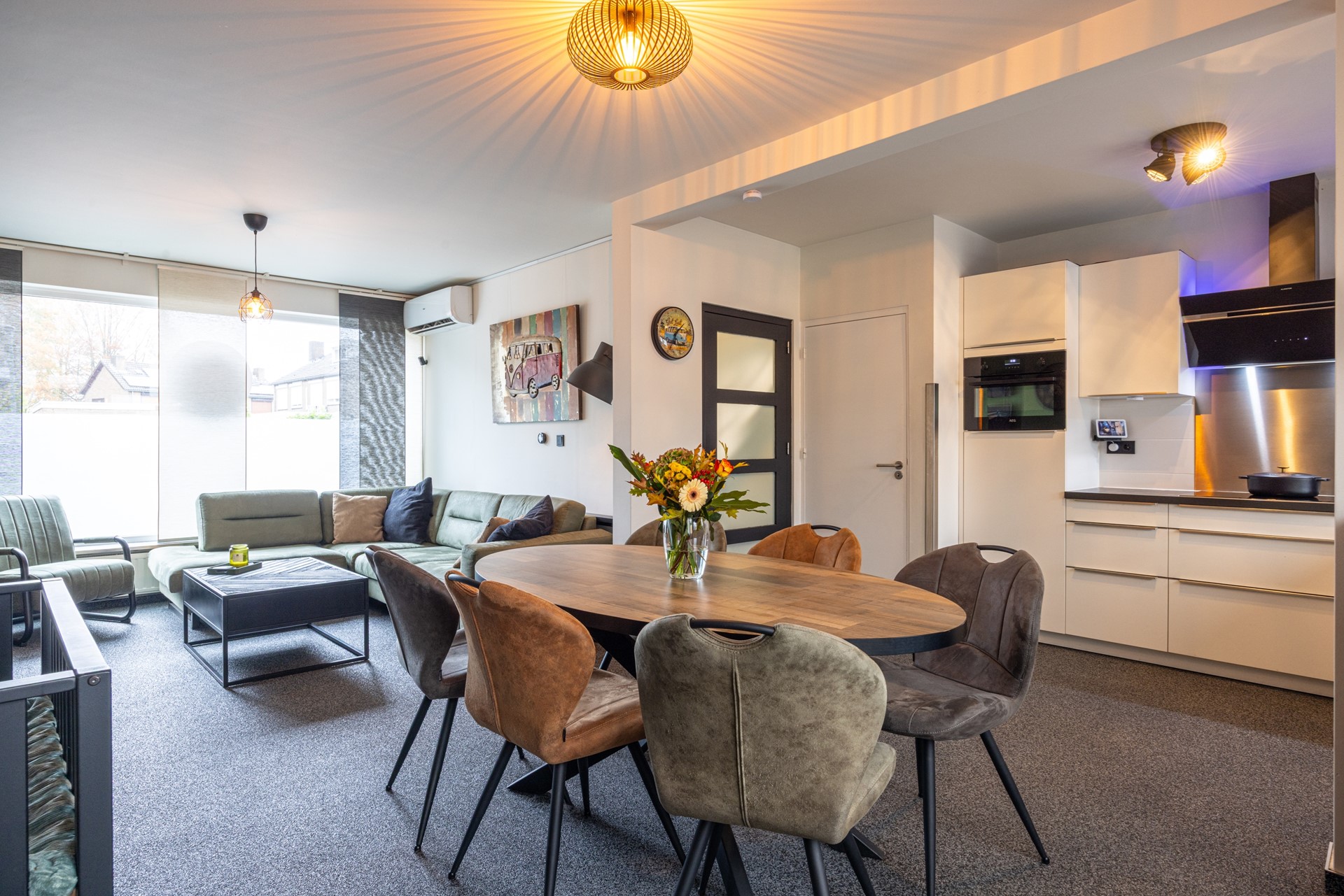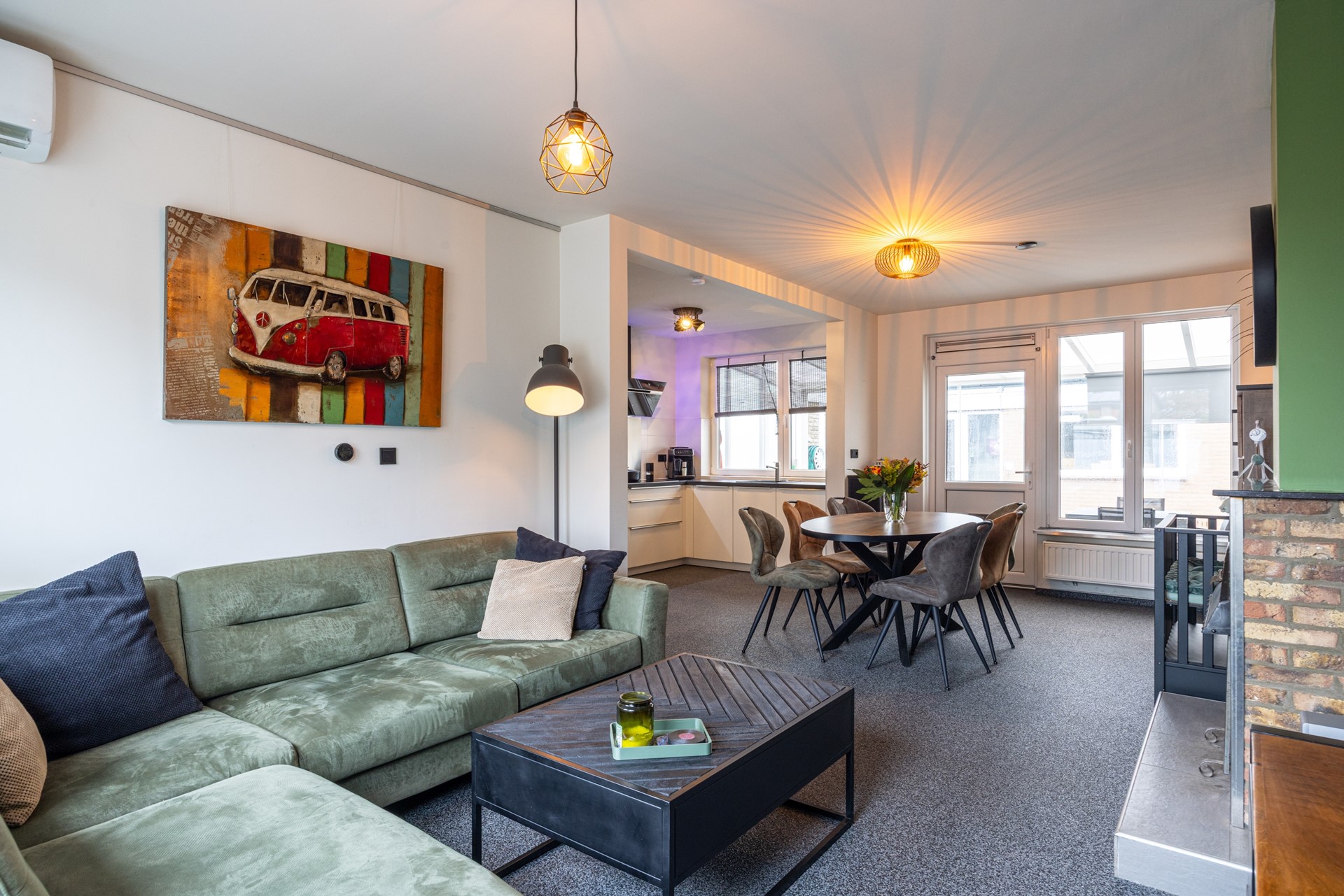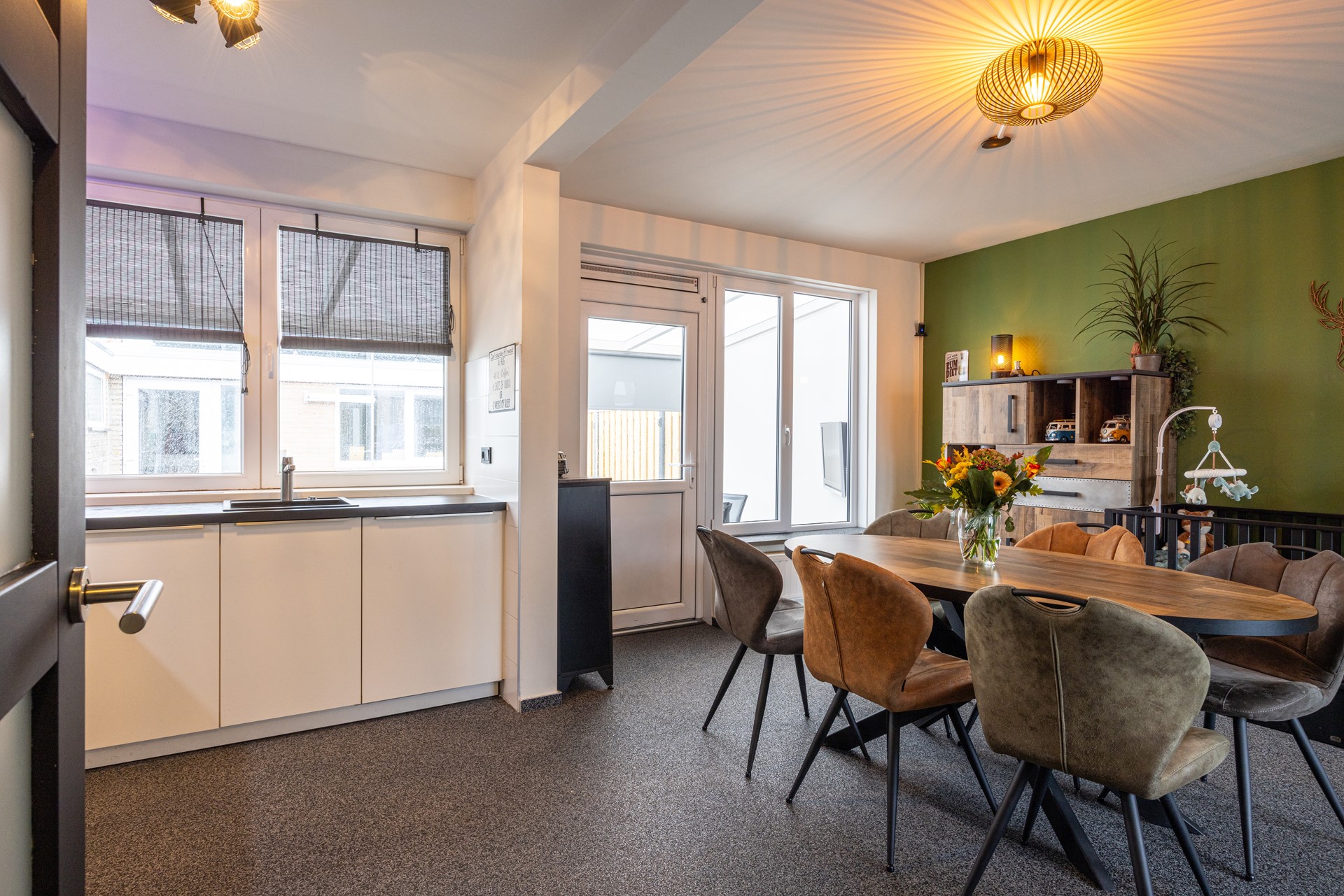 De woonkamer is een heerlijke leefruimte met veel daglicht dankzij het grote raam aan de voorzijde. De grindvloer zorgt voor een strakke en praktische basis, terwijl de airconditioning ervoor zorgt dat het hier het hele jaar door comfortabel is. De ramen zijn voorzien van HR++ en HR-dubbel glas, deels met voorzetramen en een rolluik aan de voorzijde, prettig voor zowel comfort als privacy. Aan de achterzijde is er toegang naar de tuinkamer: een gezellige extra plek waar je kunt ontspannen, borrelen of gewoon geniet van het uitzicht op de tuin.