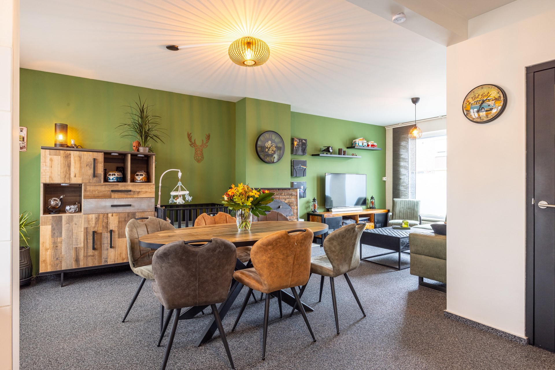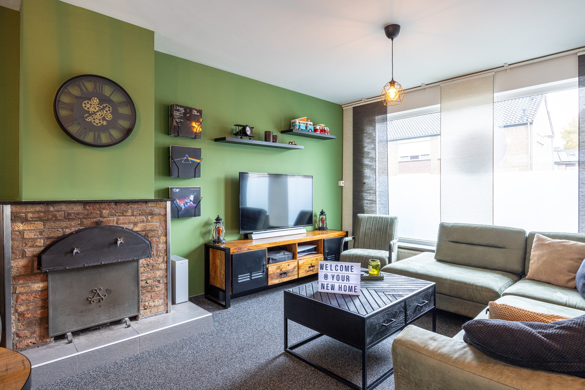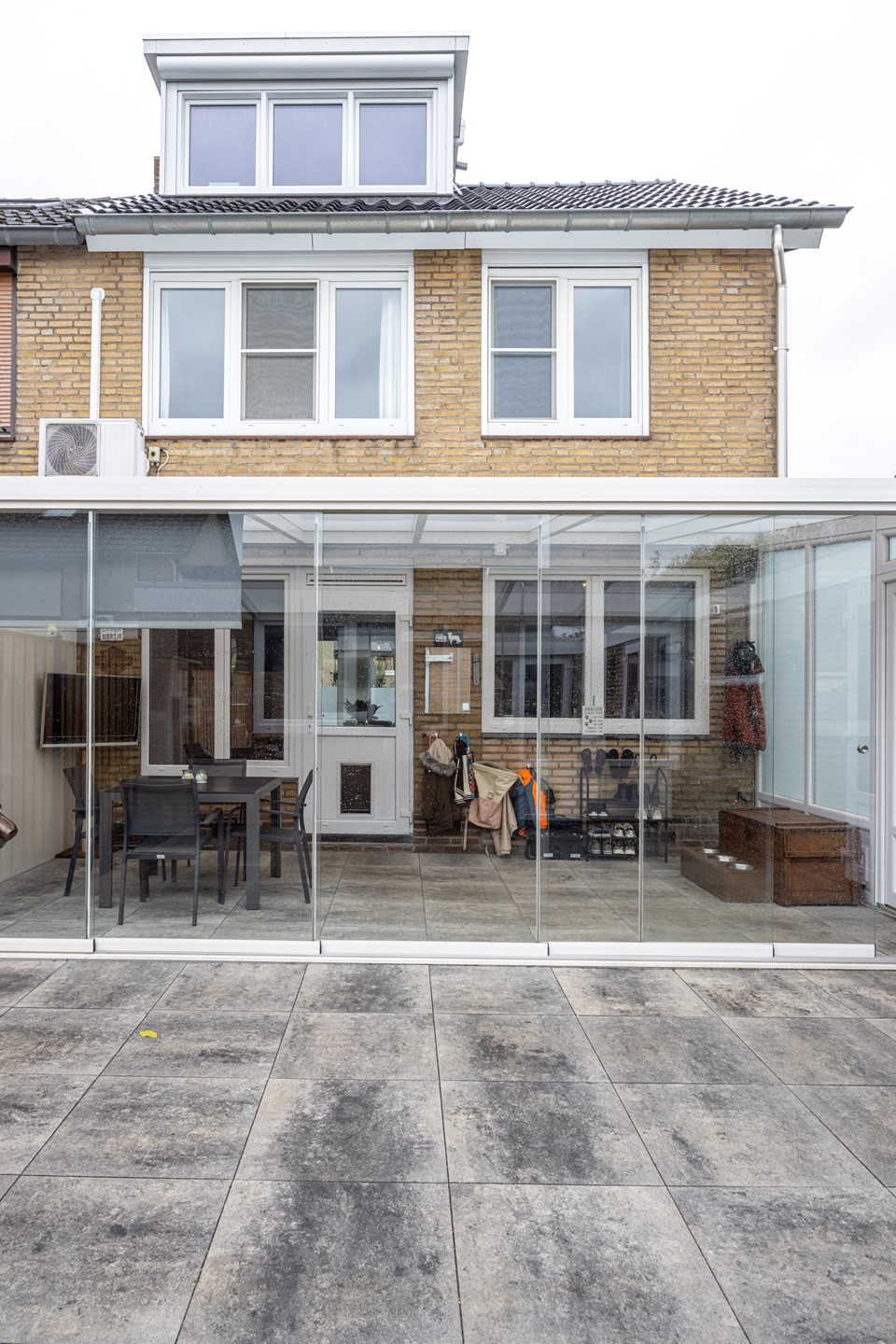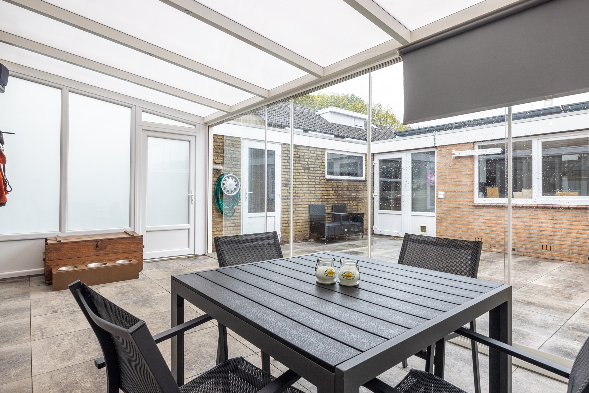 De woonkamer is een heerlijke leefruimte met veel daglicht dankzij het grote raam aan de voorzijde. De grindvloer zorgt voor een strakke en praktische basis, terwijl de airconditioning ervoor zorgt dat het hier het hele jaar door comfortabel is. De ramen zijn voorzien van HR++ en HR-dubbel glas, deels met voorzetramen en een rolluik aan de voorzijde, prettig voor zowel comfort als privacy. Aan de achterzijde is er toegang naar de tuinkamer: een gezellige extra plek waar je kunt ontspannen, borrelen of gewoon geniet van het uitzicht op de tuin.