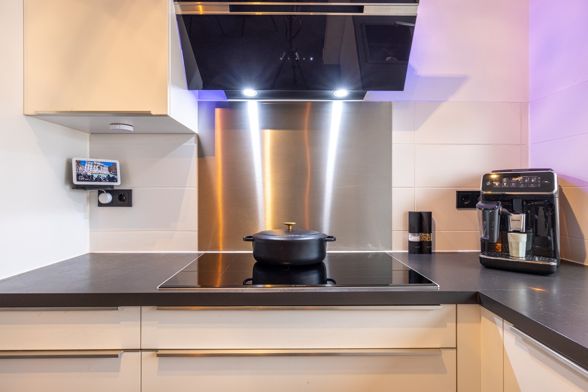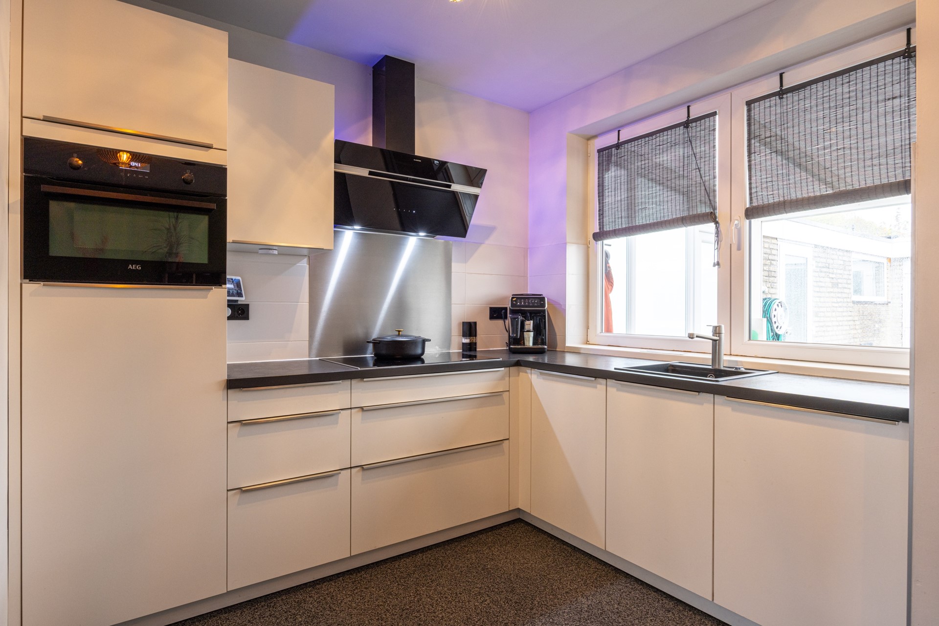 De open keuken is in 2015 vernieuwd en biedt volop kastruimte en werkblad. Gekozen is voor complete inbouwapparatuur zoals een 5-pits kookplaat met flexibele zones, een wandafzuigkap, combi-heteluchtoven, koelkast en vaatwasser. Ook hier ligt dezelfde grindvloer, wat zorgt voor een mooie, rustige eenheid.