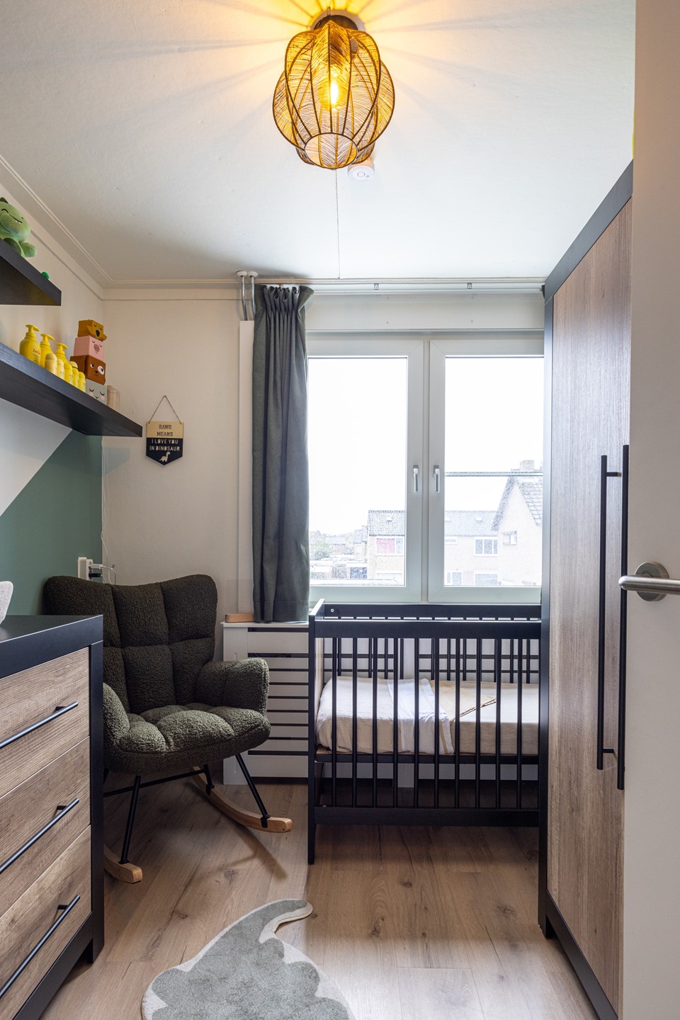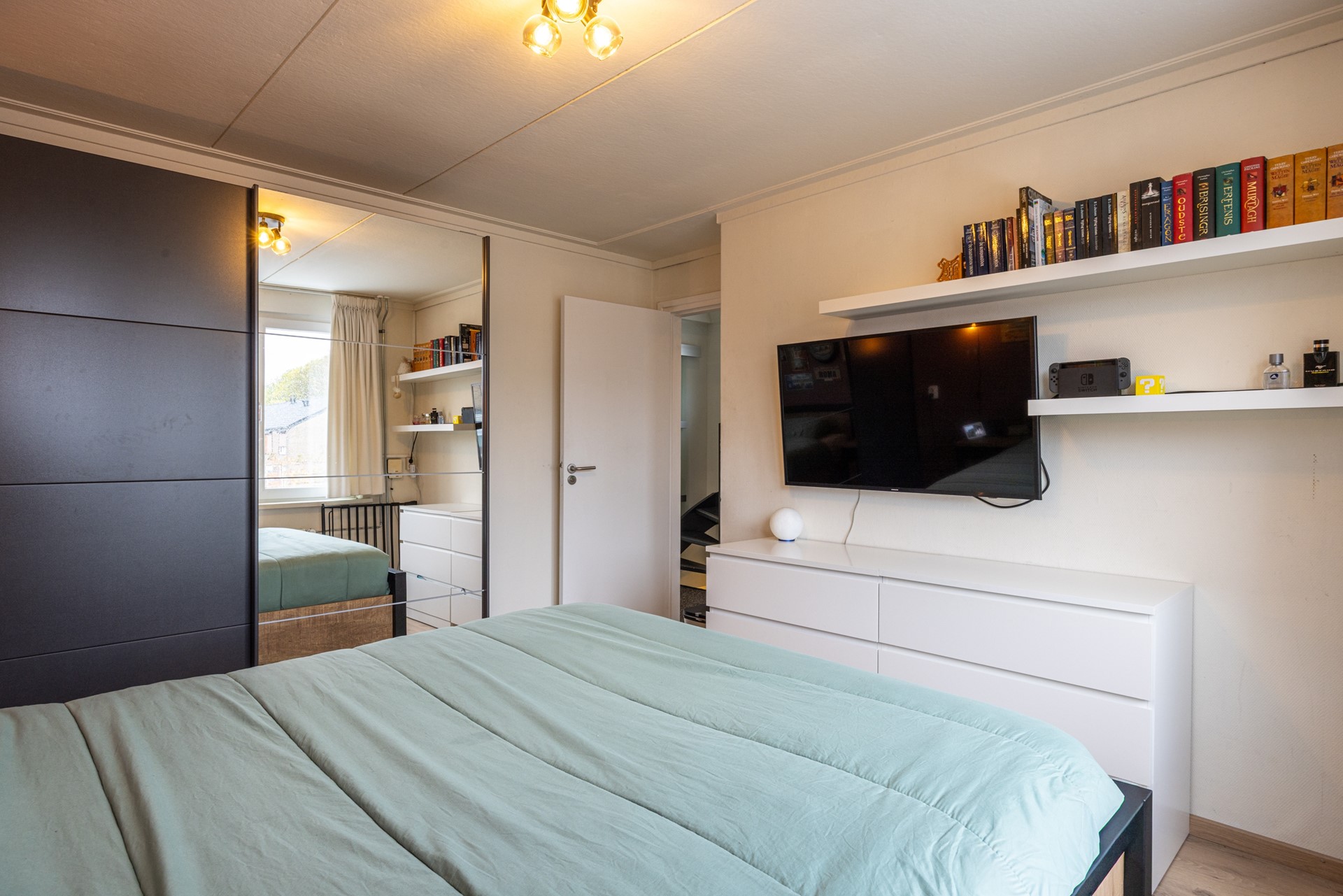 Via de vaste trap kom je op de tweede verdieping, waar een volwaardige vierde slaapkamer is gerealiseerd. Deze kamer is verrassend ruim dankzij de dakkapel, die niet alleen extra woonruimte creëert maar ook zorgt voor veel daglicht. Het rolluik maakt het mogelijk om de kamer volledig te verduisteren, ideaal voor een goede nachtrust of als je de ruimte gebruikt als werkplek.