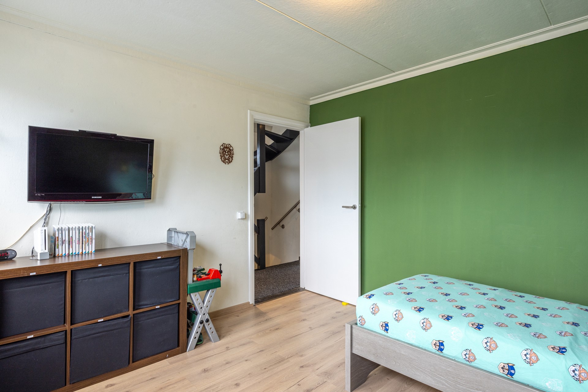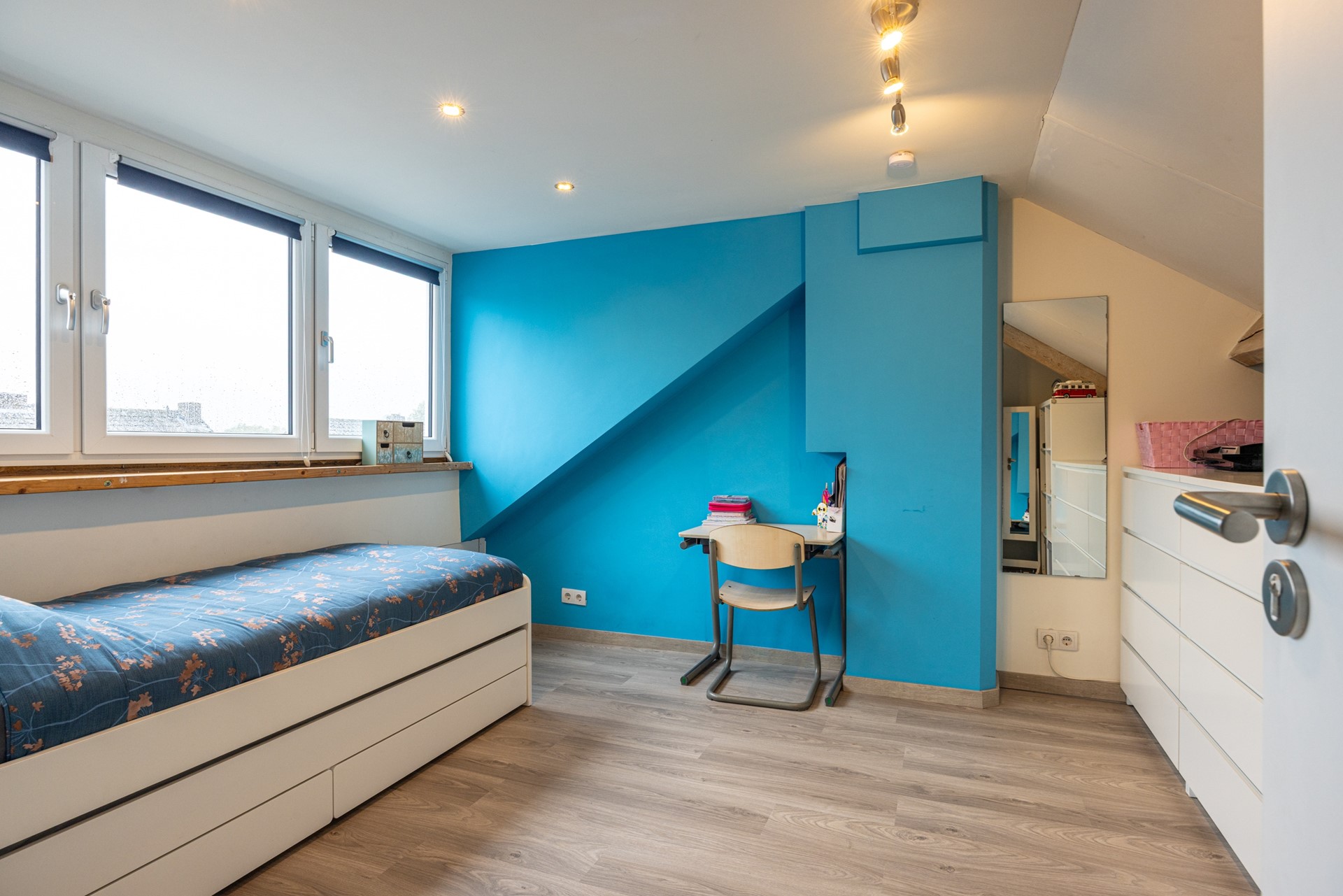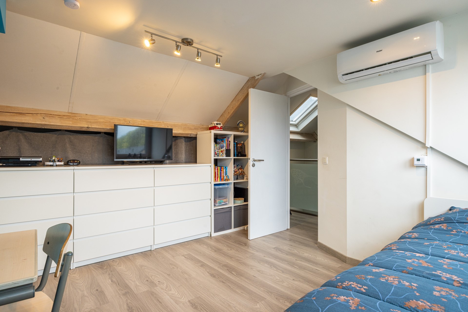 Er ligt een nette laminaatvloer en ook hier is een airco-installatie aanwezig, zodat het in elk seizoen comfortabel blijft. Deze verdieping biedt tal van gebruiksmogelijkheden: van tienerkamer tot logeerplek, werkkamer of hobbyruimte. Dankzij de vaste trap voelt dit echt als een volledige extra woonlaag.