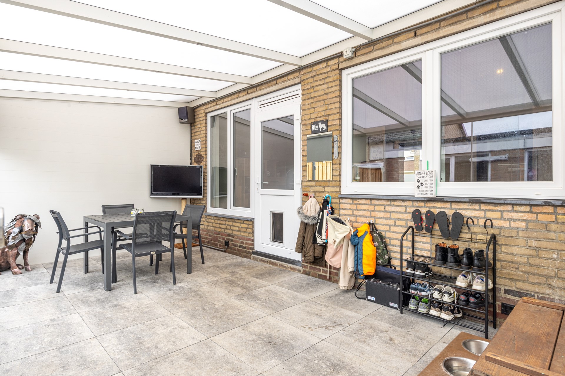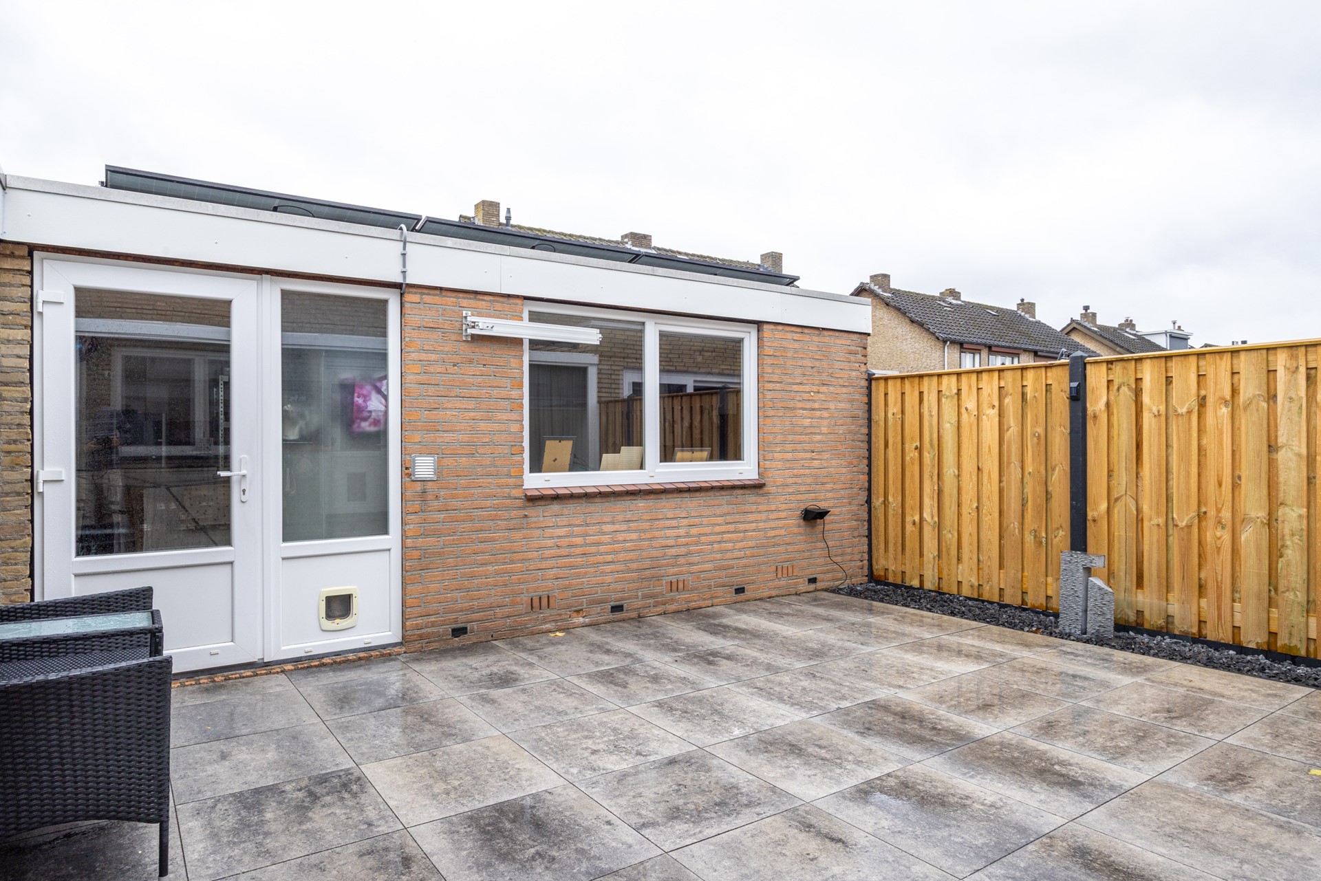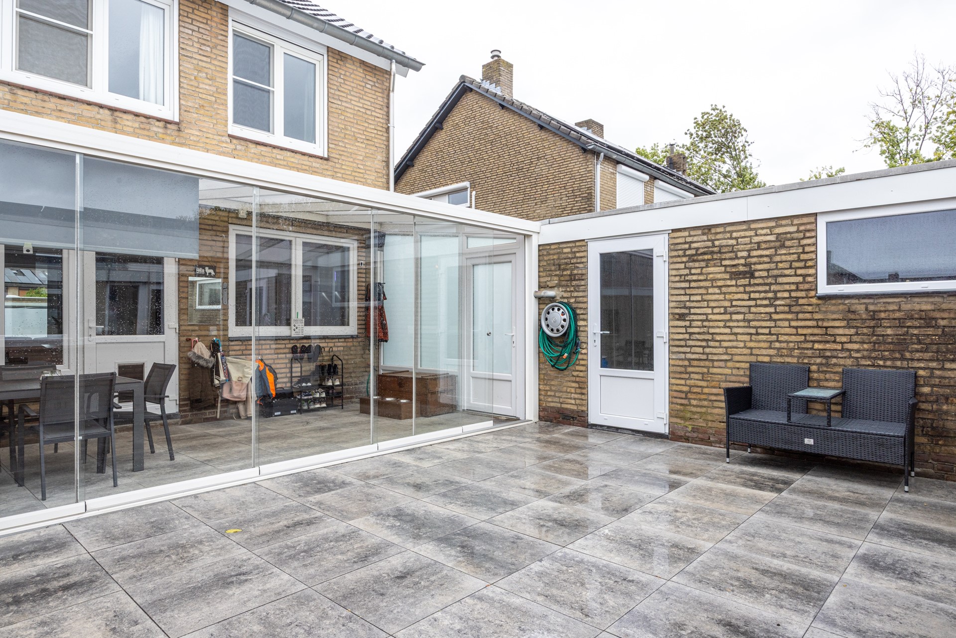 De achtertuin is onderhoudsvriendelijk aangelegd en beschikt over een royaal betegeld terras. Tegelijkertijd biedt de tuin voldoende ruimte om deze naar eigen wens aan te kleden met beplanting, waardoor je er eenvoudig een groene en sfeervolle buitenruimte van kunt maken. De tuin is diep en volledig omsloten, wat zorgt voor veel privacy. Onder de ruime overkapping kun je zelfs bij minder mooi weer heerlijk buiten zitten en wordt het buitenleven een verlengstuk van je woonkamer.