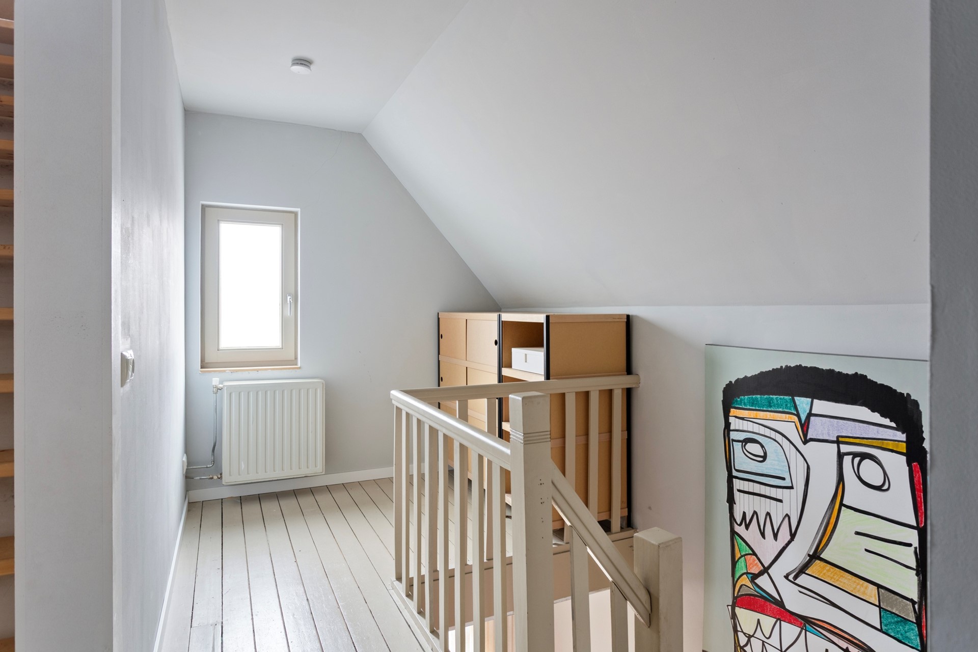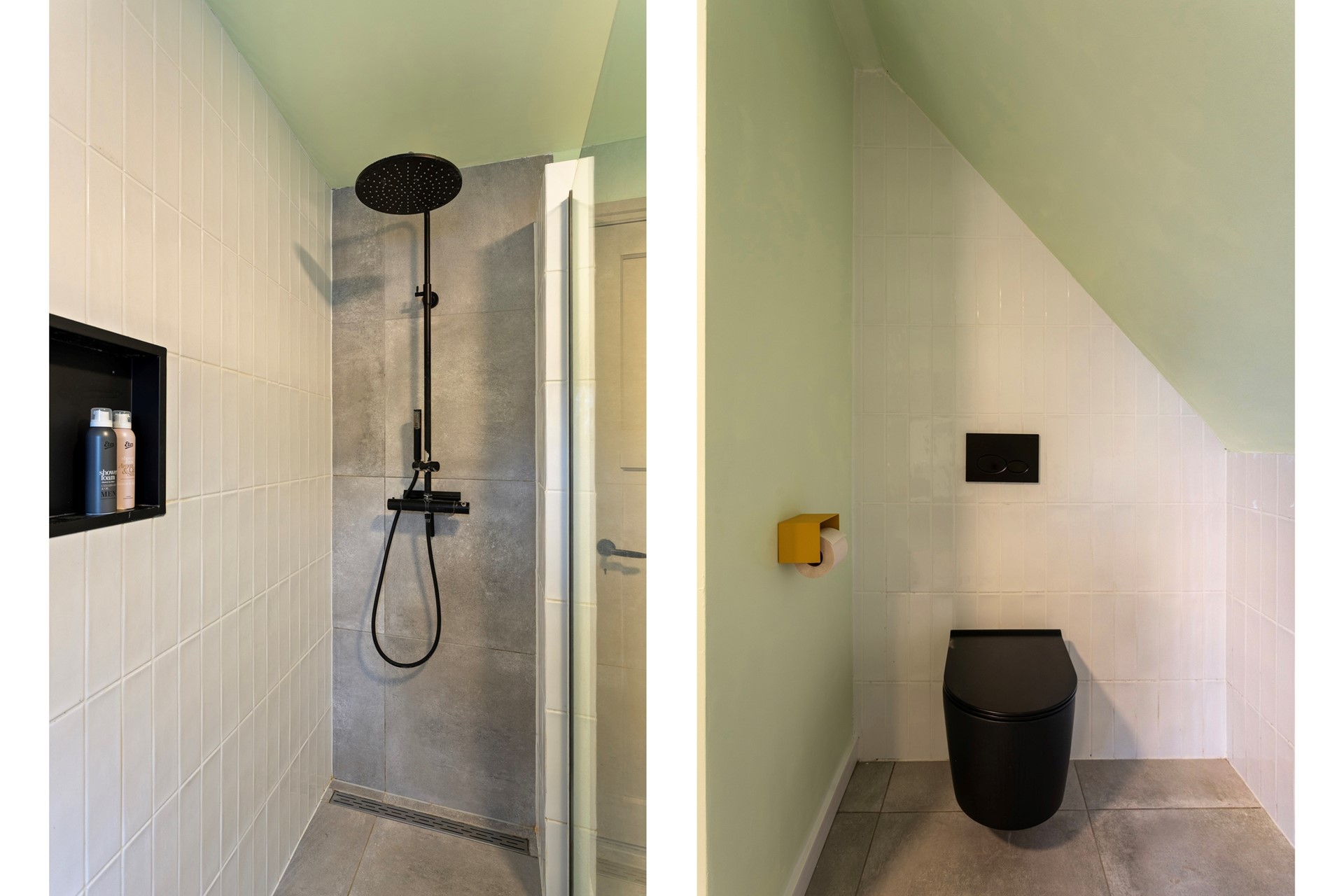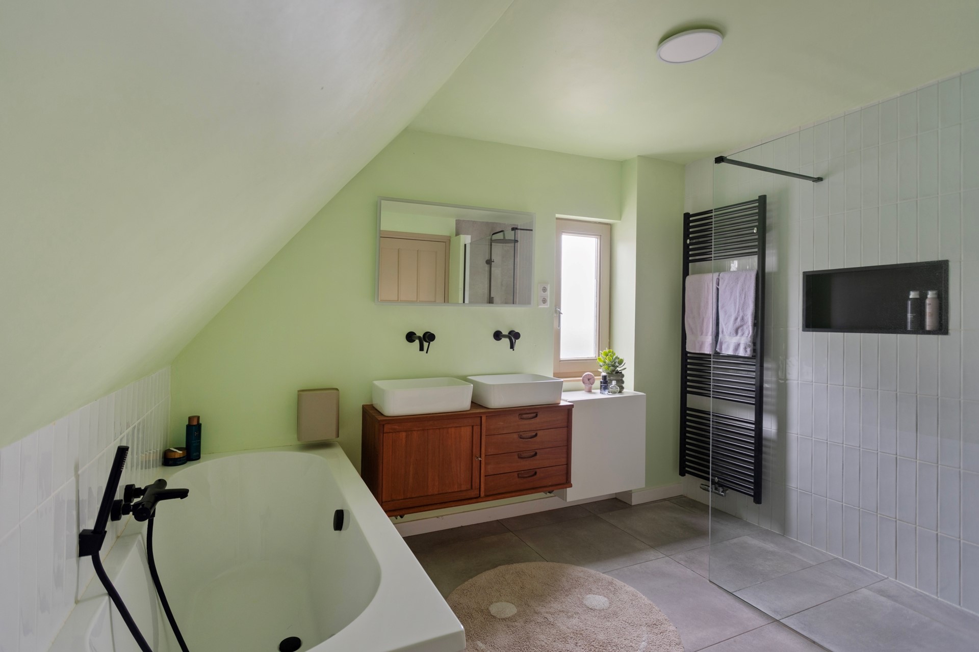 Op de eerste verdieping bevinden zich de fraaie overloop, 2 slaapkamers en de moderne badkamer. De overloop en slaapkamers zijn afgewerkt met een plankenvloer en de slaapkamers zijn respectievelijk circa 12 en 11 m² groot. De moderne en complete badkamer (ca. 8 m²) is voorzien van een ligbad, grote inloopdouche, badkamermeubel met twee wastafels, wandcloset en een designradiator.