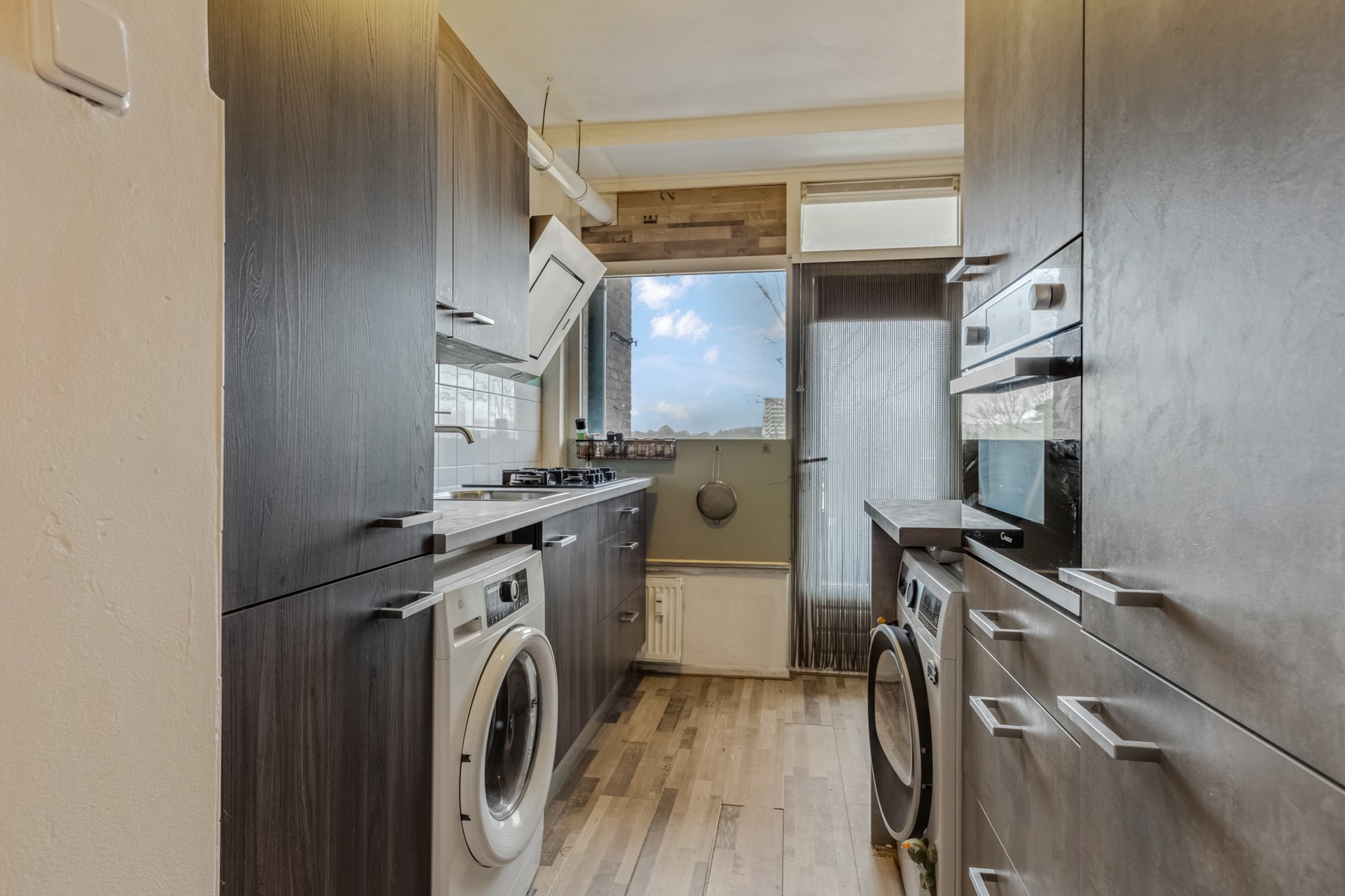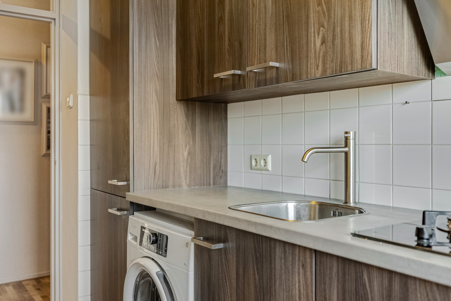 Dit appartement beschikt over een ruime woonkamer, voorzien van een pvc klikvloer. Dankzij de grote raam partijen is de woonkamer licht en kijkt u heerlijk weg. De keuken is in parralel opstelling en voorzien van inbouwapparatuur zoals koelvriezer, 5 pits gaskookplaat, combi-oven. Op de plek van de wasdroger kan eventueel een vaatwasser geplaatst worden. De woonkamer is tevens voorzien van glad stucwerk op muren en plafond.