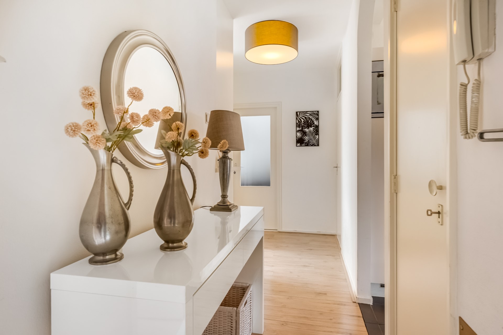 Het appartement zelf is gelegen op de eerste verdieping. Bij binnenkomst heeft u direct toegang tot alle ruimtes via de hal die voorzien is van een mooie houten laminaatvloer.