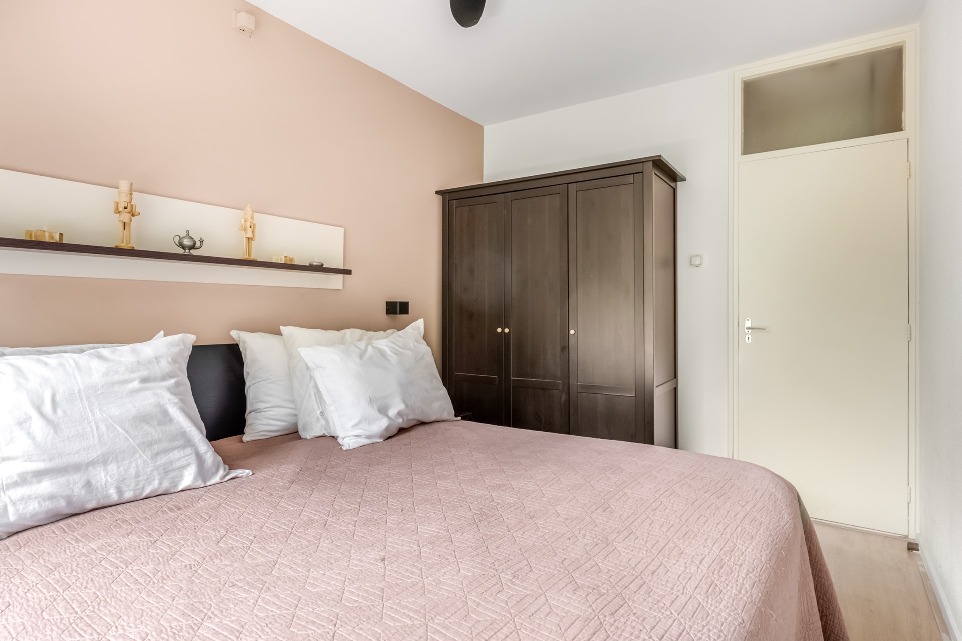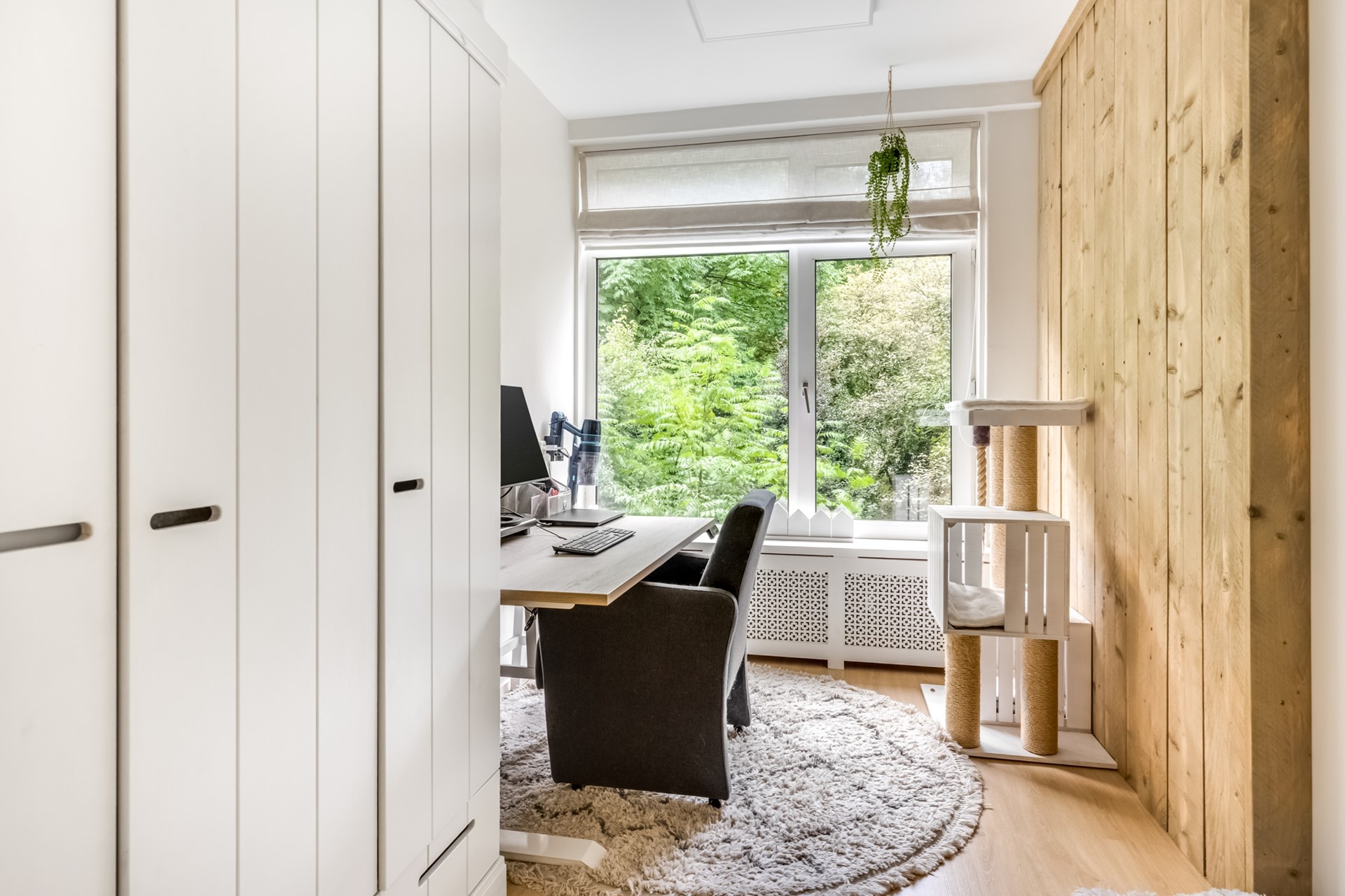 Aan de achterzijde van het appartement bevinden zich twee ruime en lichte slaapkamers, beide zeer netjes afgewerkt met draai-/kiepramen en nette pvc vloer. 1 slaapkamer die nu dienst doet als kantoor is voorzien van infrarood verwarming.