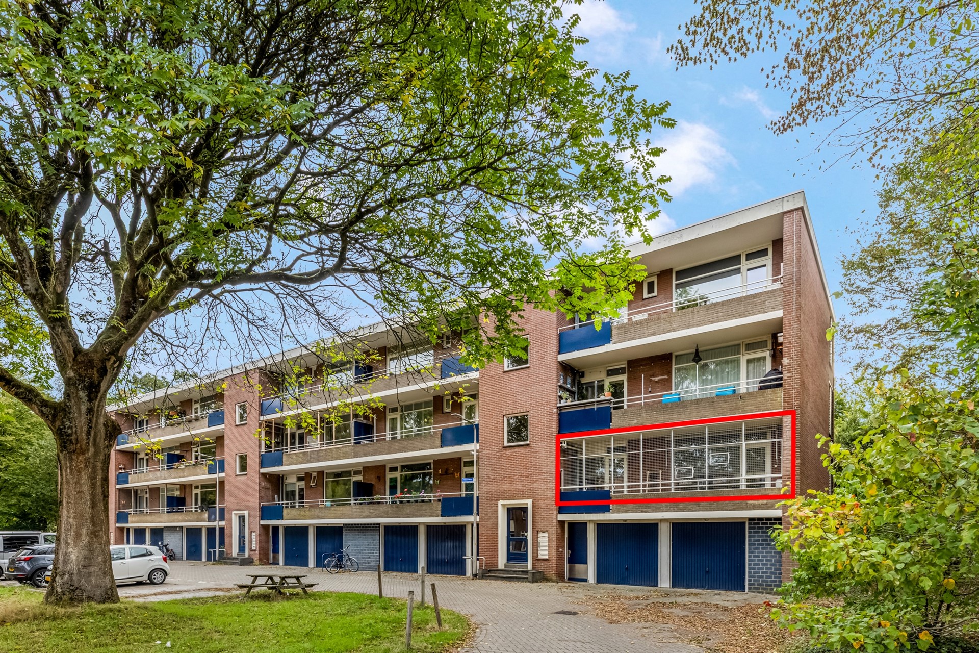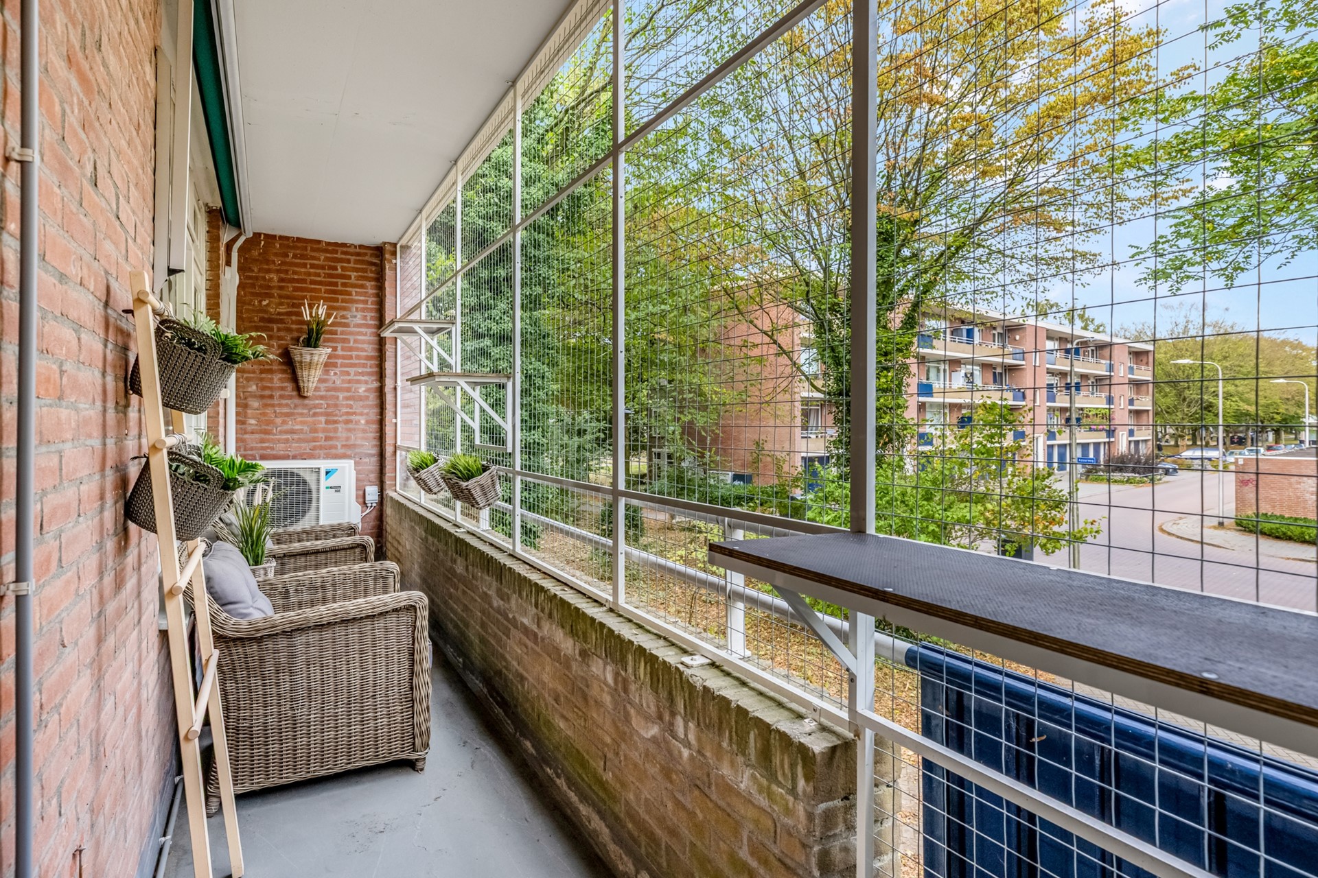 Vanuit de woonkamer en de keuken kunt u het grote balkon bereiken. Het balkon is voorzien van een elektrisch zonnescherm in donkergroene stof en een ijzeren beveiliging voor kat of hond.
