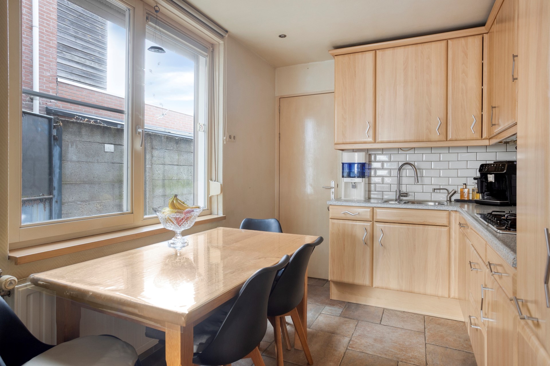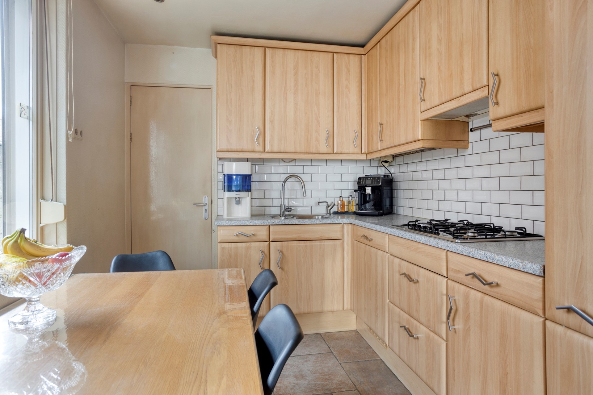 De halfopen keuken sluit mooi aan op de woonkamer en biedt volop werk- en bergruimte. De houtkleurige fronten en het hittebestendige werkblad geven de ruimte een warme uitstraling. De keuken is uitgerust met een 5-pits gasfornuis met wokbrander, koelkast, vaatwasser, afzuigkap, quooker en een spoelbak met uittrekbare kraan. Er is ruimte voor een kleine eettafel en via de keuken bereik je de ruime kelder waar zich tevens de meterkast bevindt.