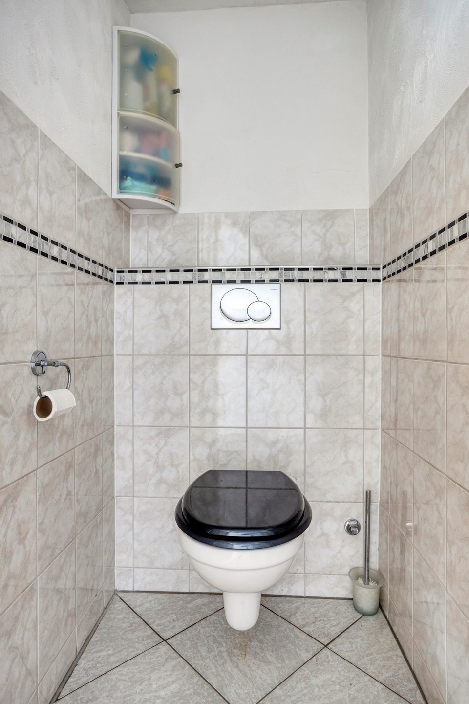 Aansluitend vind je een praktische bijkeuken. Deze is recent geschilderd en voorzien van een grote voorraadkast met schuifdeur. Hierachter bevinden zich ook de aansluitingen voor wasmachine en droger. De blauwe tegelvloer loopt door in het separate toilet. Vanuit de bijkeuken loop je door naar de badkamer.
