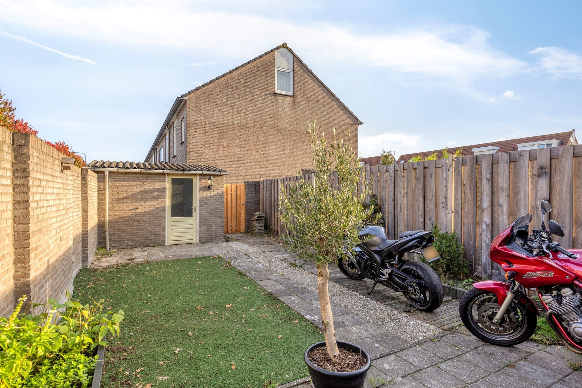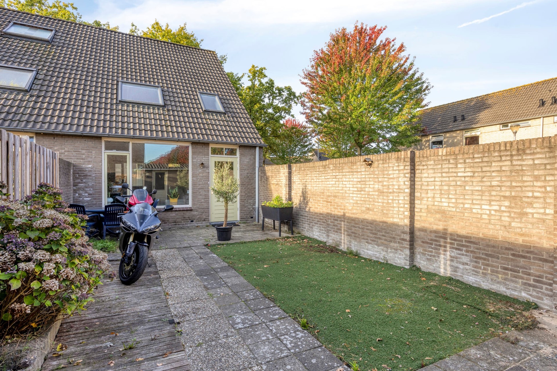 De achtertuin is gelegen op het noorden en voorzien van sierbestrating. Achter in de tuin vindt u een achterom met nieuwe poort en een stenen berging.