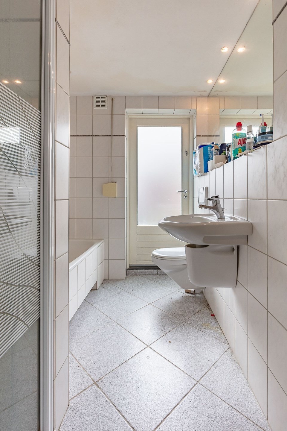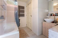 De toegang tot de eerste verdieping is te vinden via de hal/entree en de woonkamer, waardoor het gemakkelijk bereikbaar is. De overloop leidt naar twee slaapkamers, waarbij de achterste slaapkamer is uitgerust met een handig wastafelmeubel en een aansluiting voor wasapparatuur. De badkamer is volledig betegeld en beschikt over een douchecabine, een ligbad, een wastafel en een zwevend toilet. Wat dit vertrek extra bijzonder maakt, is de directe toegang tot het zonnige dakterras vanuit de badkamer.