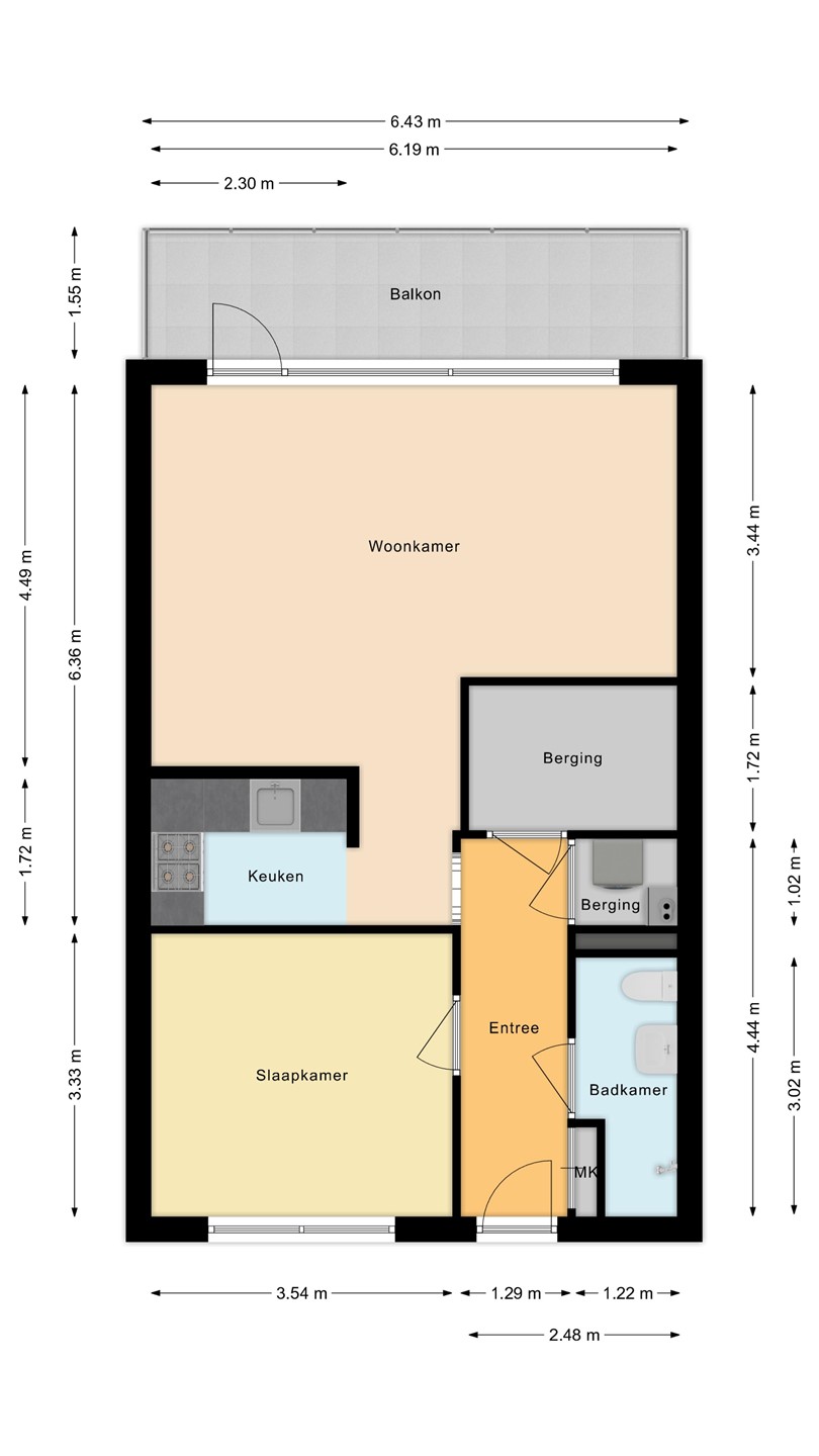 Wanneer je de voordeur van het appartement opent, kom je terecht in de nette hal. Hier spot je meteen de nette laminaat vloer die doorgetrokken is in het gehele appartement. De hal biedt toegang tot de meterkast, ruime slaapkamer, betegelde badkamer met douche, toilet en wastafel, stookruimte met Cv-ketel en aansluiting wasmachine. Tenslotte bevind zich in de hal een kamer die gebruikt kan worden als bergruimte of eventueel als werkplek. Via de hal bereik je de aangenaam ruime en lichte woonkamer van het appartement.