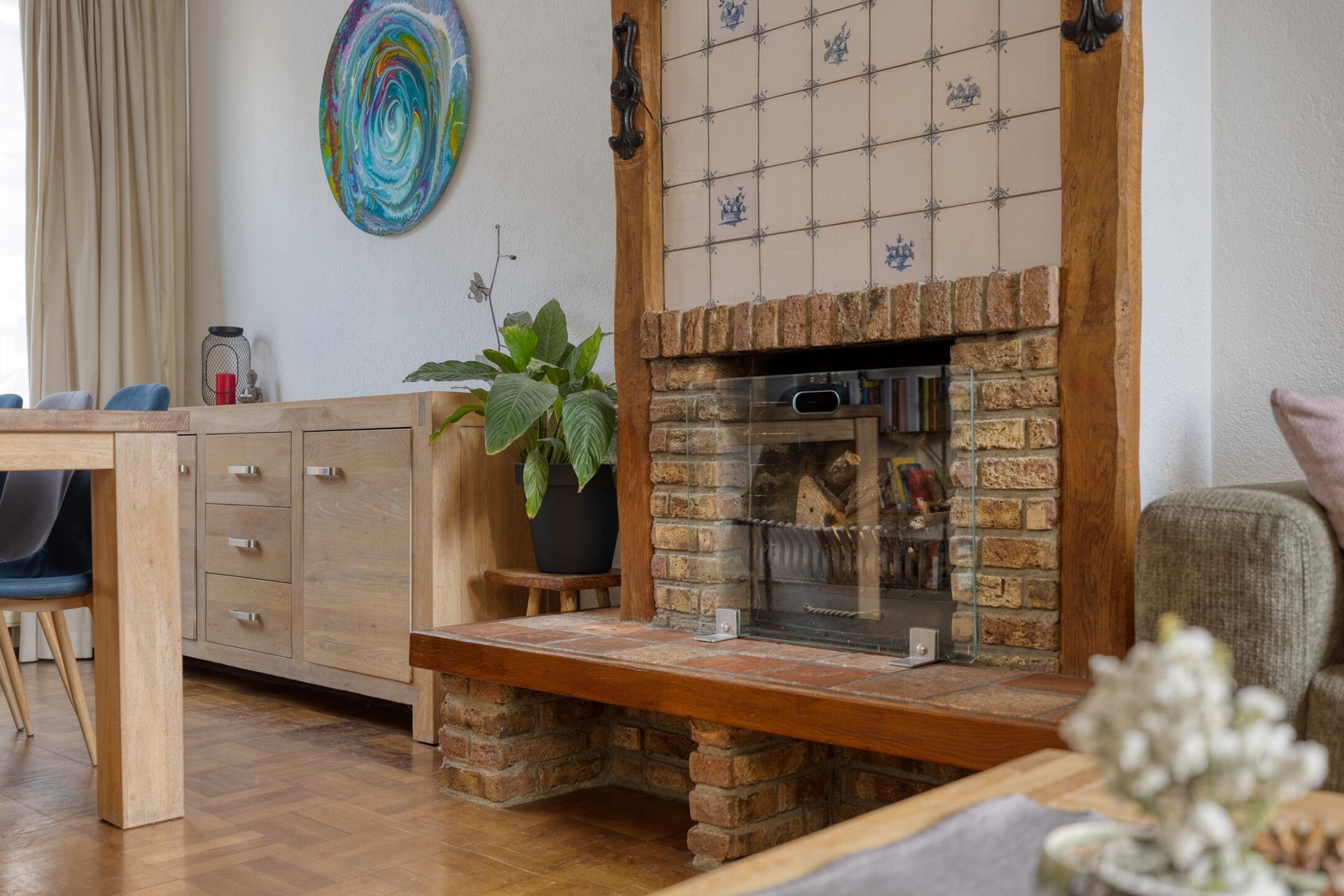 De woonkamer ademt de charme van de jaren ’30 met een parketvloer en een knusse schouw met open haard (deze is niet in gebruik geweest door de huidige bewoner). Dankzij de grote ramen aan zowel de voor- als achterzijde valt er heerlijk veel daglicht binnen. De trap naar de eerste verdieping is stijlvol geïntegreerd in de woonkamer wat zorgt voor een open en ruimtelijk gevoel. Vanuit de woonkamer loop je direct door naar de ruime, halfopen keuken — een fijne overgang die zorgt voor een gezellige verbinding tussen wonen en koken.